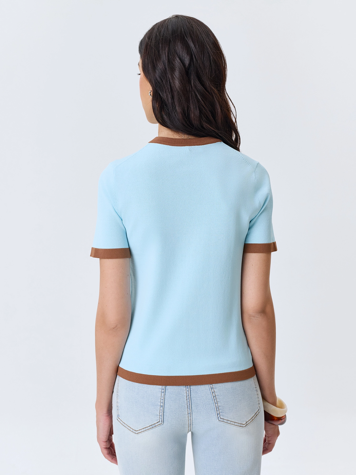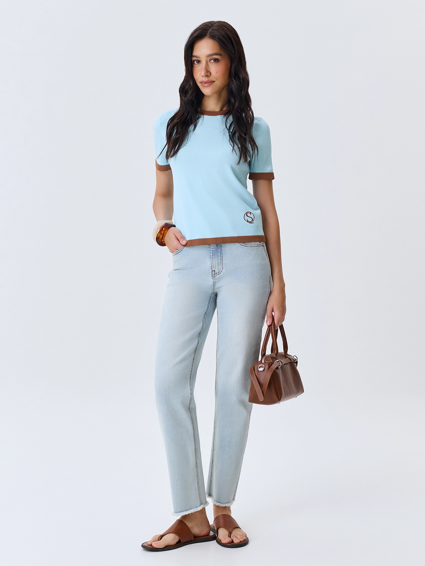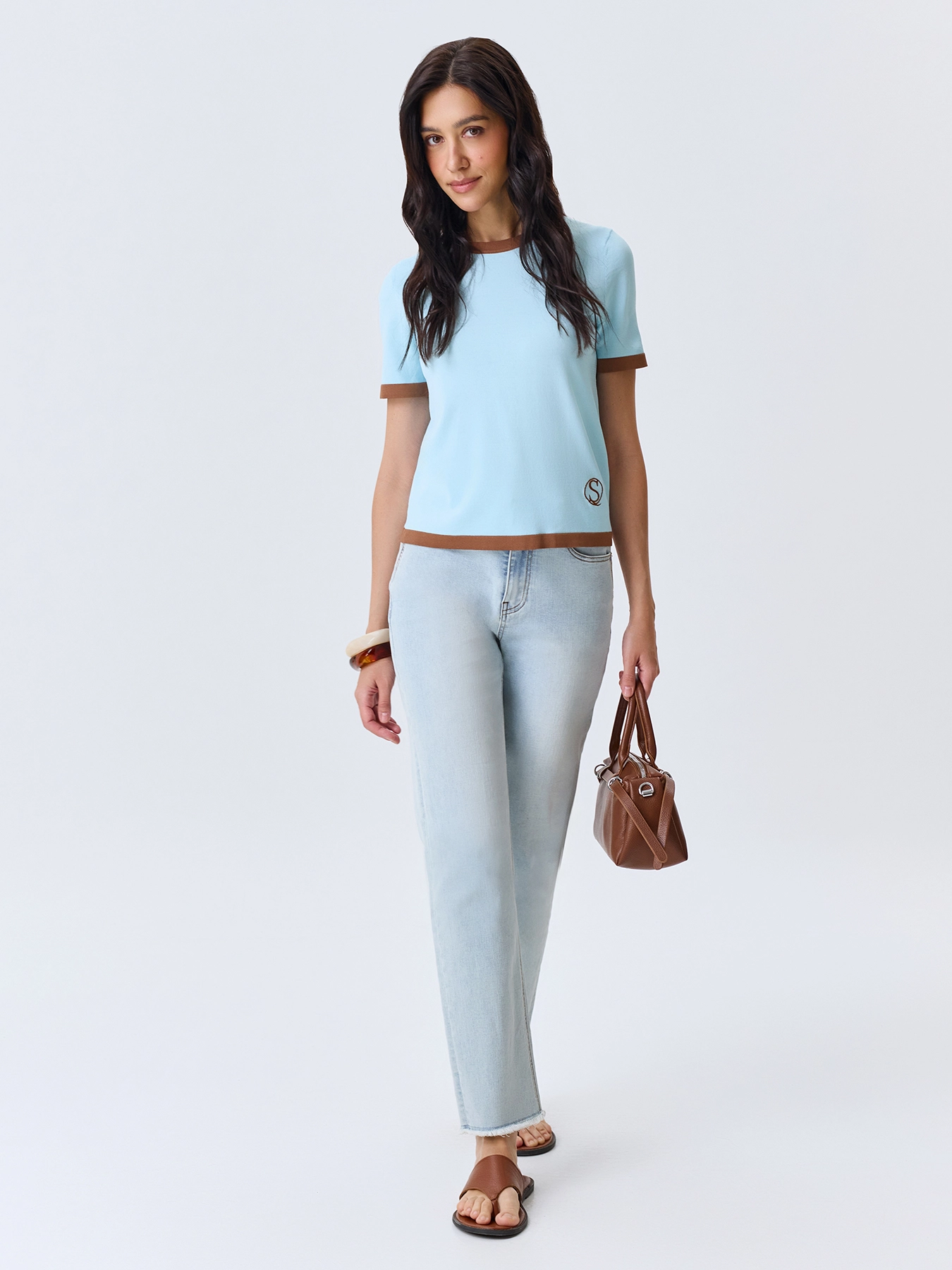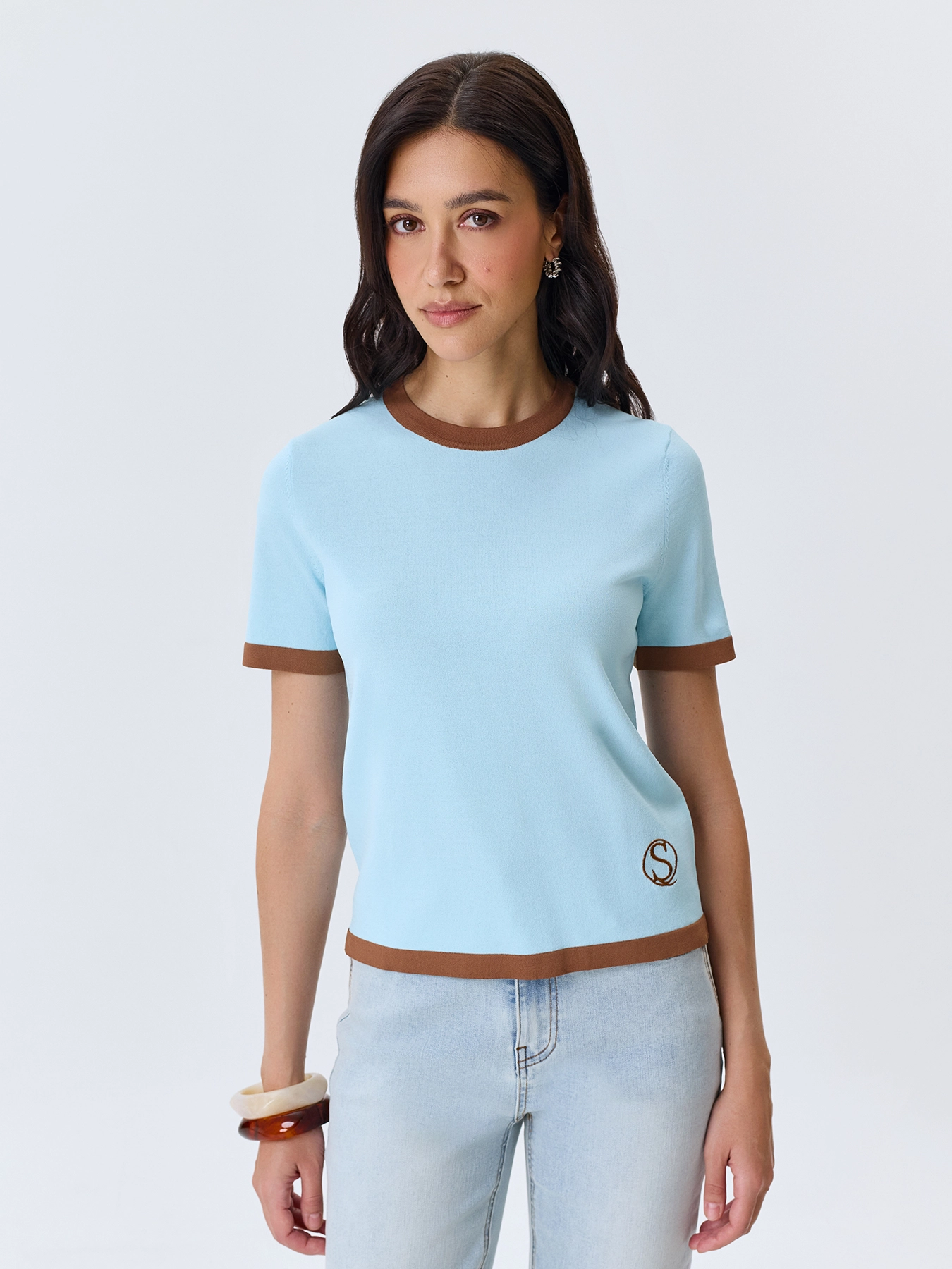 Вязаная футболка прямого силуэта. Круглый вырез. Короткие втачные рукава. Дополнен контрастным кантом по горловине, низу изделия и рукавов. Дополнен контрастной вышивкой. В составе вискоза и нейлон.