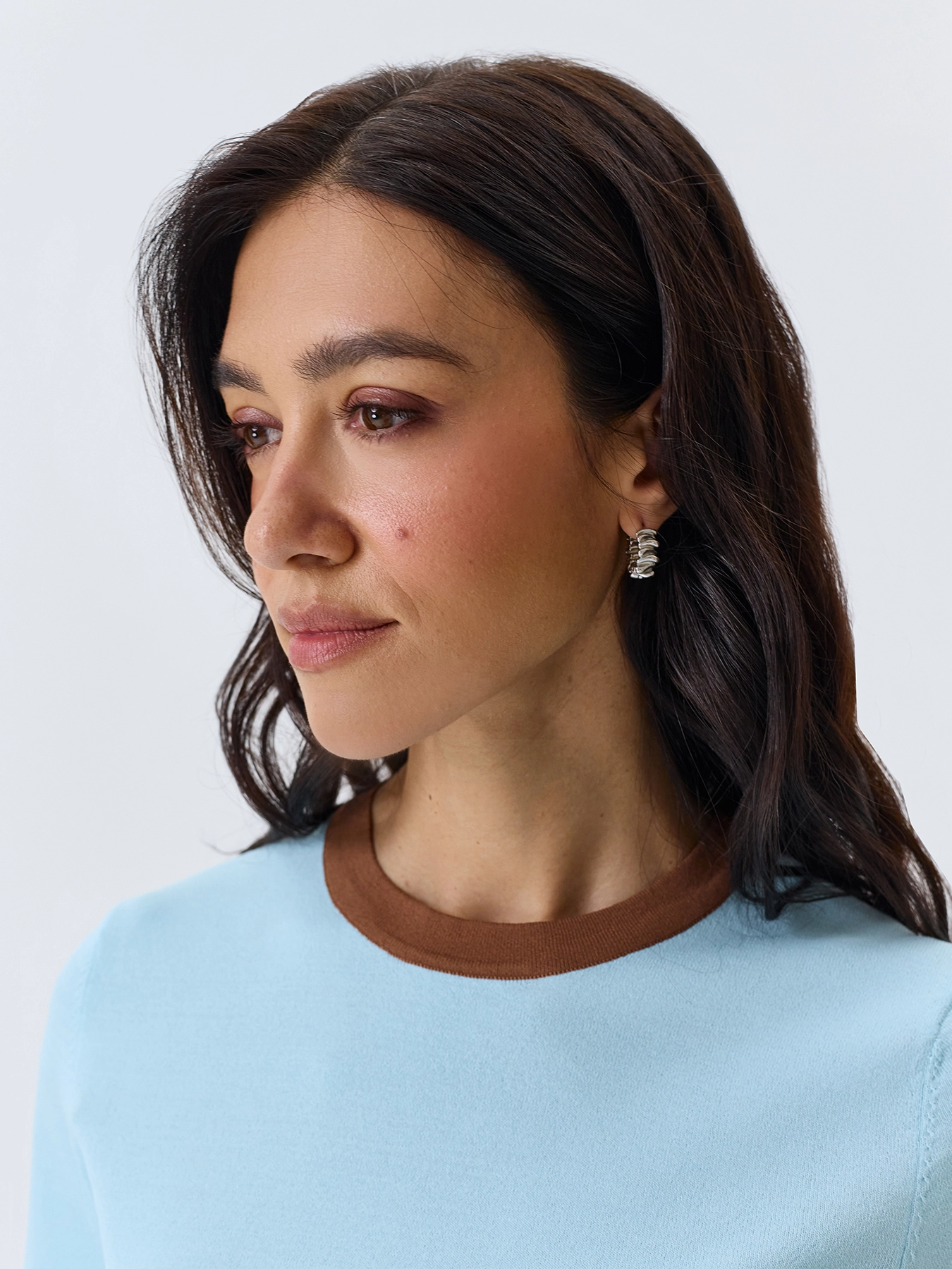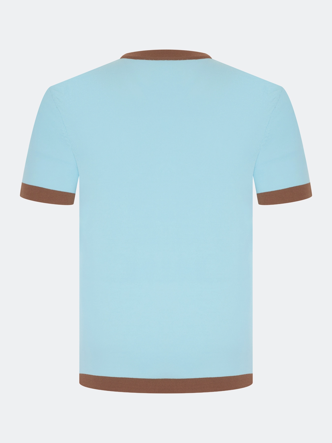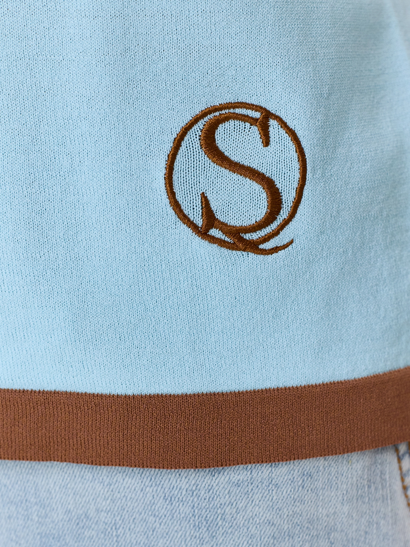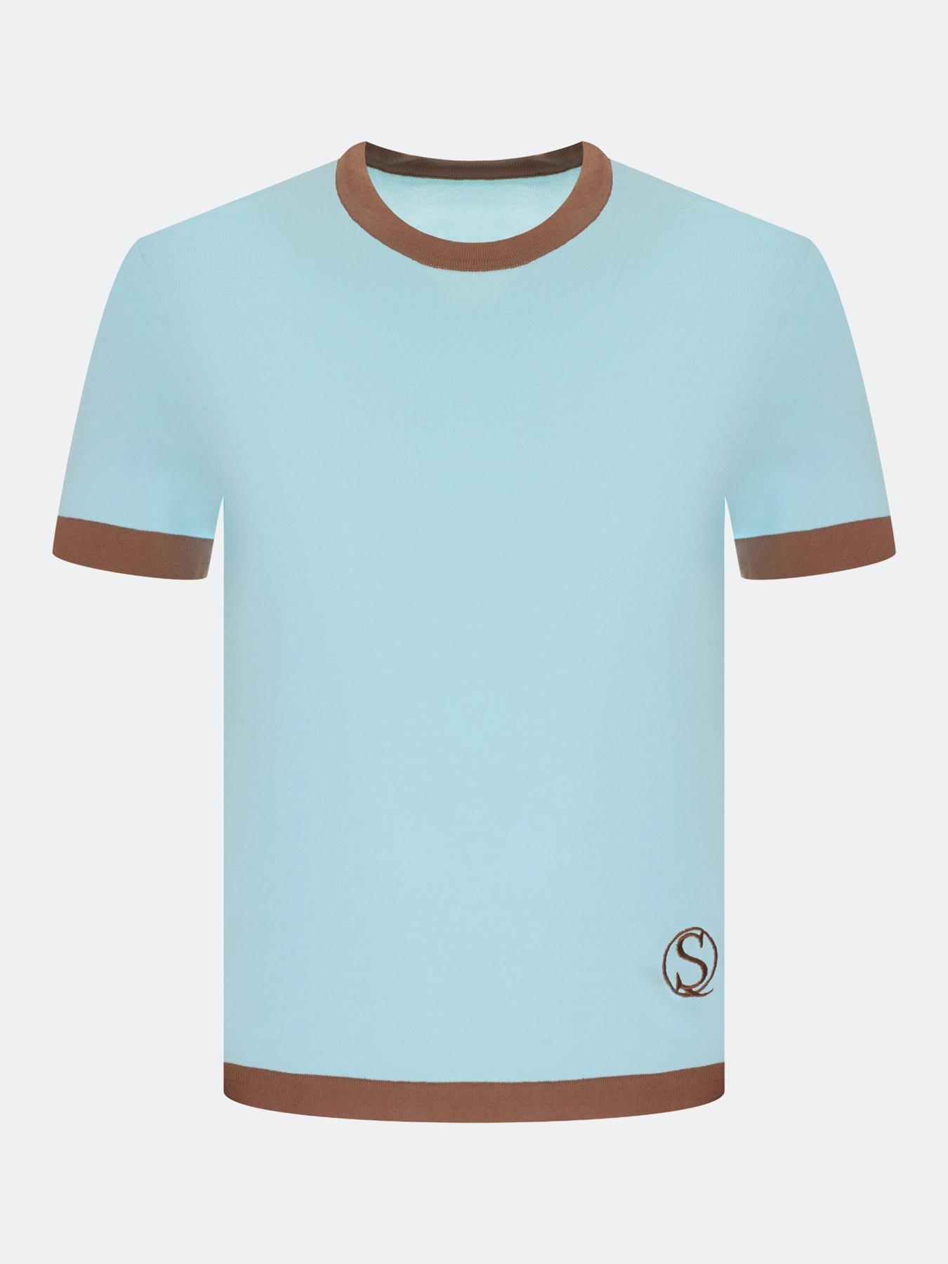 Вязаная футболка прямого силуэта. Круглый вырез. Короткие втачные рукава. Дополнен контрастным кантом по горловине, низу изделия и рукавов. Дополнен контрастной вышивкой. В составе вискоза и нейлон.