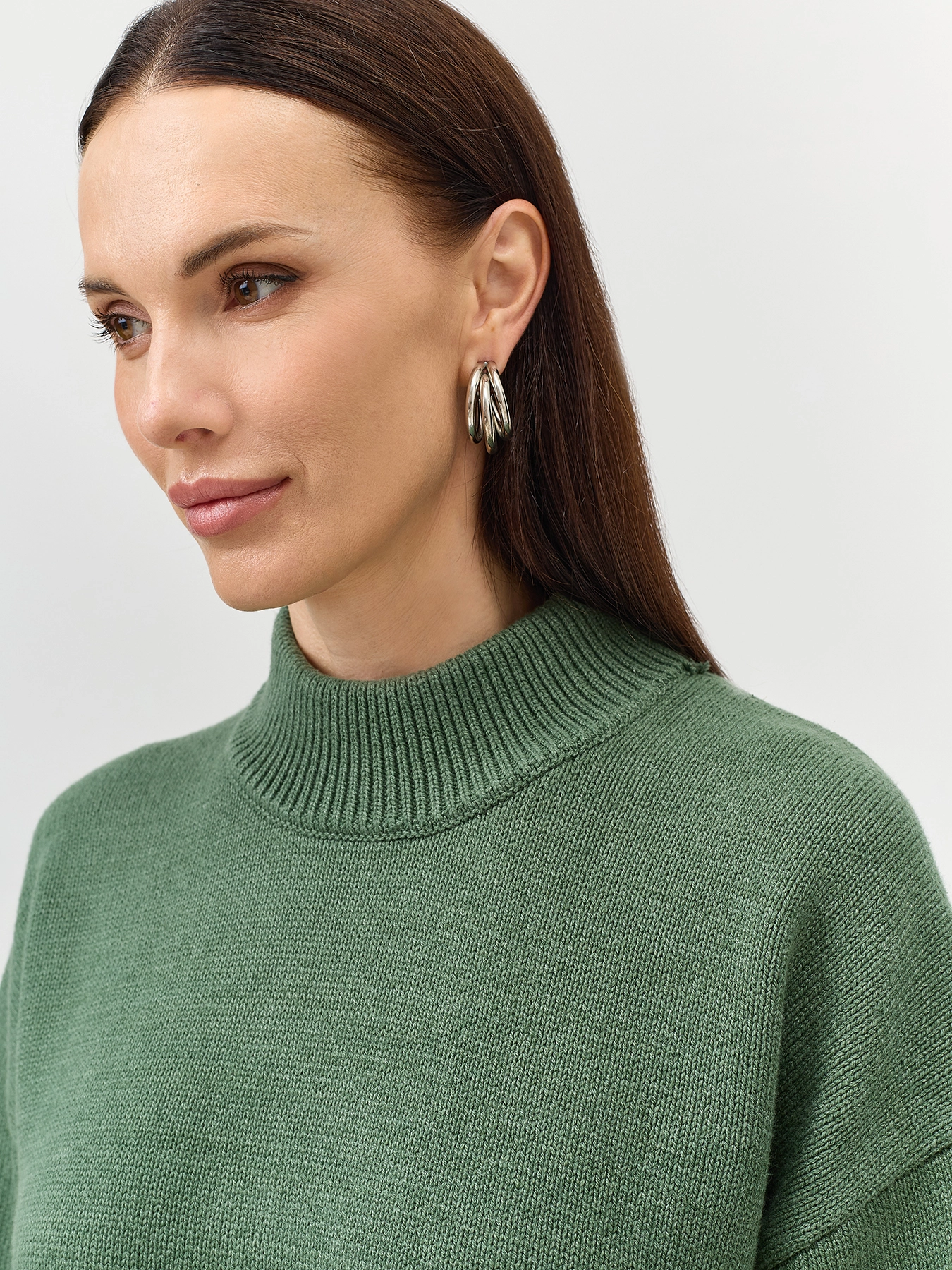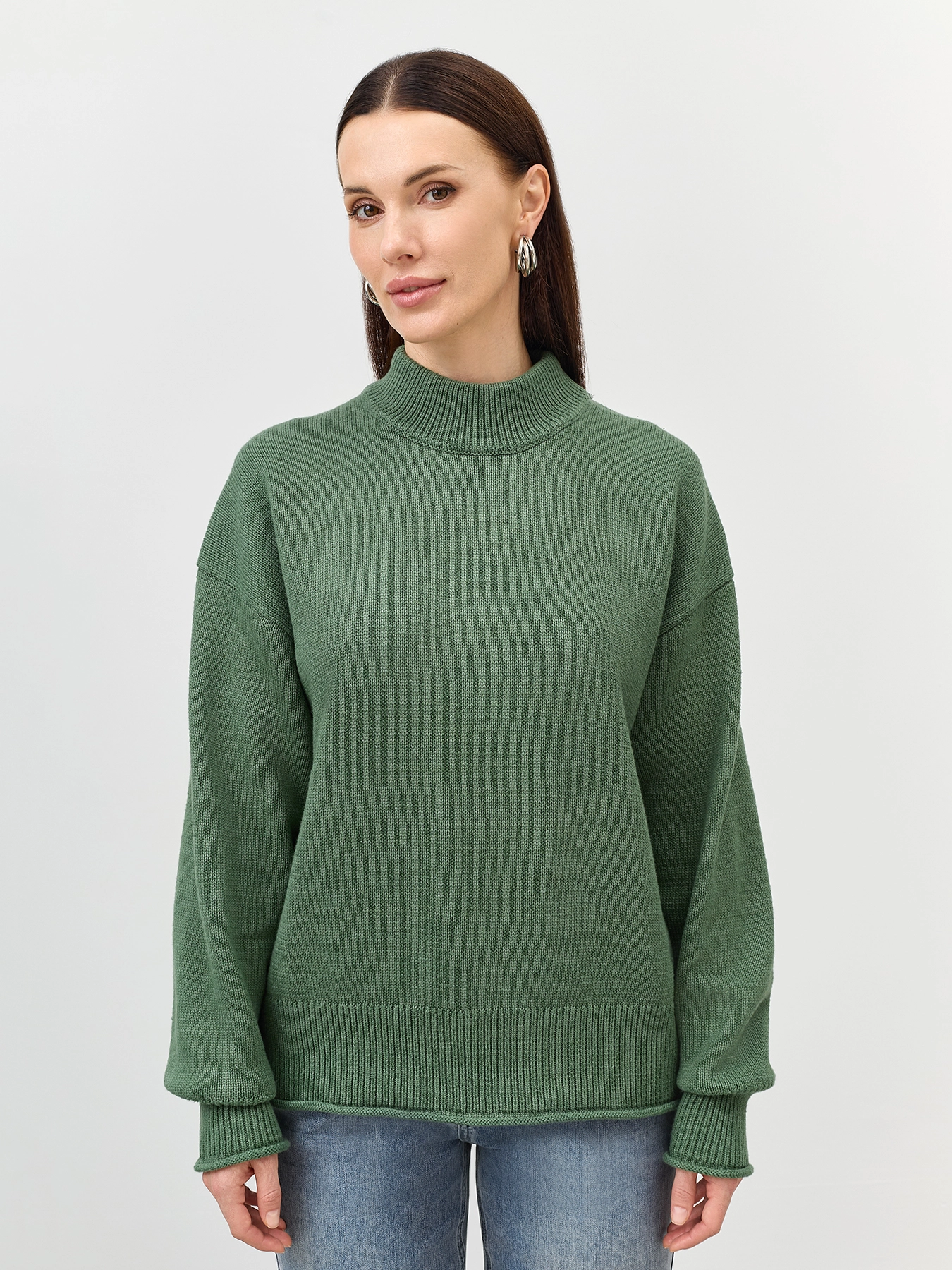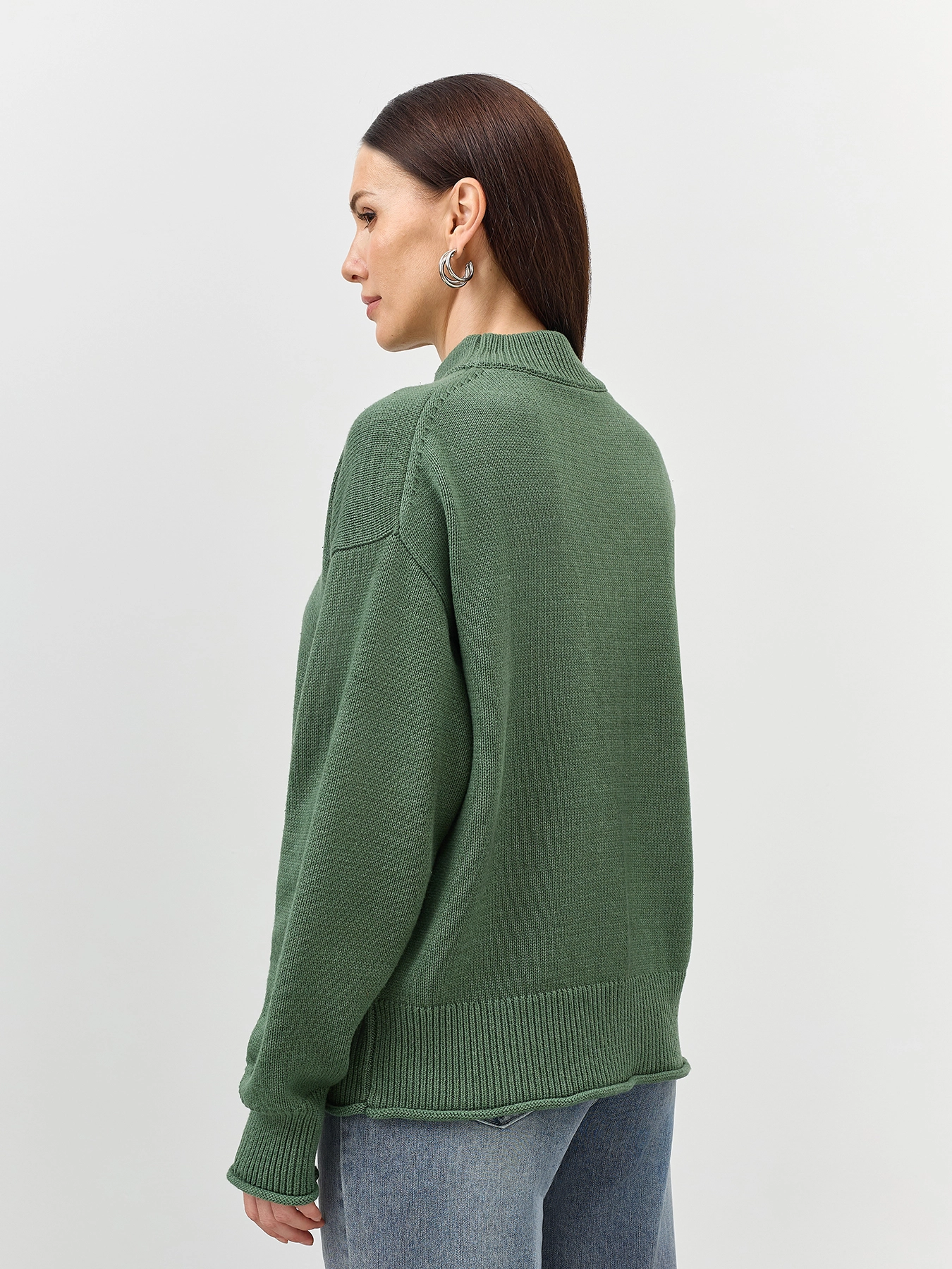 Яркий вязаный джемпер из смесового хлопка. Свободный силуэт. Круглый вырез. Спущенная линия плеч. Риб по горловине. Декоративный риб по низу рукавов и изделия.