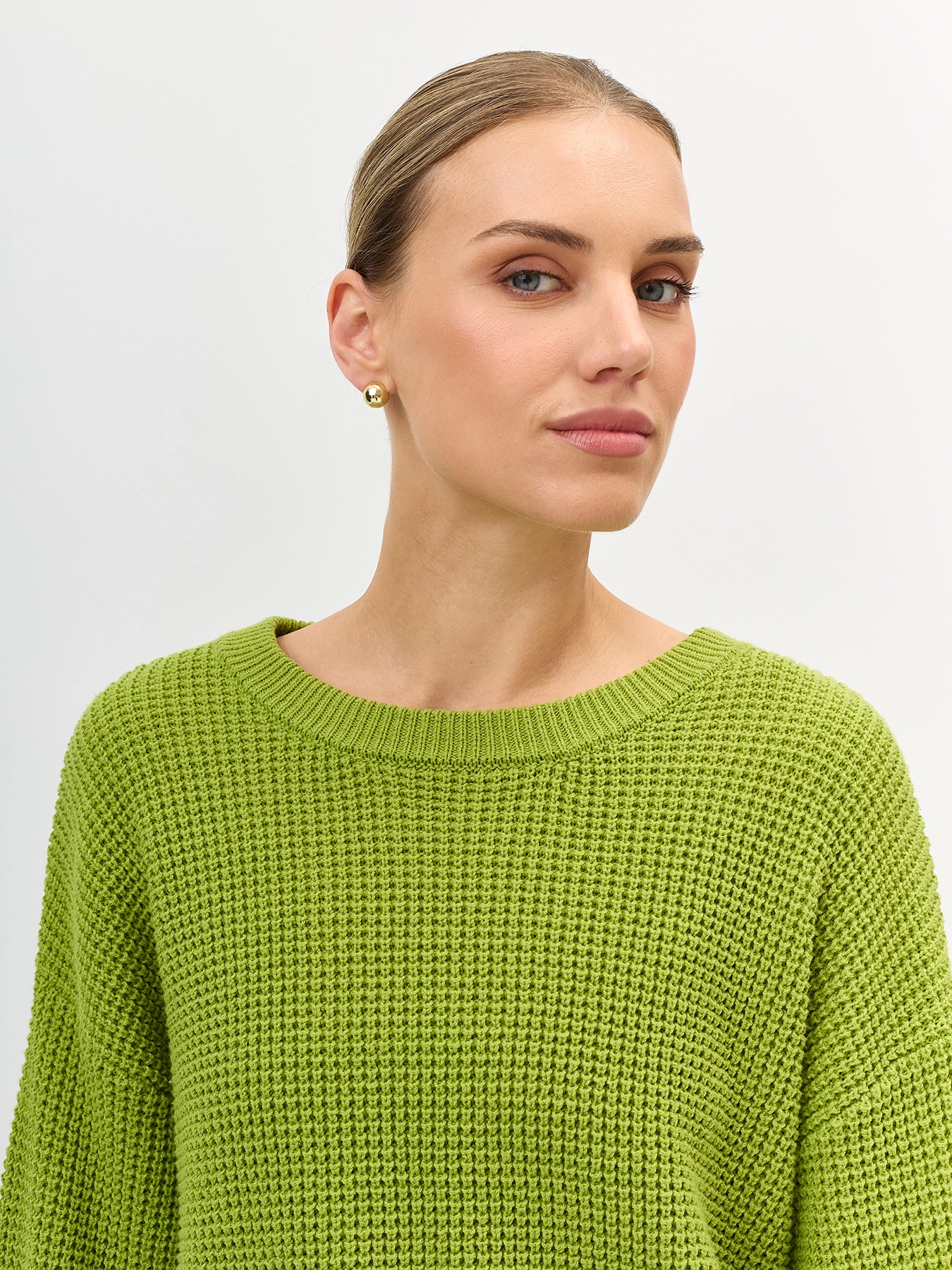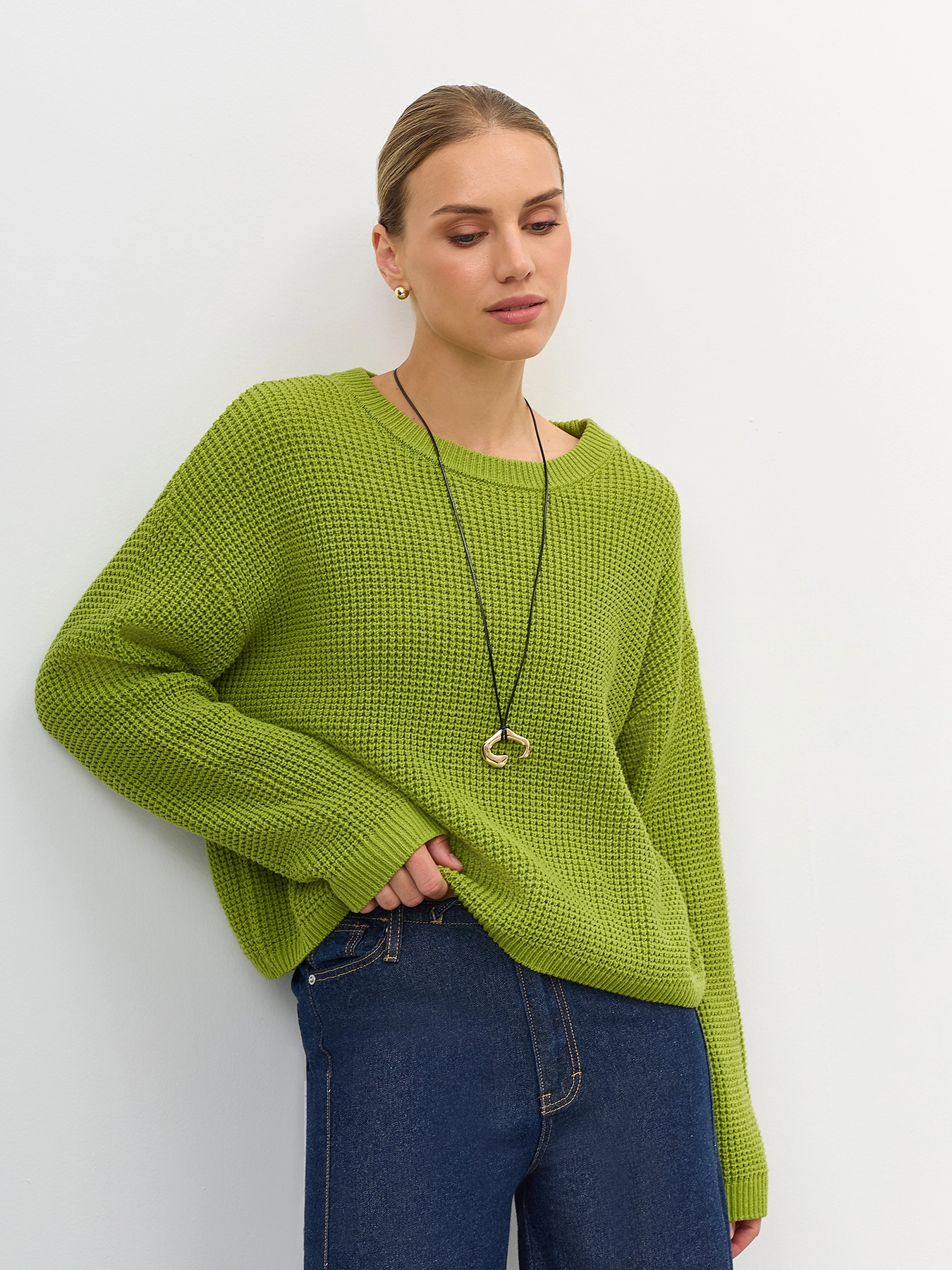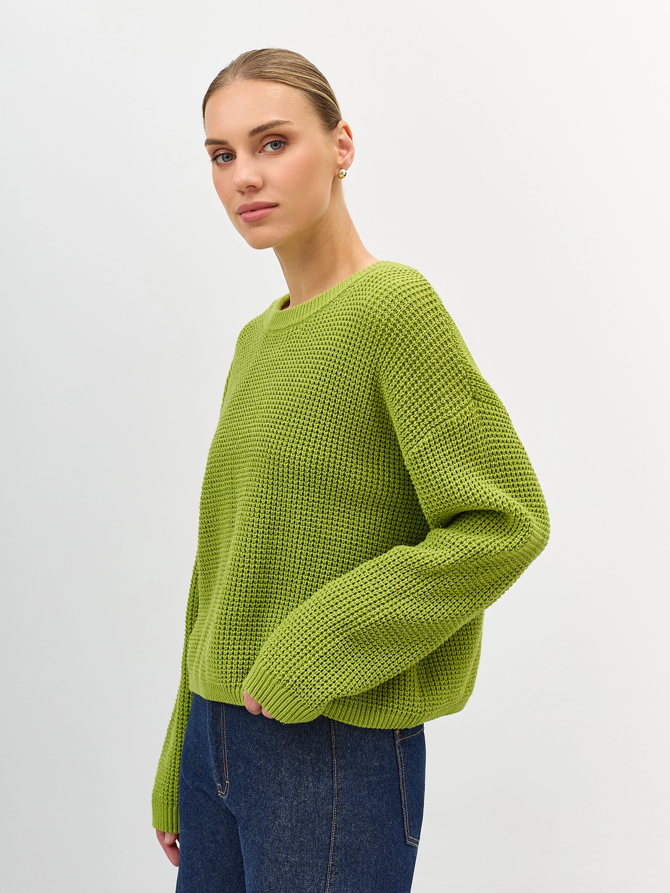 Яркий объемный свитер из хлопка. Свободный силуэт. Спущенная линия плеч. Круглый вырез. Фактурная вязка. Риб по горловине, низу рукавов и изделия.