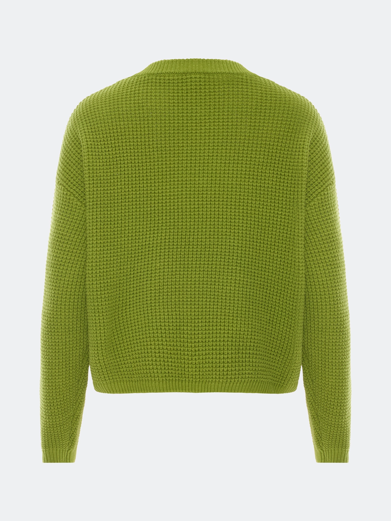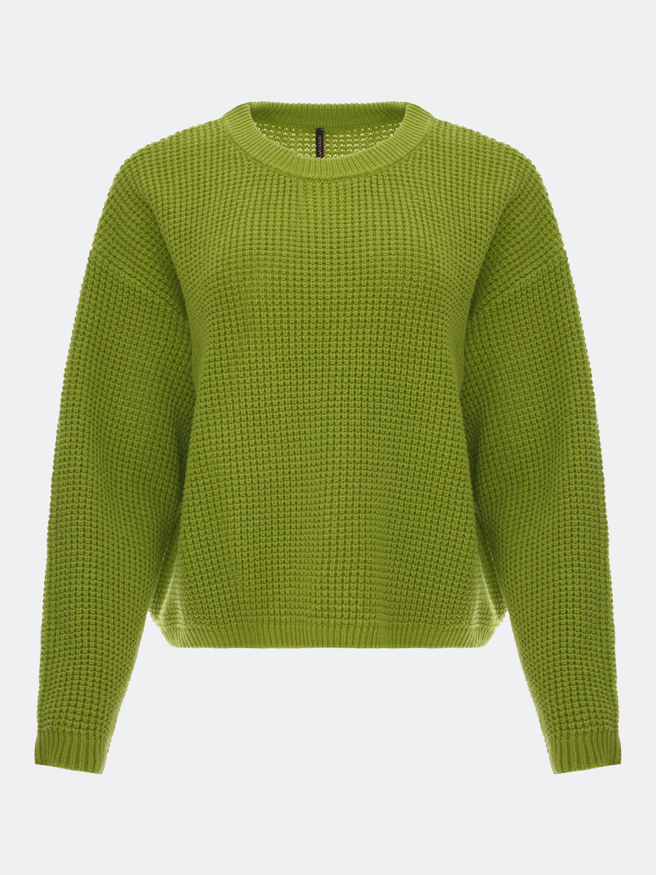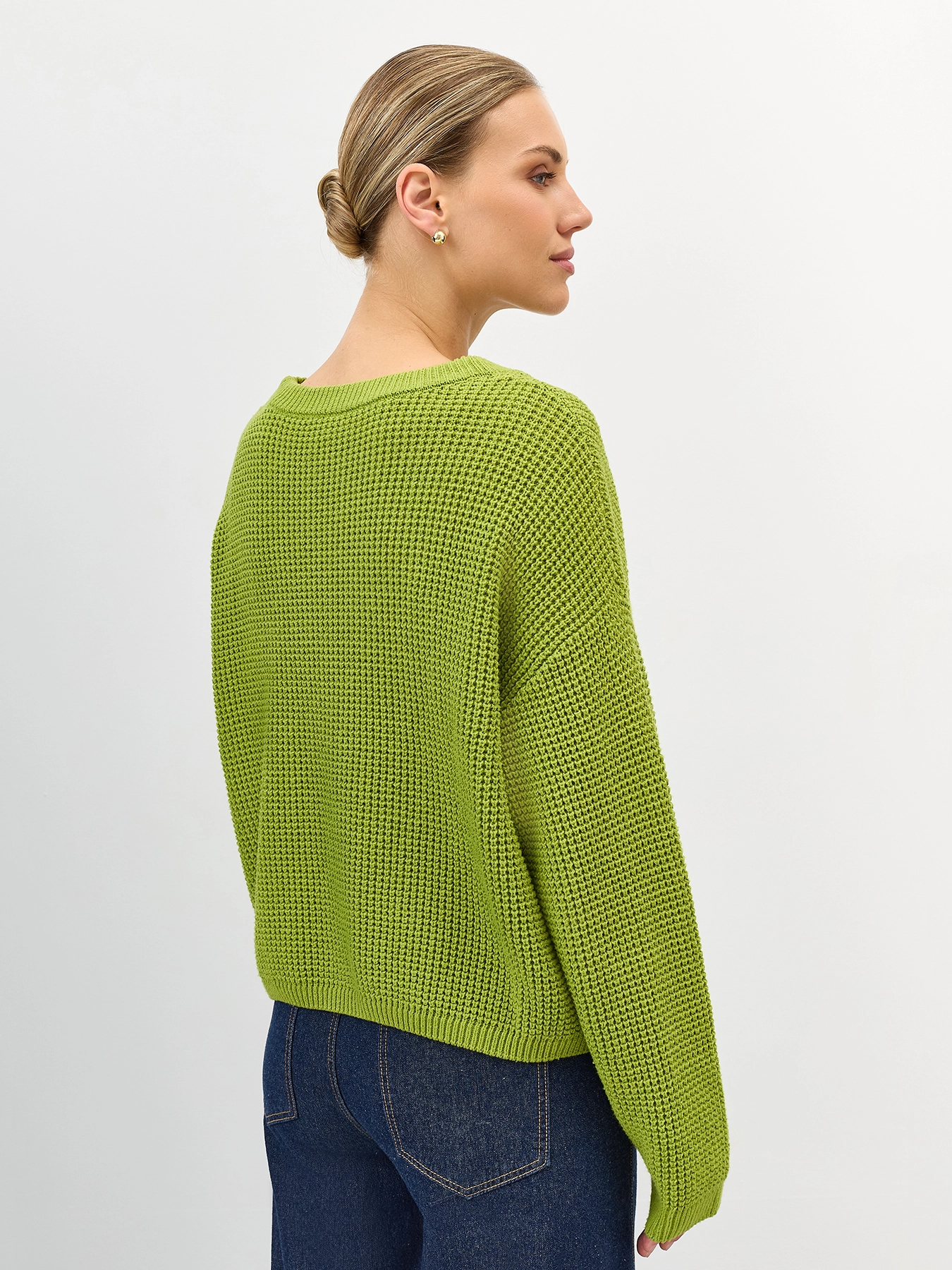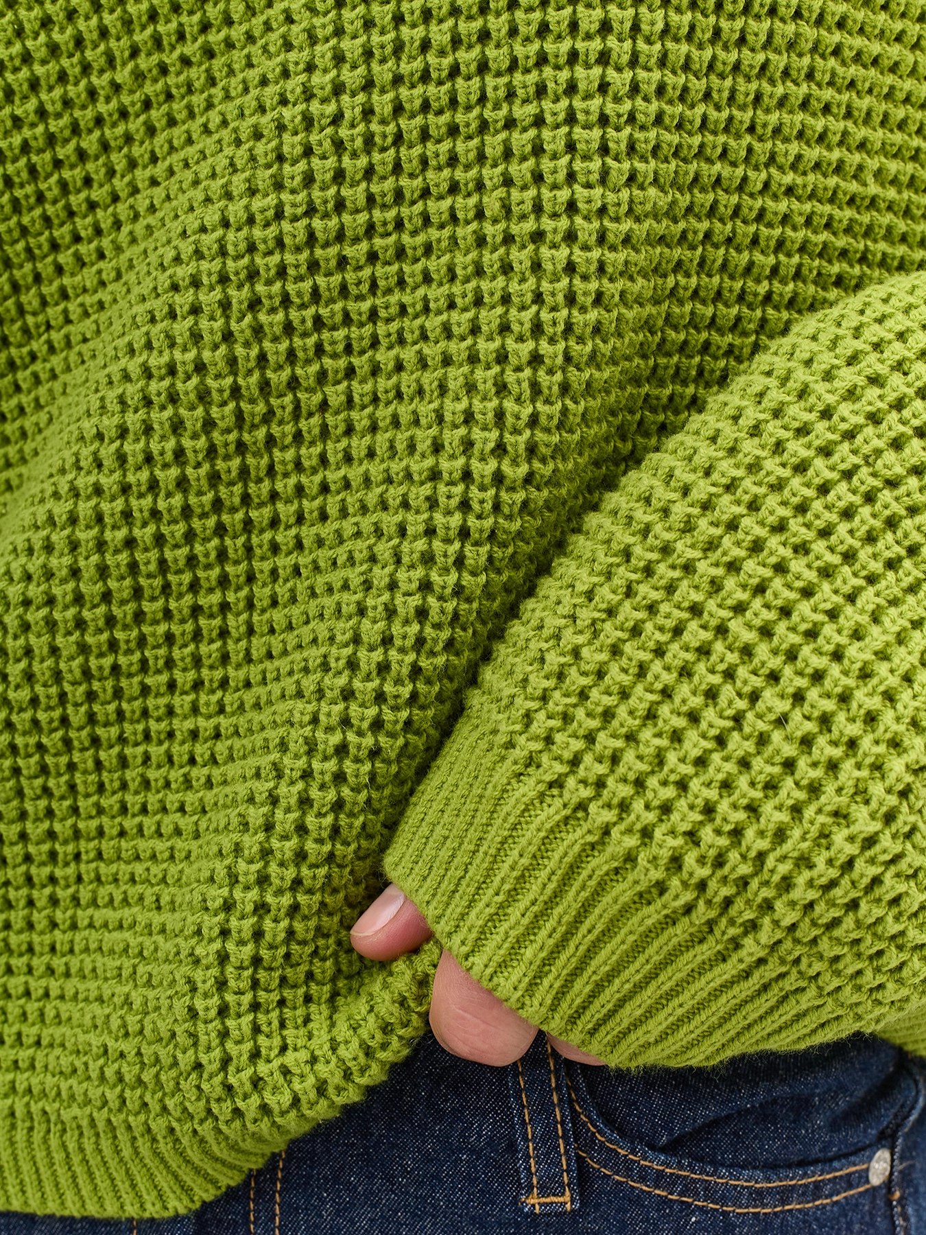 Яркий объемный свитер из хлопка. Свободный силуэт. Спущенная линия плеч. Круглый вырез. Фактурная вязка. Риб по горловине, низу рукавов и изделия.