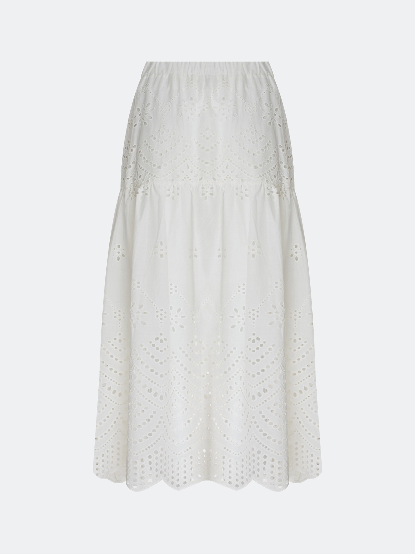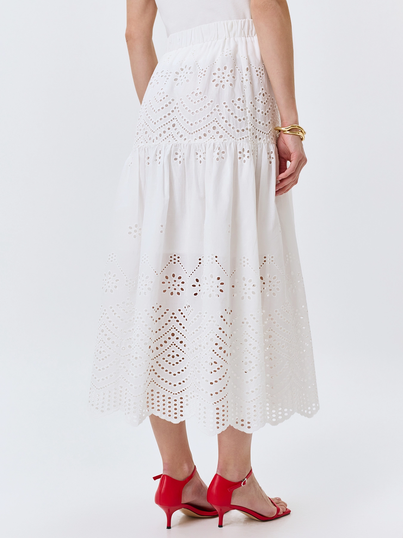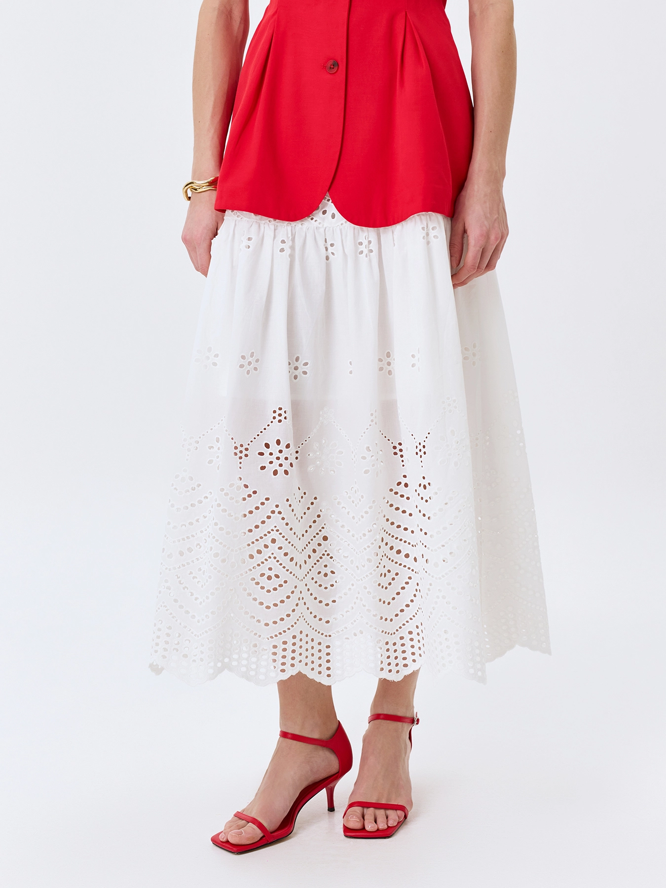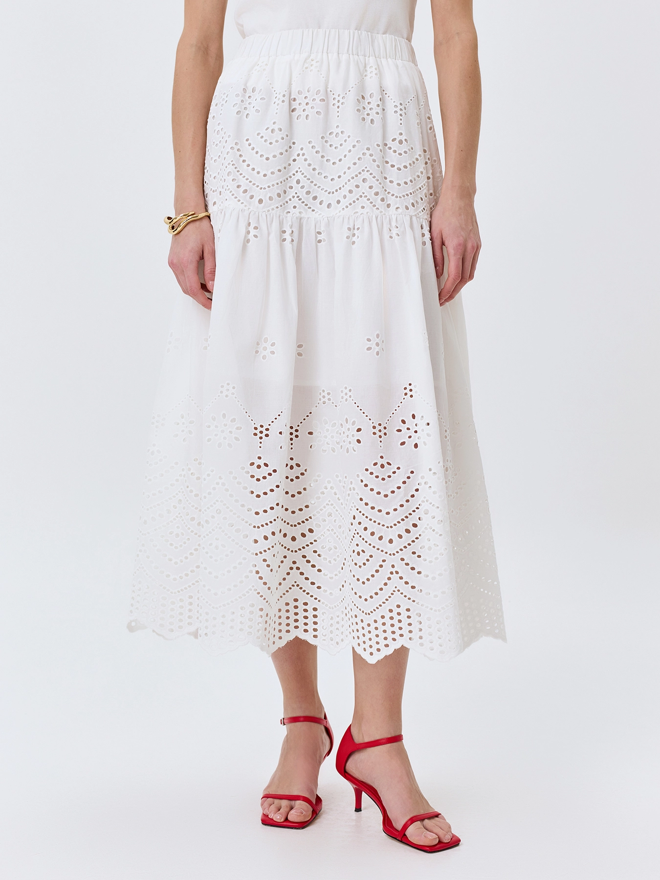 Ажурная юбка из хлопкового шитья. Длина миди. А-силуэт. Резинка по линии талии. Дополнена романтичными складками. В составе 100% хлопок. Подкладка из 100% хлопка.