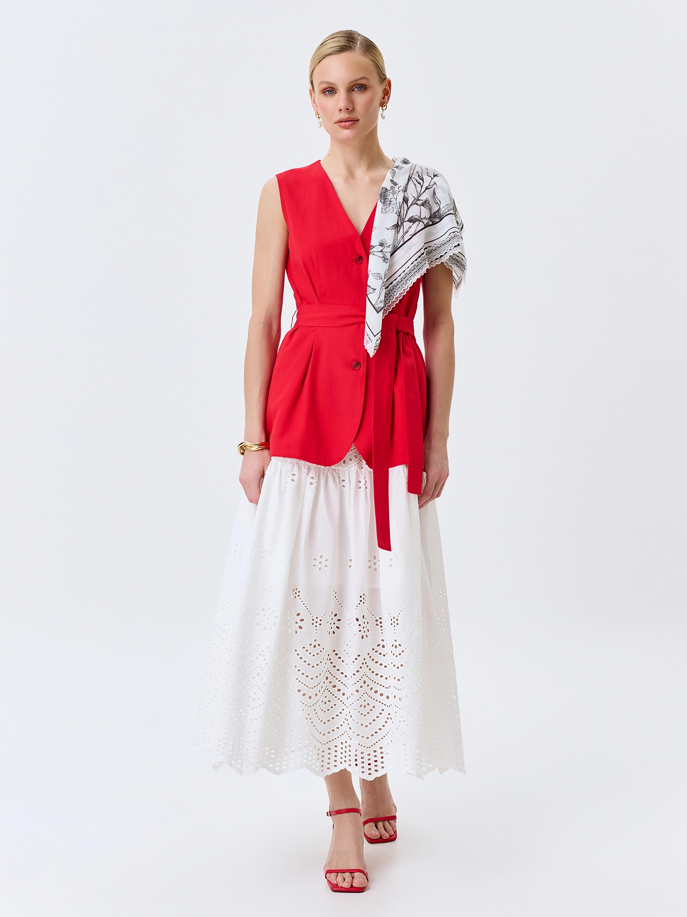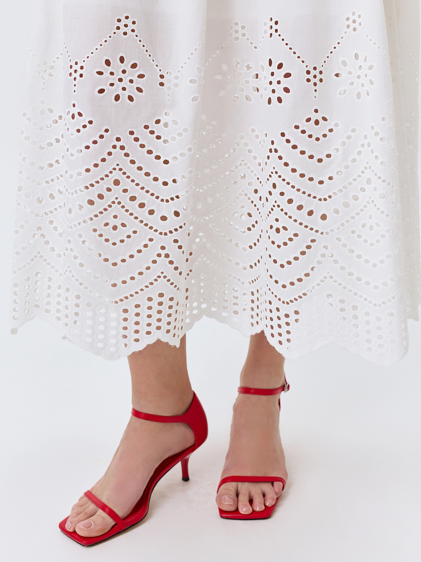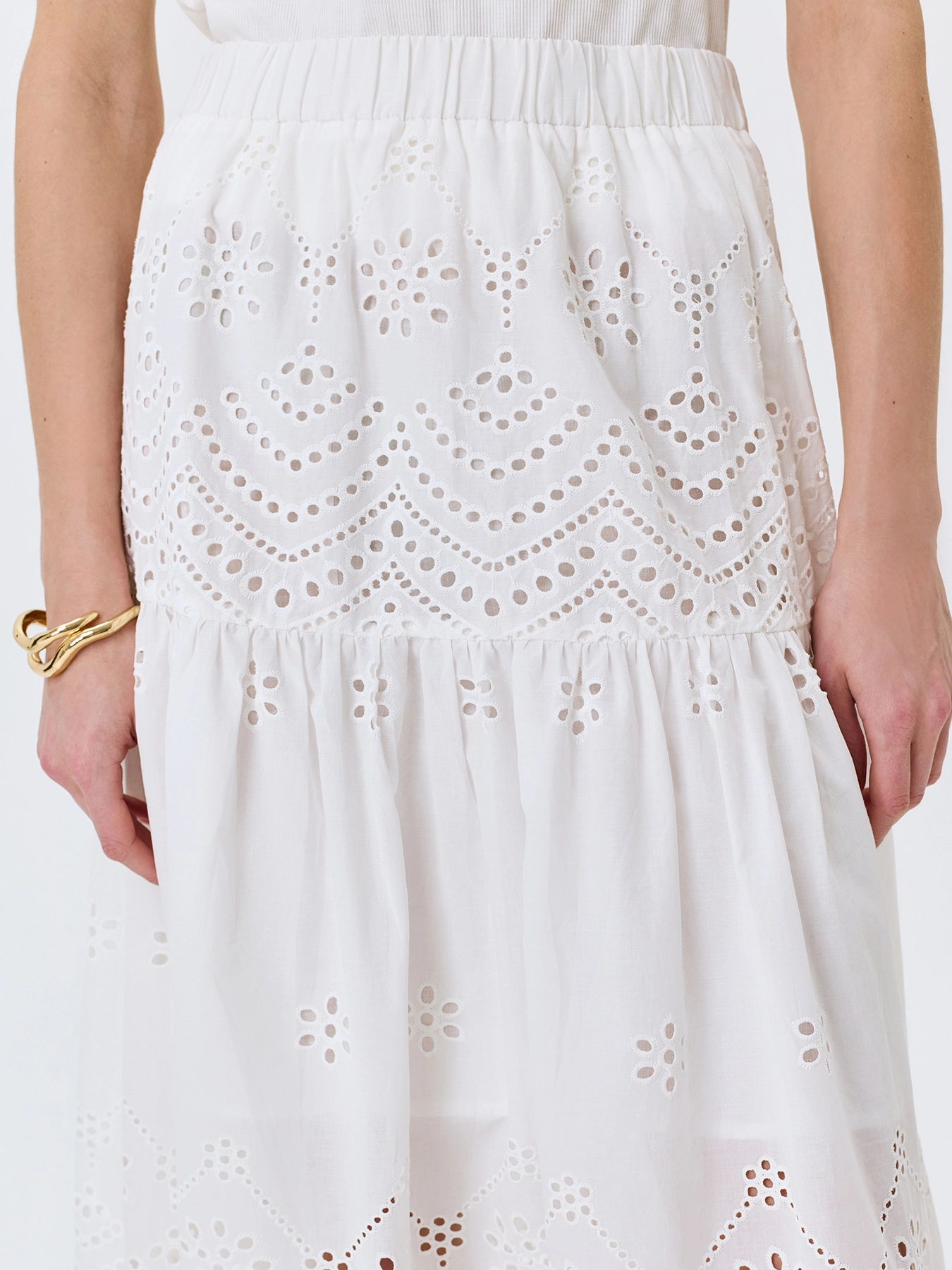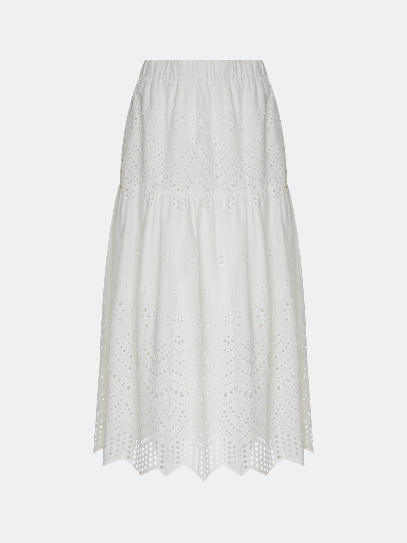 Ажурная юбка из хлопкового шитья. Длина миди. А-силуэт. Резинка по линии талии. Дополнена романтичными складками. В составе 100% хлопок. Подкладка из 100% хлопка.