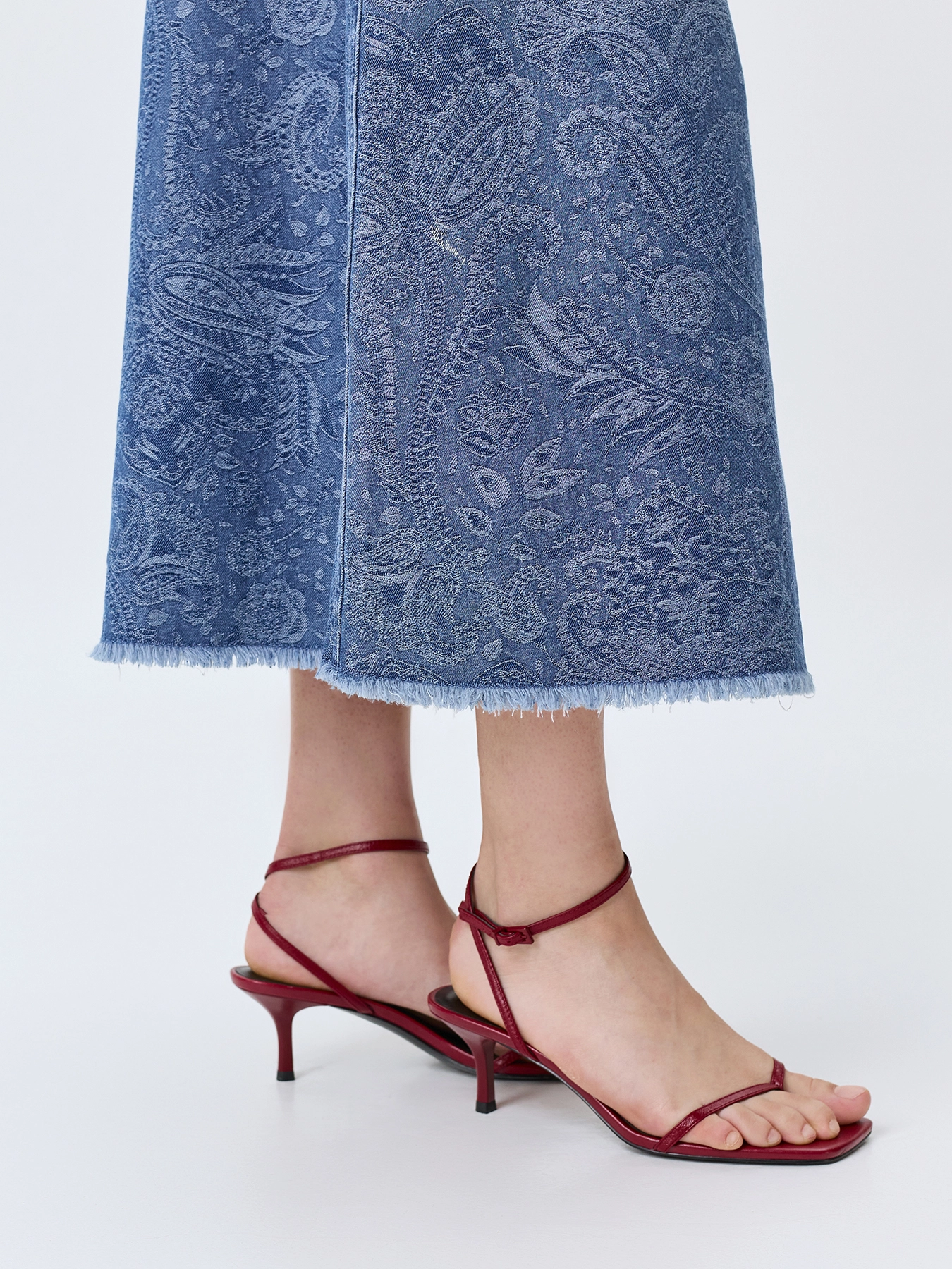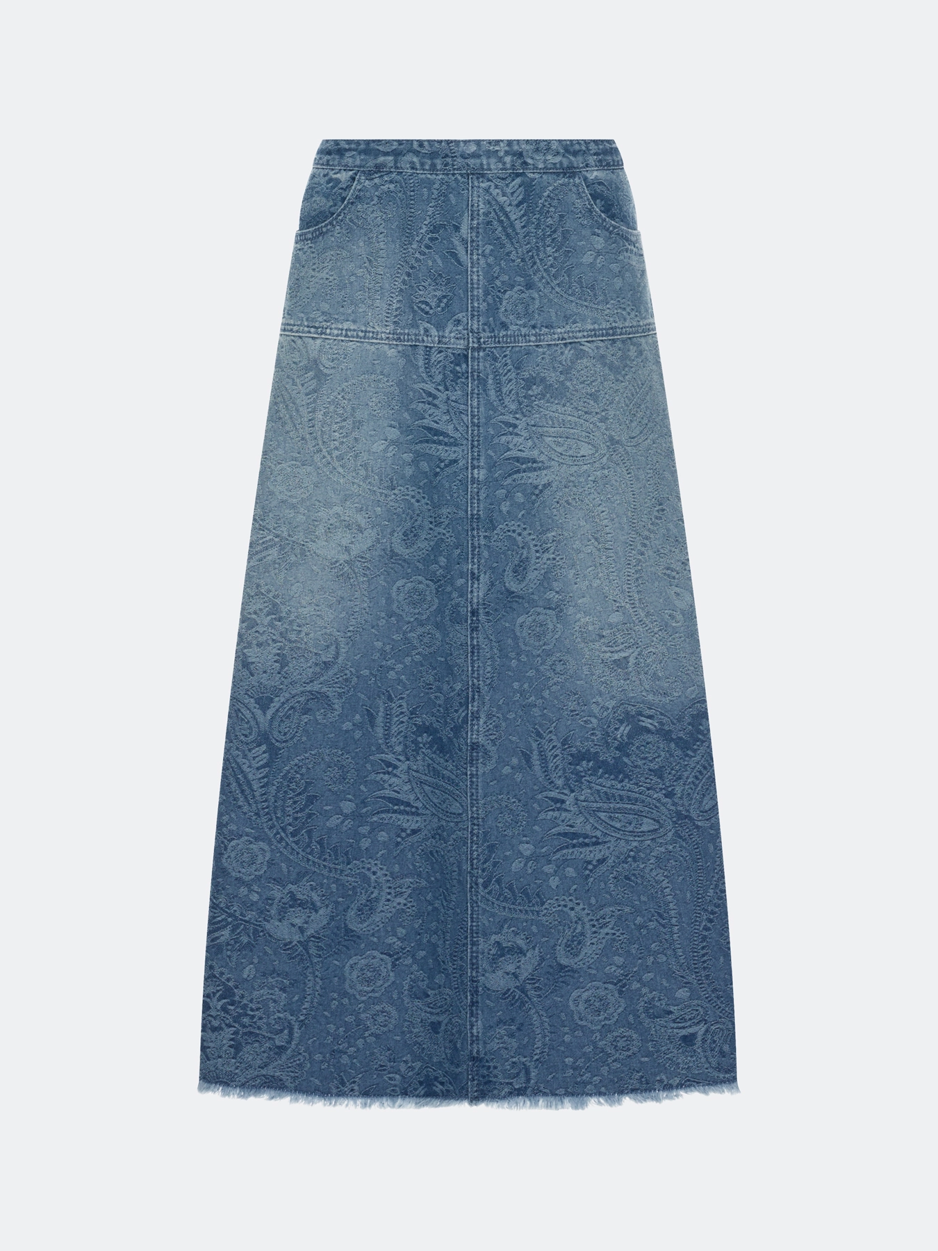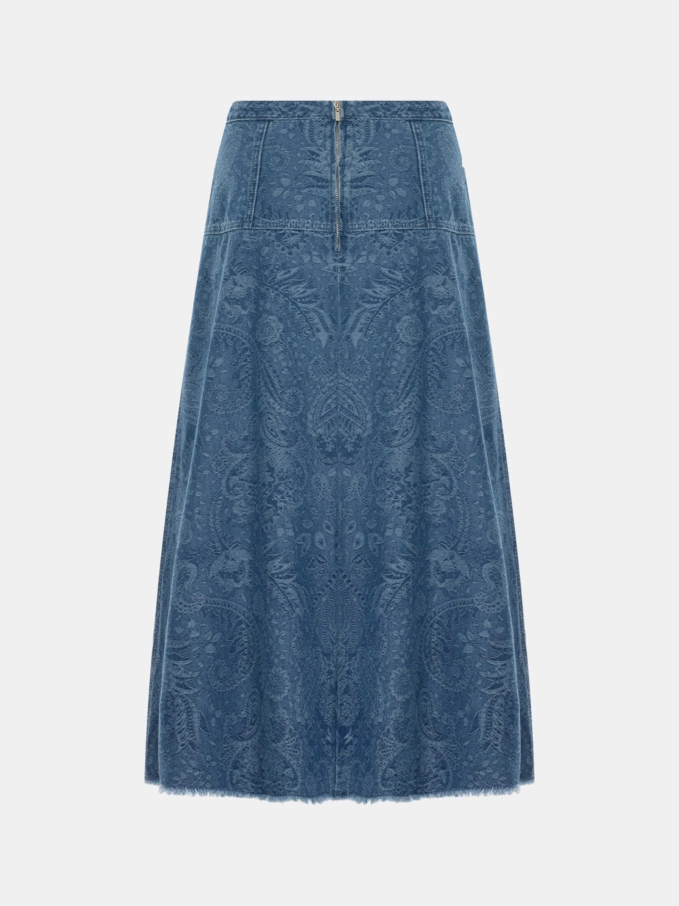 Юбка из джинсового жаккарда длины миди. А-силуэт. Средняя посадка. Застёжка на молнию. Дополнена бахромой по низу изделия. Ткань с фактурным переплетением. В составе хлопок.