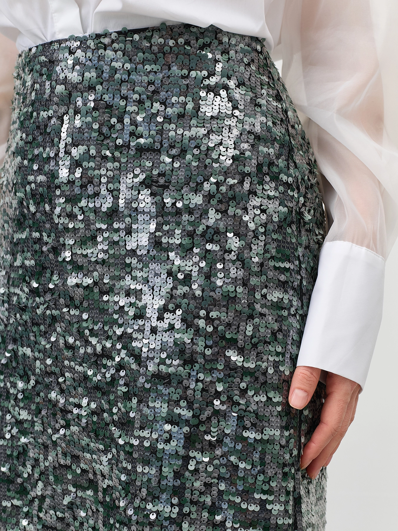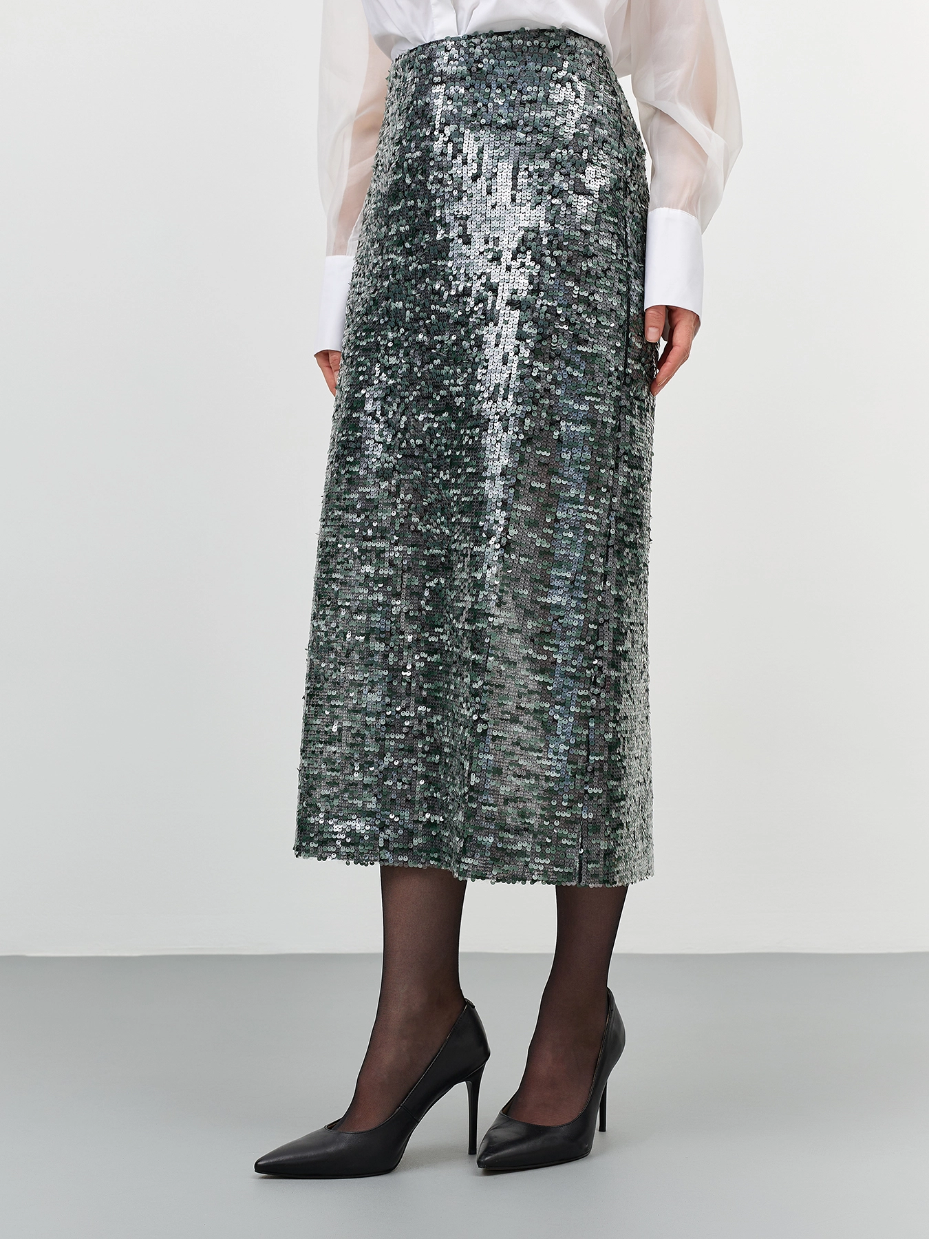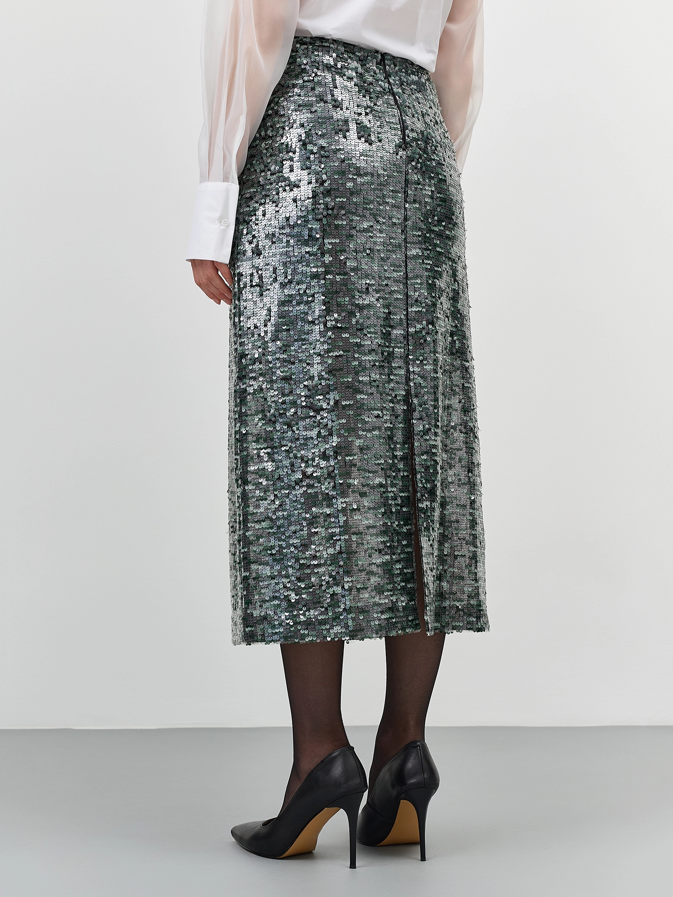 Нарядная мерцающая юбка с пайетками. Длина миди. Прямой силуэт. Застежка на молнию. Дополнена подкладкой из смесовой вискозы.
