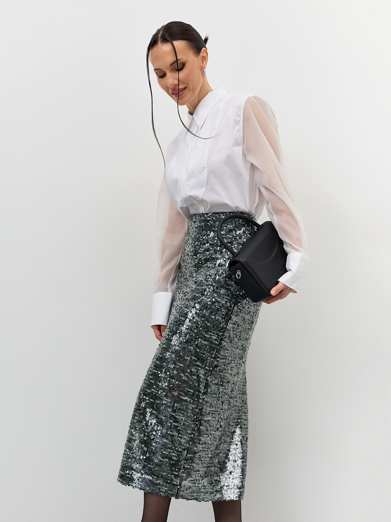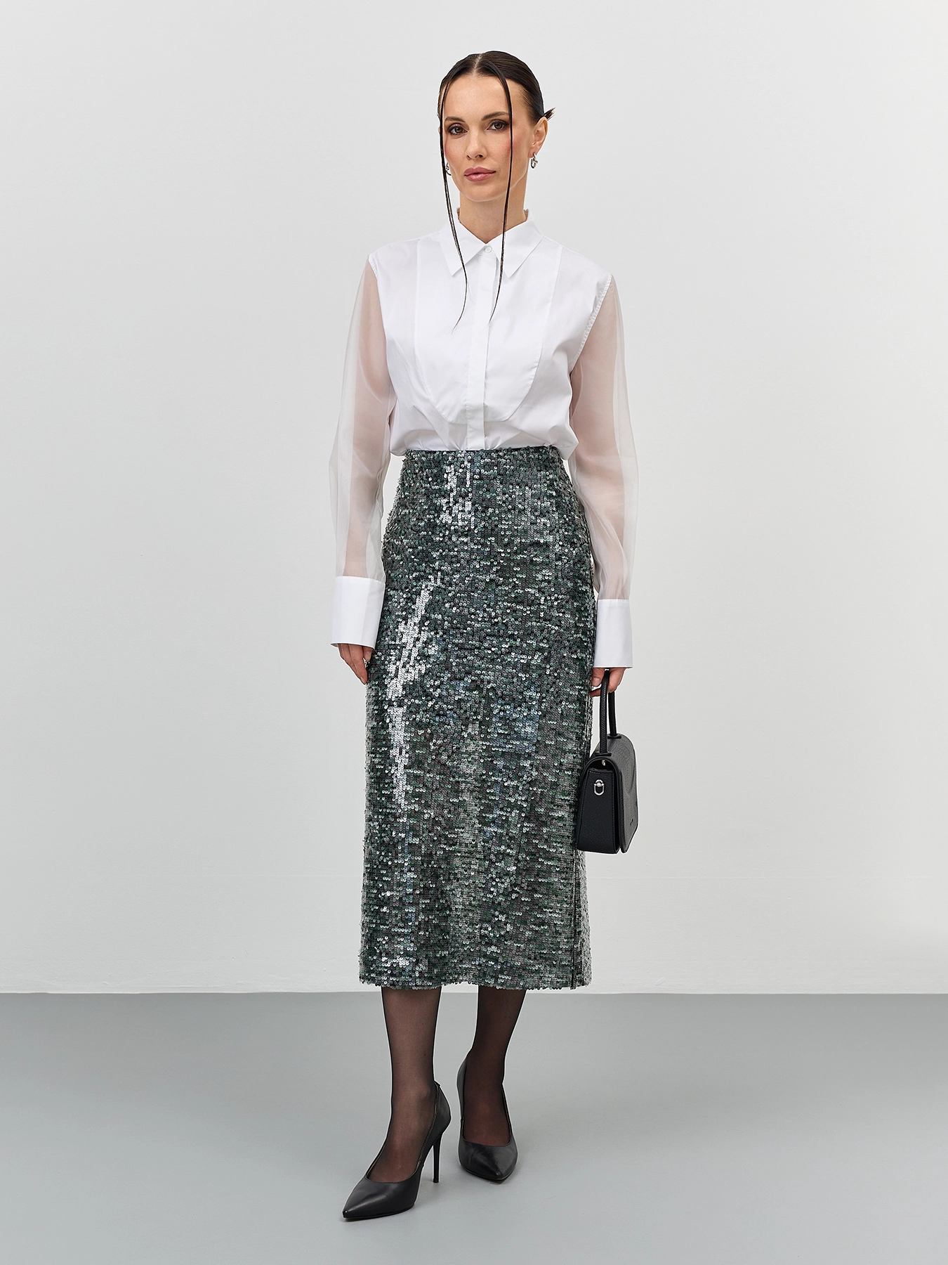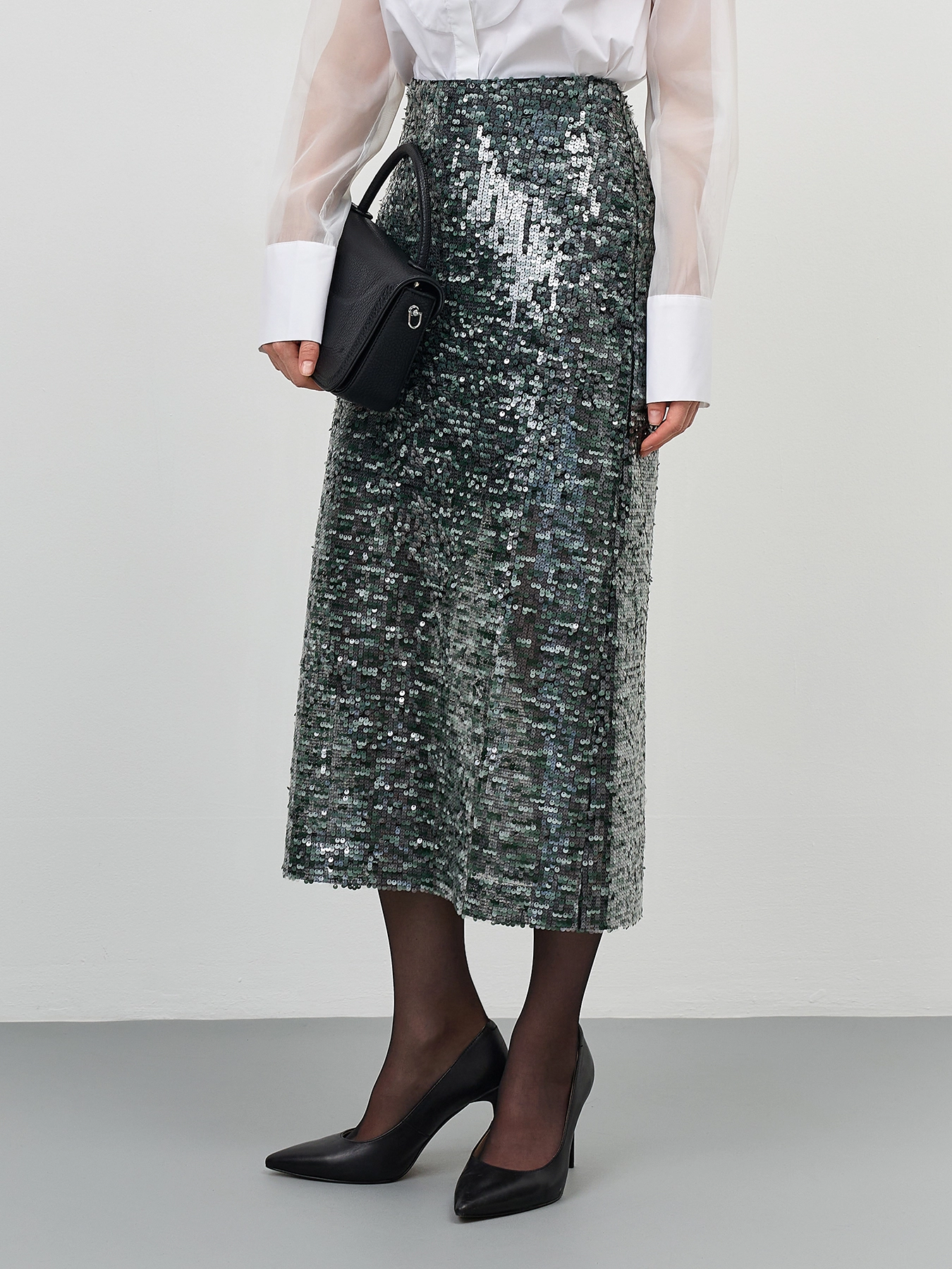 Нарядная мерцающая юбка с пайетками. Длина миди. Прямой силуэт. Застежка на молнию. Дополнена подкладкой из смесовой вискозы.