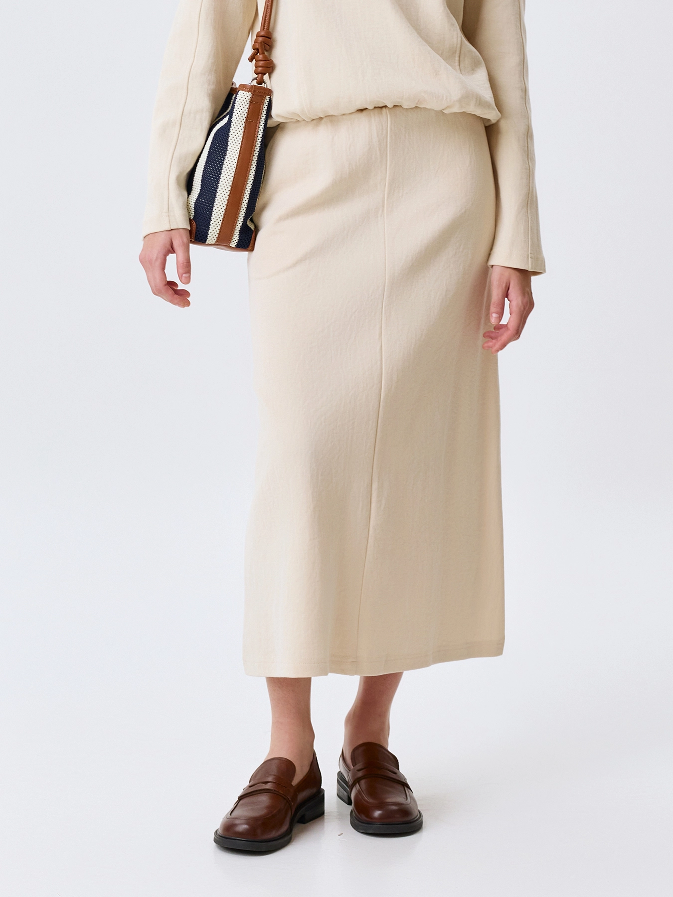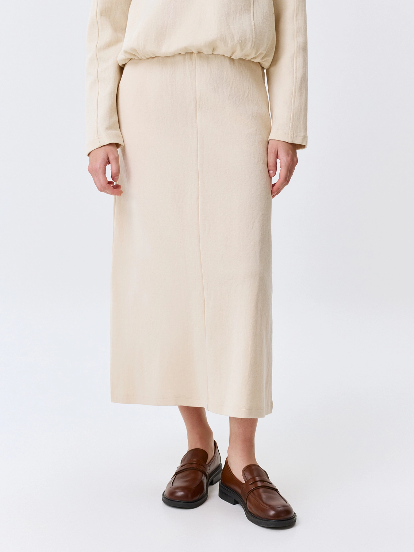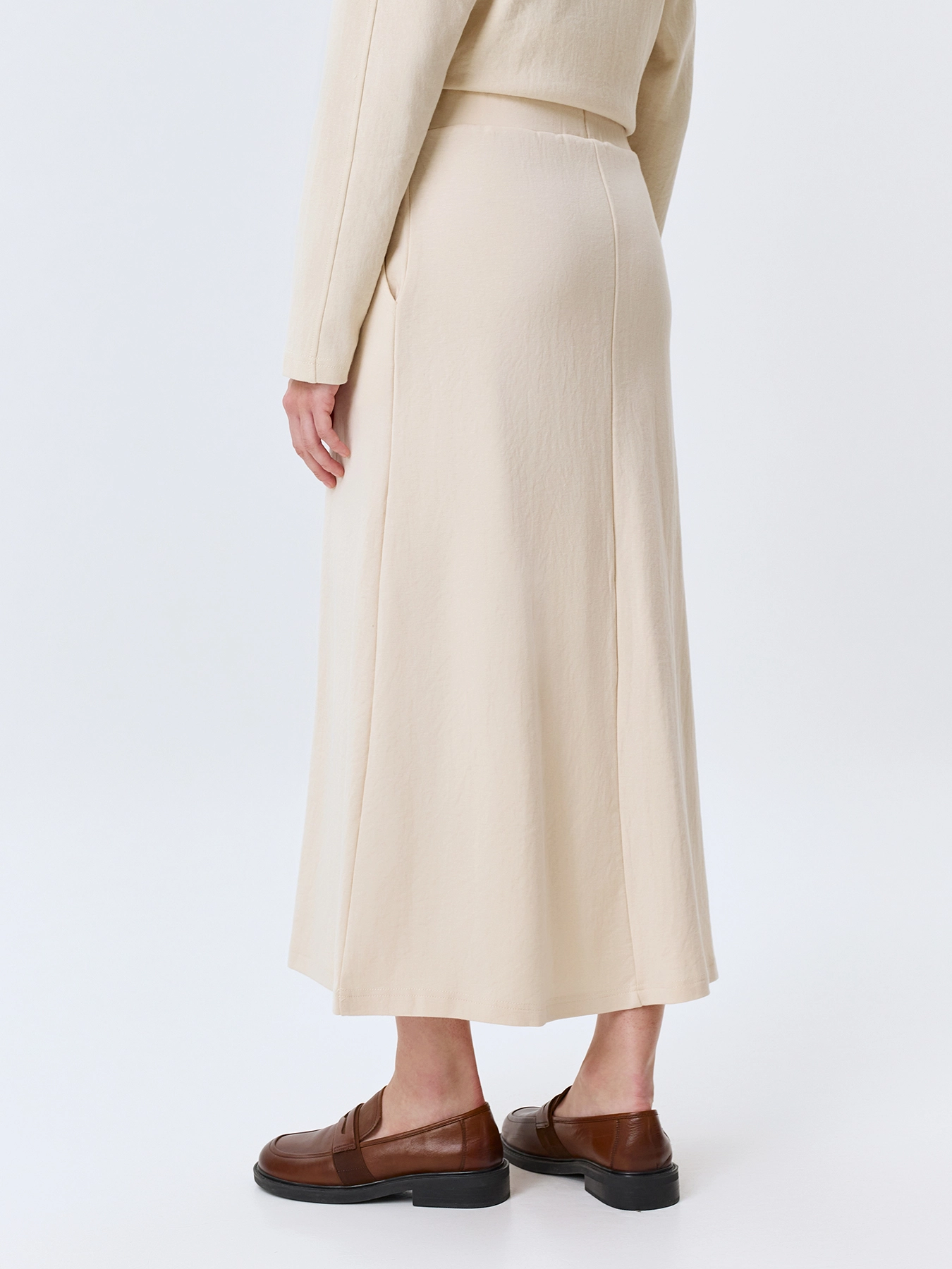 Трикотажная юбка А-силуэта. Длина миди. Боковые карманы в швах. Резинка по линии талии. В составе хлопок и нейлон. Комплект с 63807.