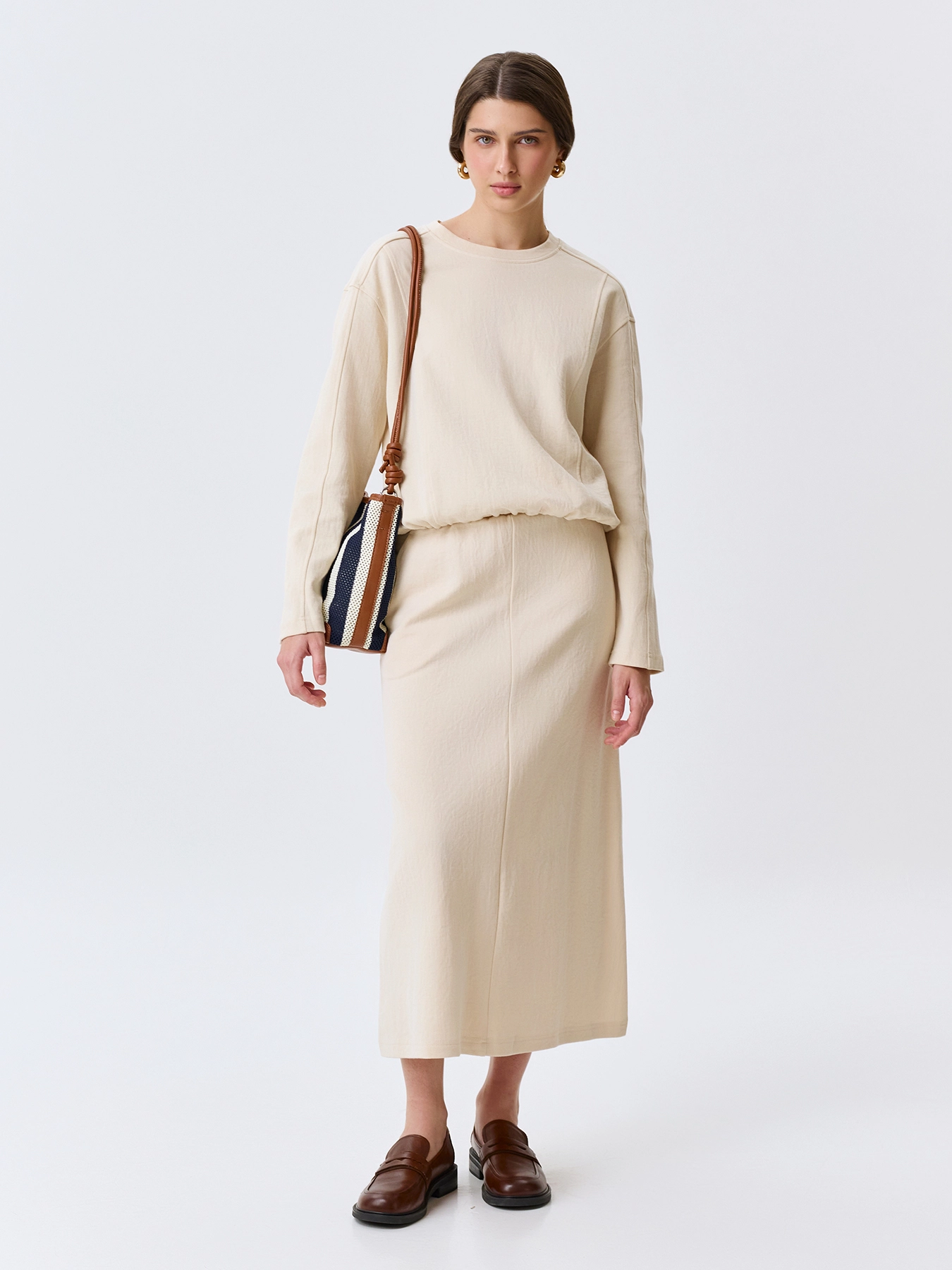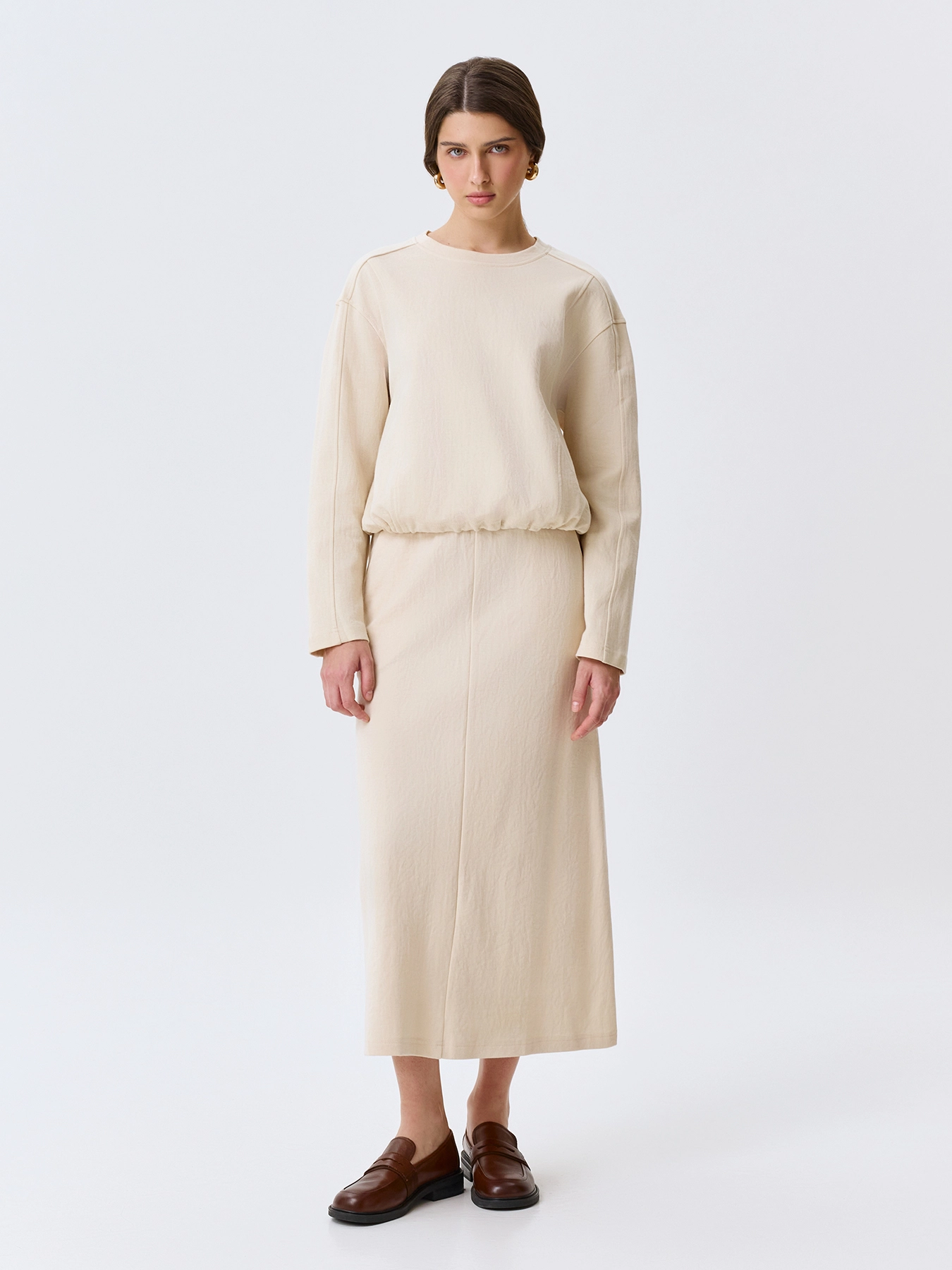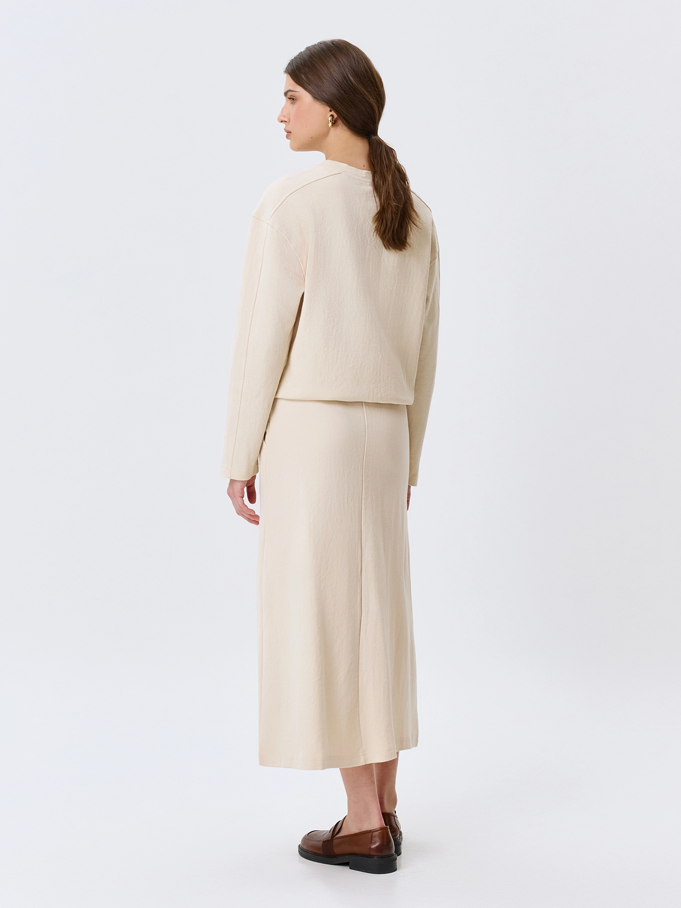 Трикотажная юбка А-силуэта. Длина миди. Боковые карманы в швах. Резинка по линии талии. В составе хлопок и нейлон. Комплект с 63807.