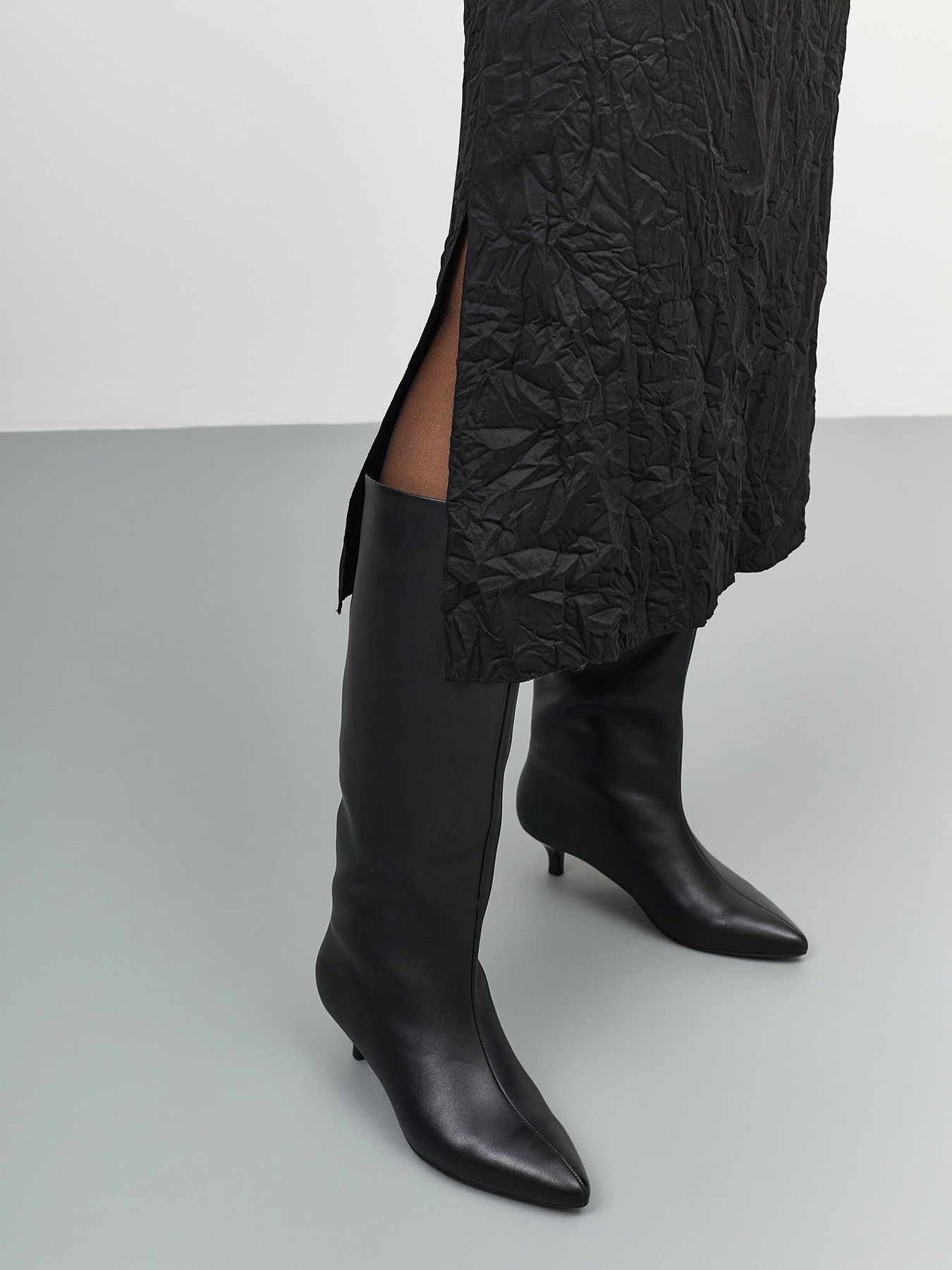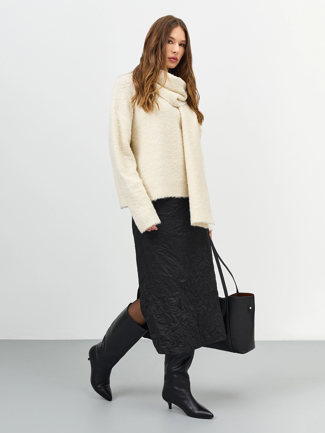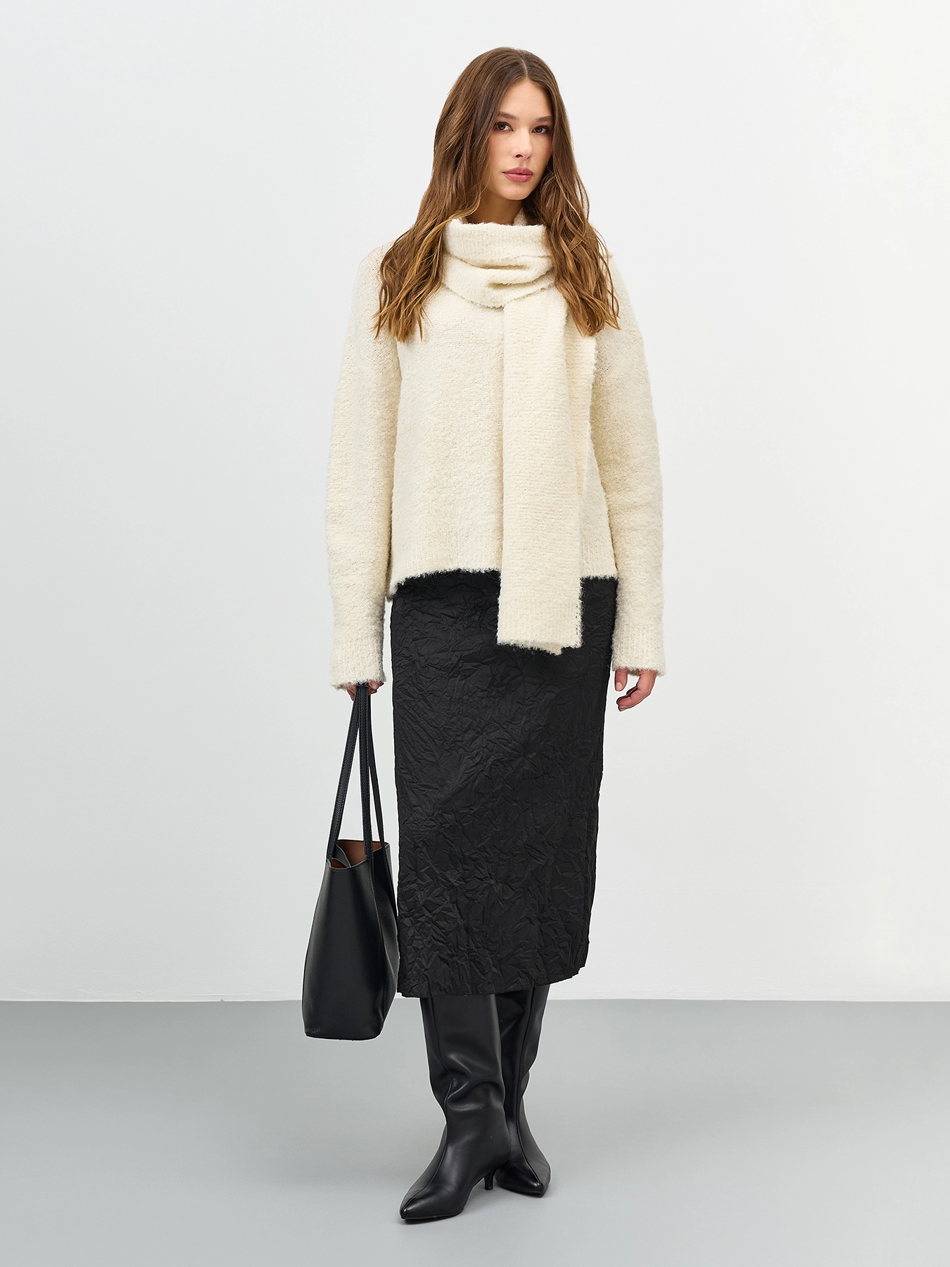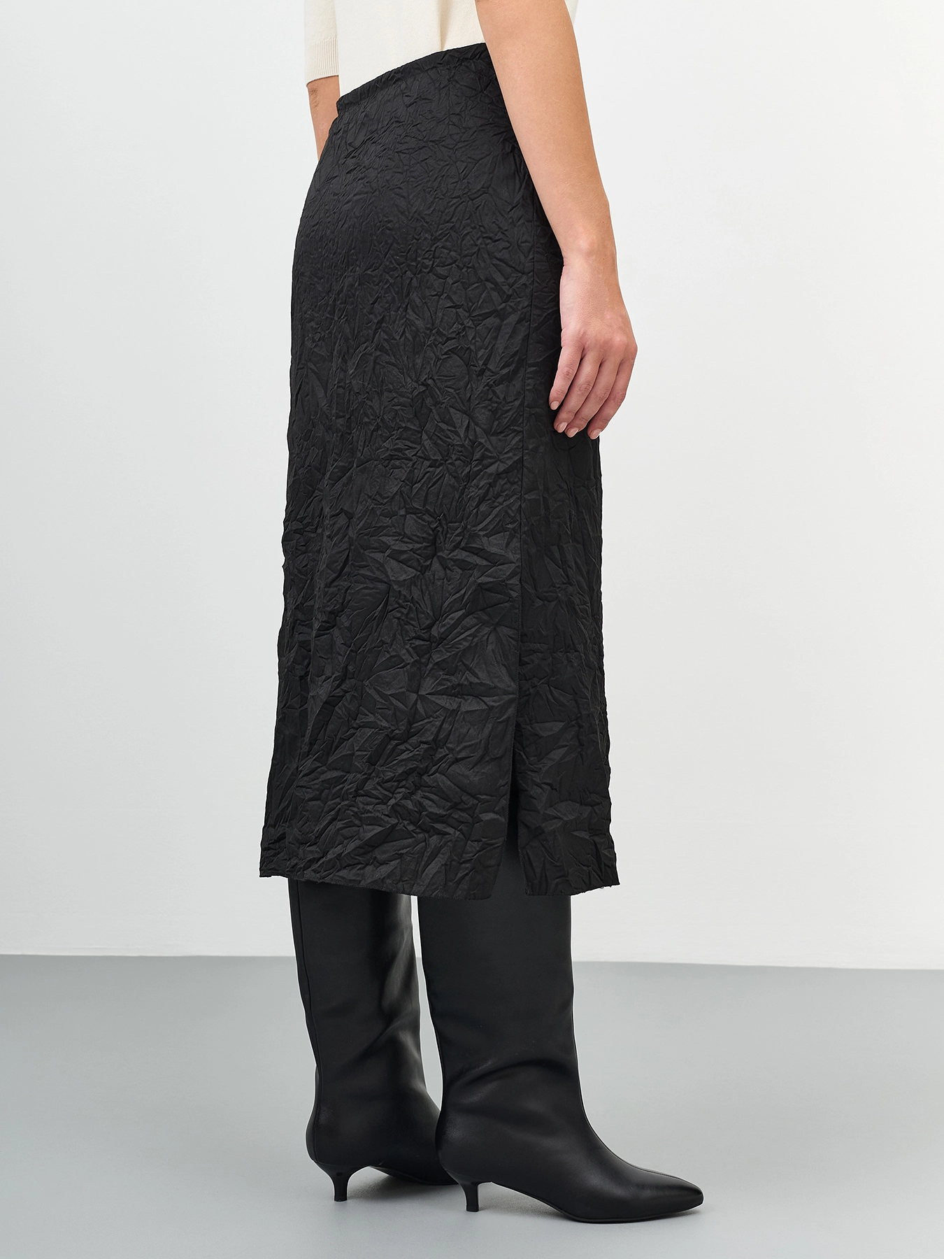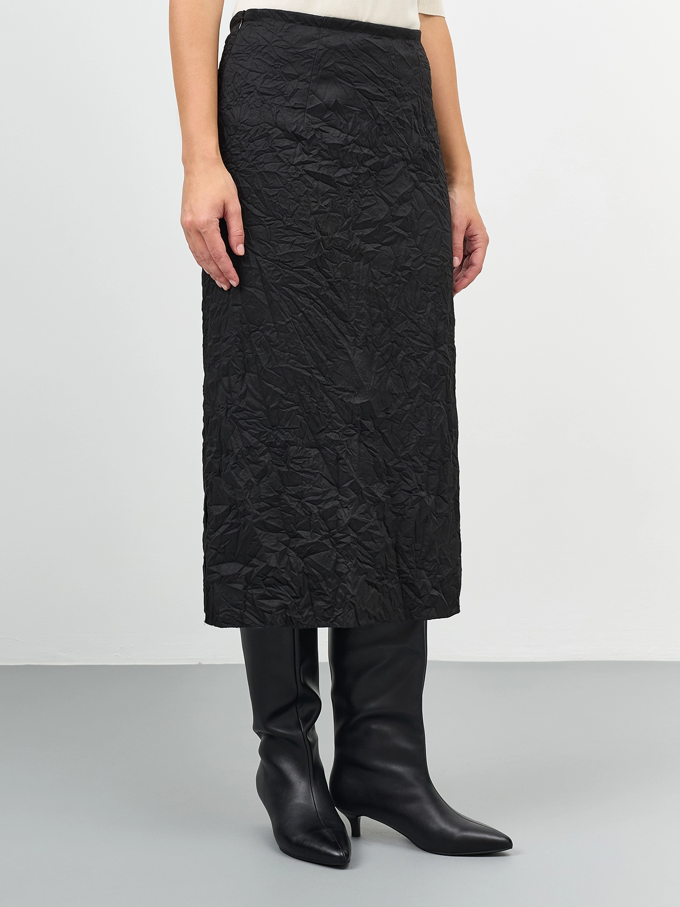 Прямая юбка из ткани с крэш эффектом. Длина миди. Застежка на потайную молнию. Высокий разрез в боковом шве. Подкладка из смесовой вискозы.