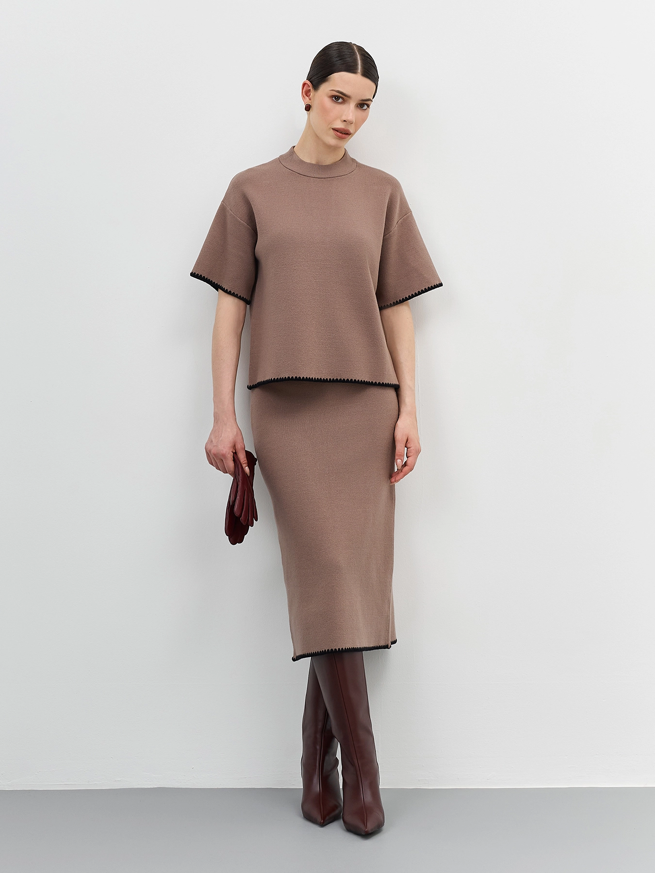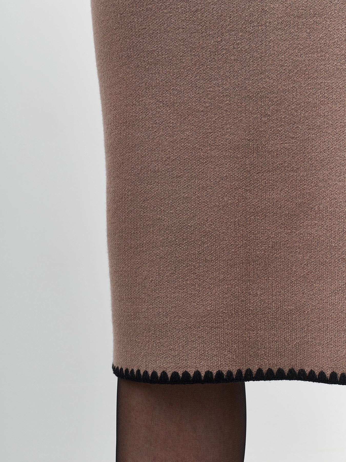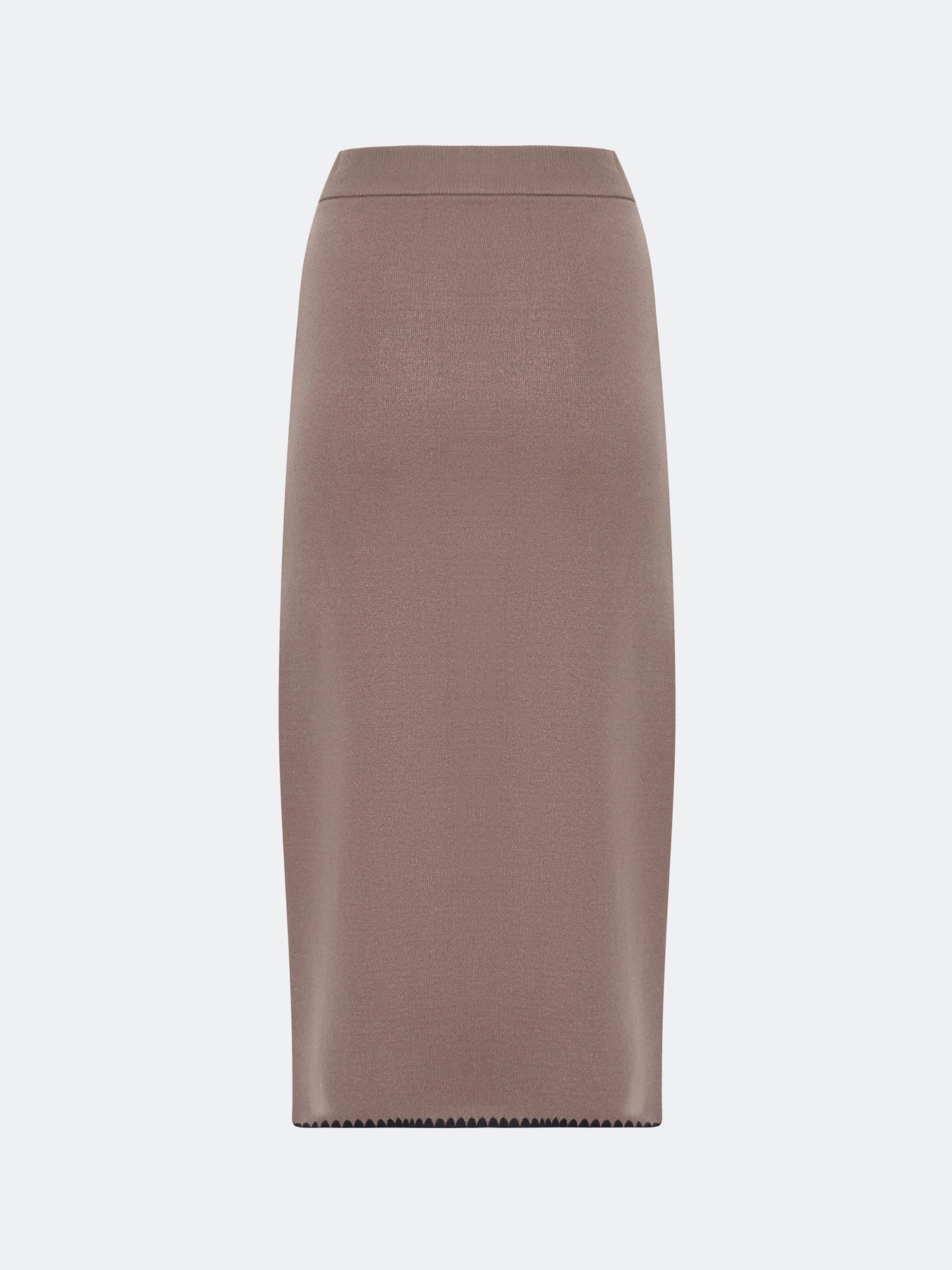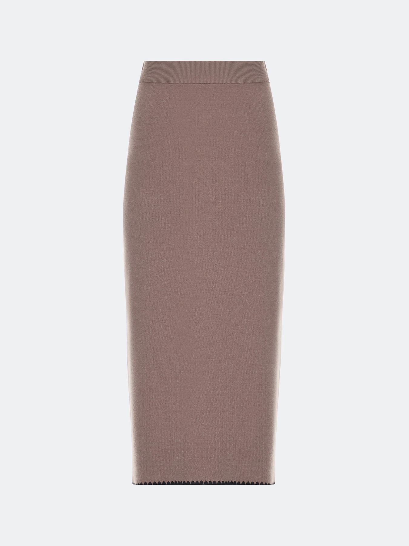 Вязаная юбка-карандаш с контрастным фигурным кантом по низу изделия. Прямой силуэт. Резинка по линии талии. В составе вискоза и нейлон. Комплект с арт. 60793.