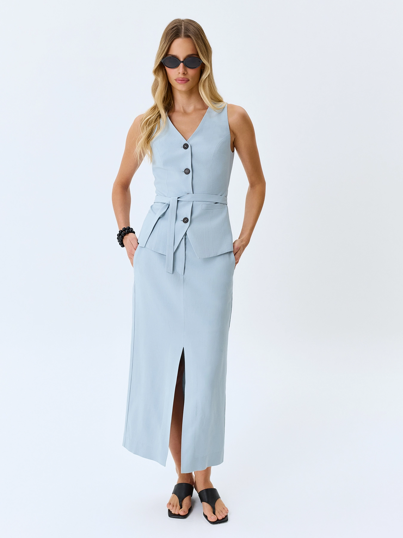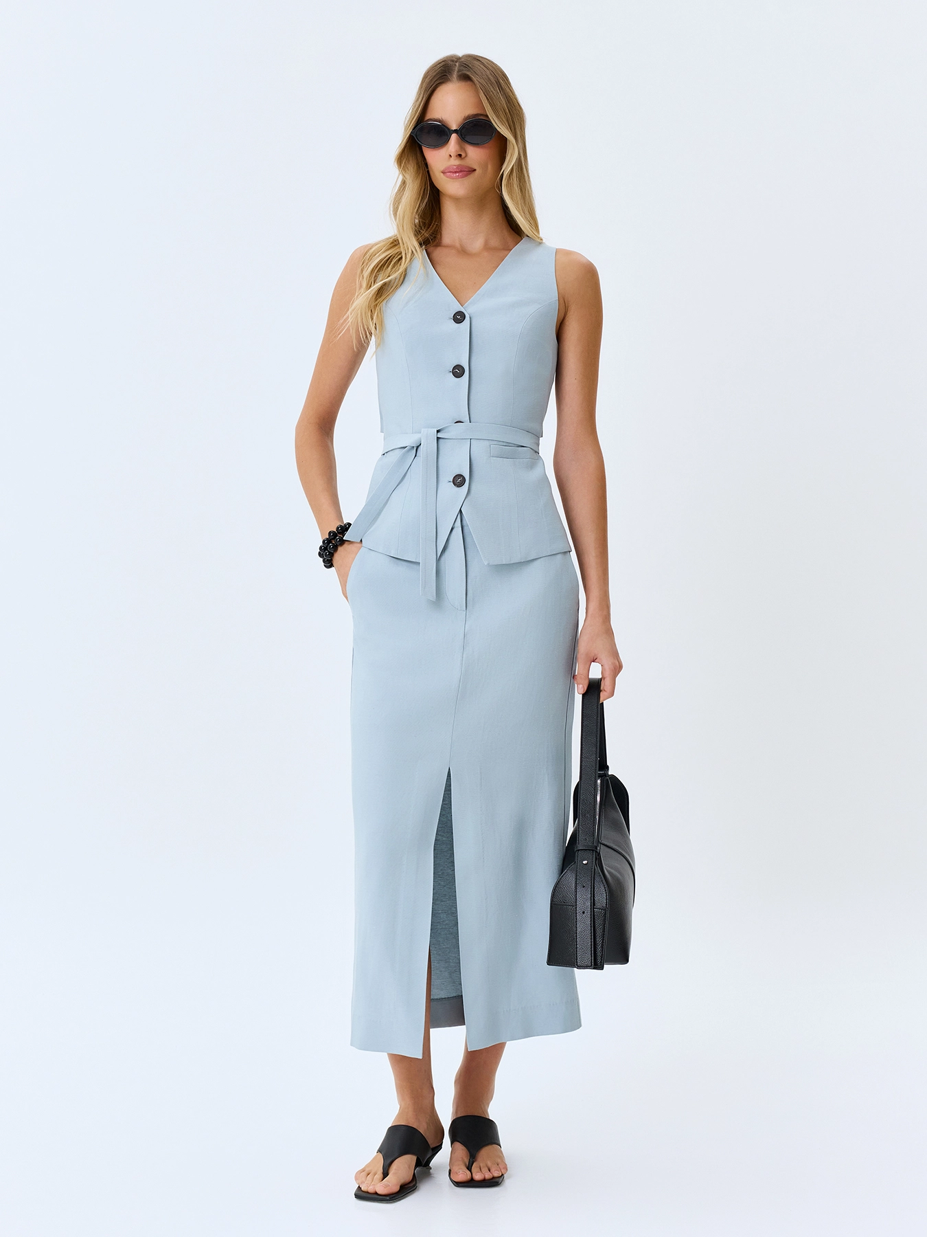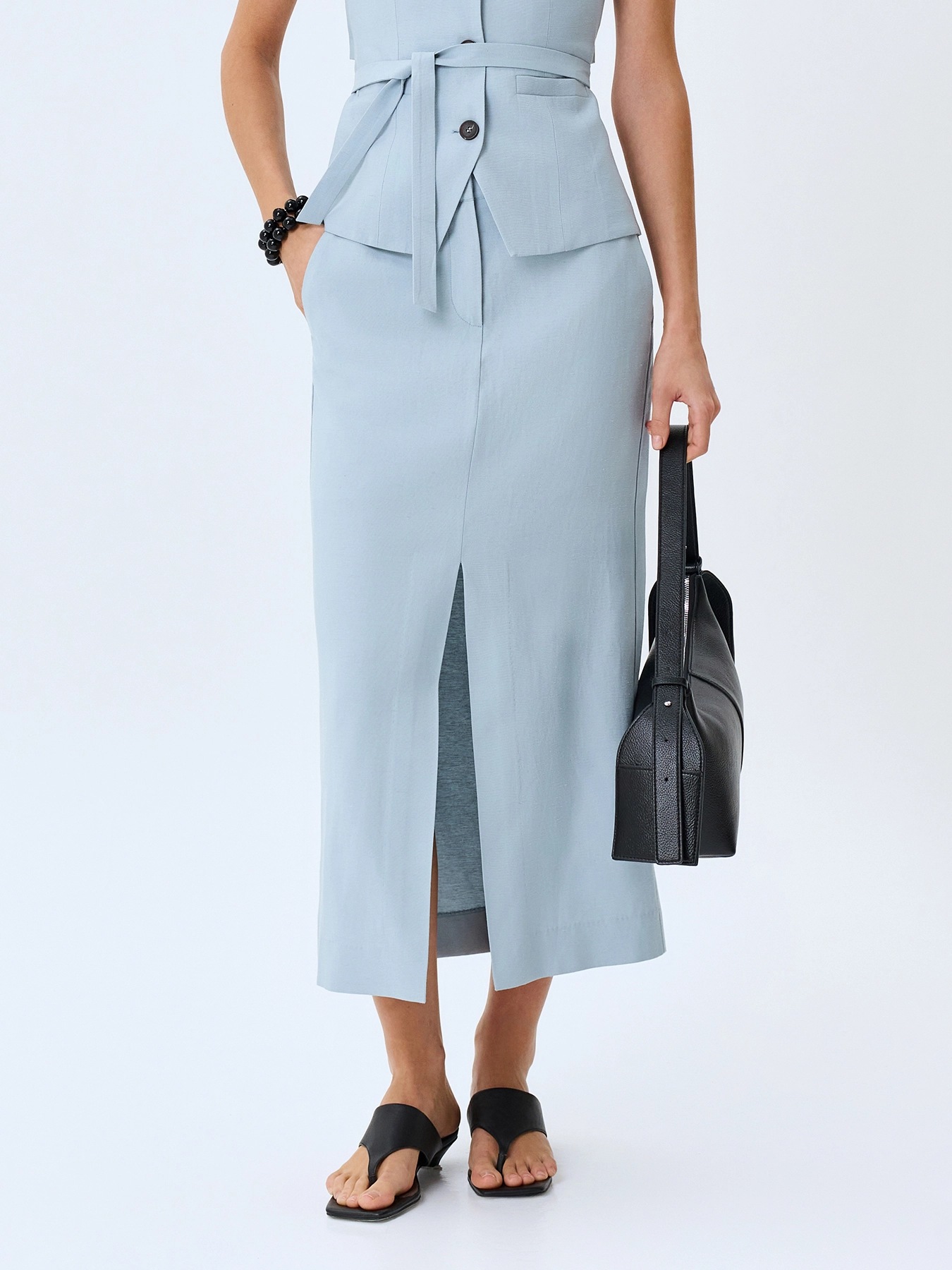Юбка-карандаш из смесовой вискозы и льна. Прямой силуэт. Длина миди. Застежка на молнию. Боковые карманы в швах. Дополнена акцентным разрезом. Комплект с 63374.