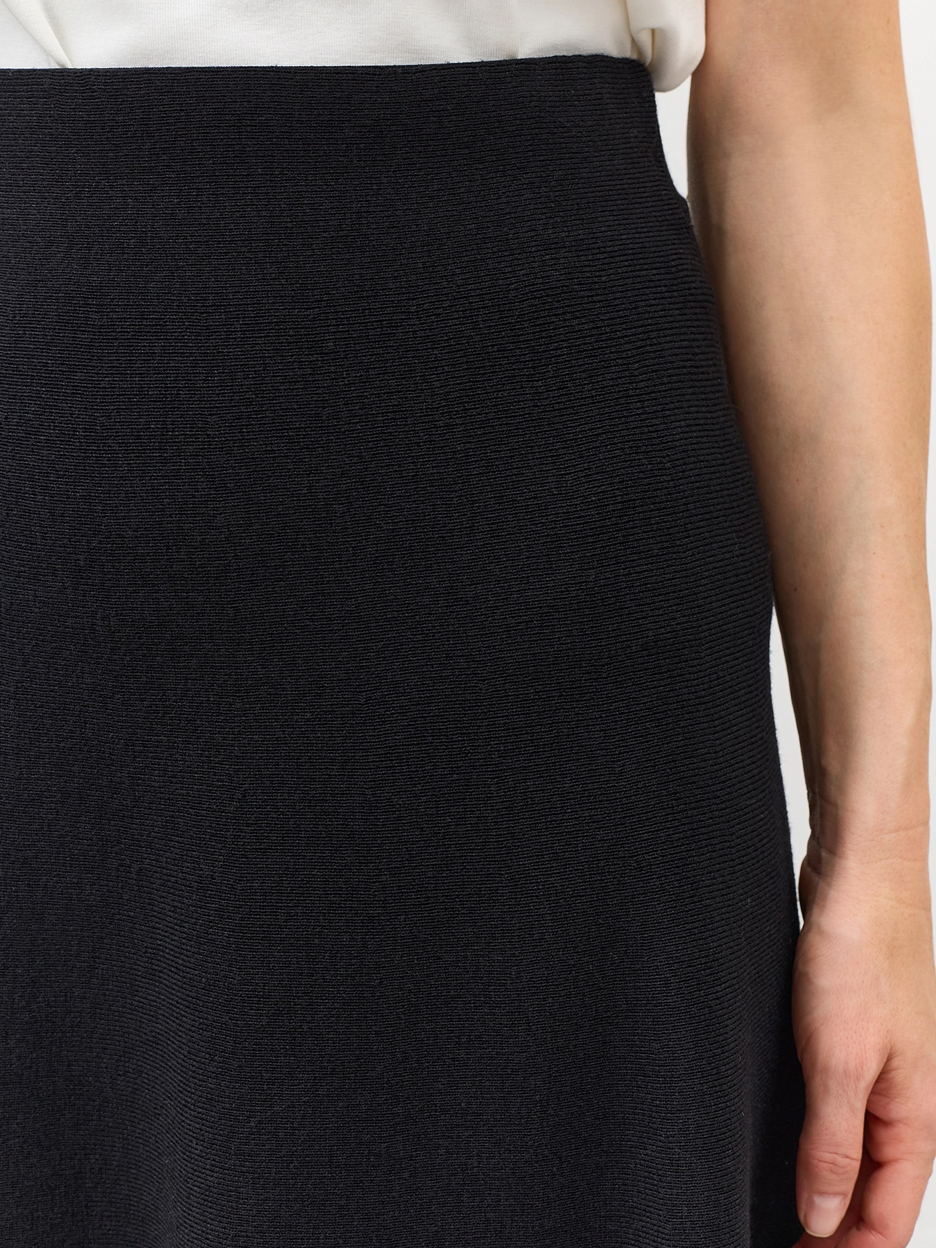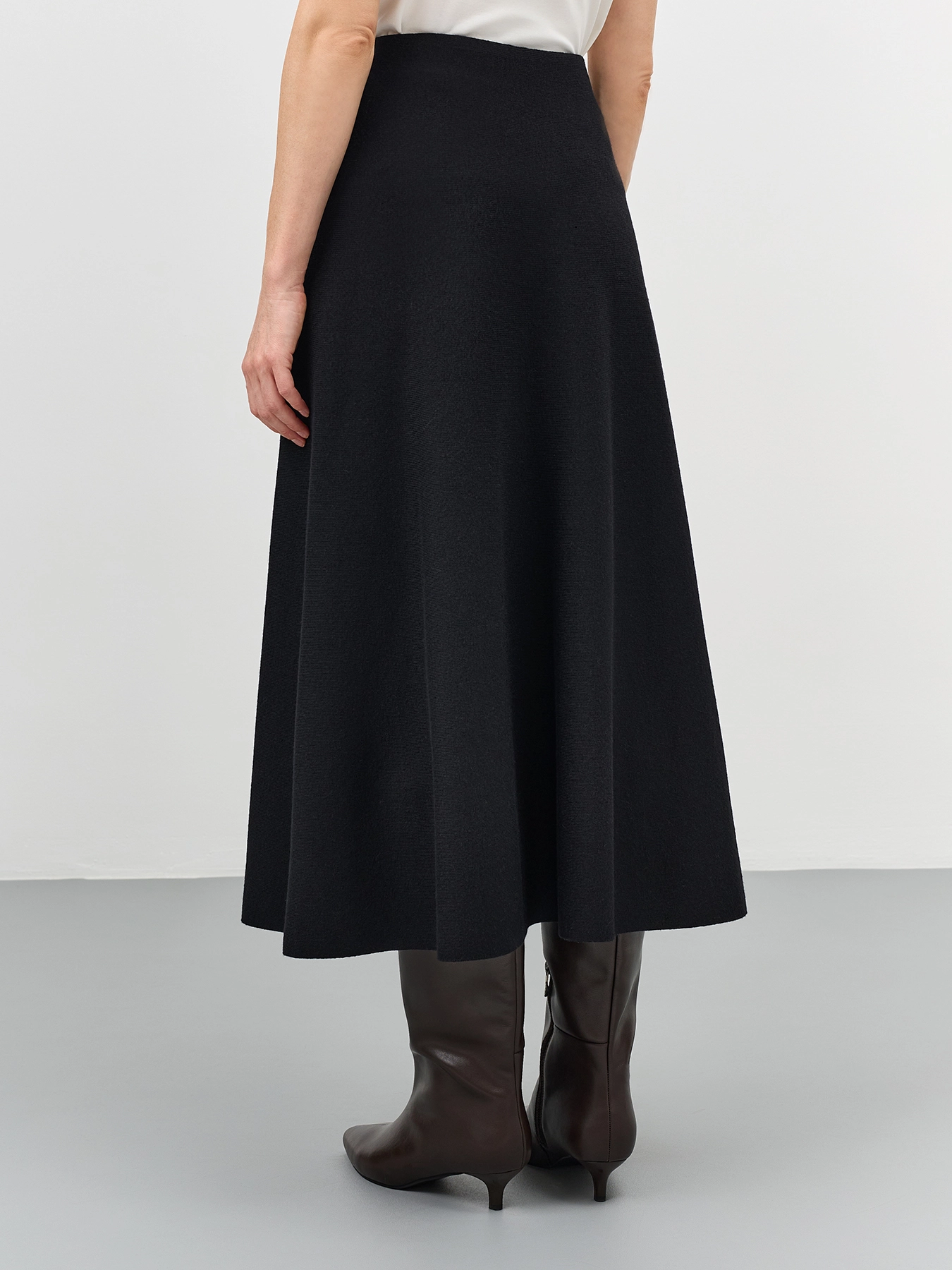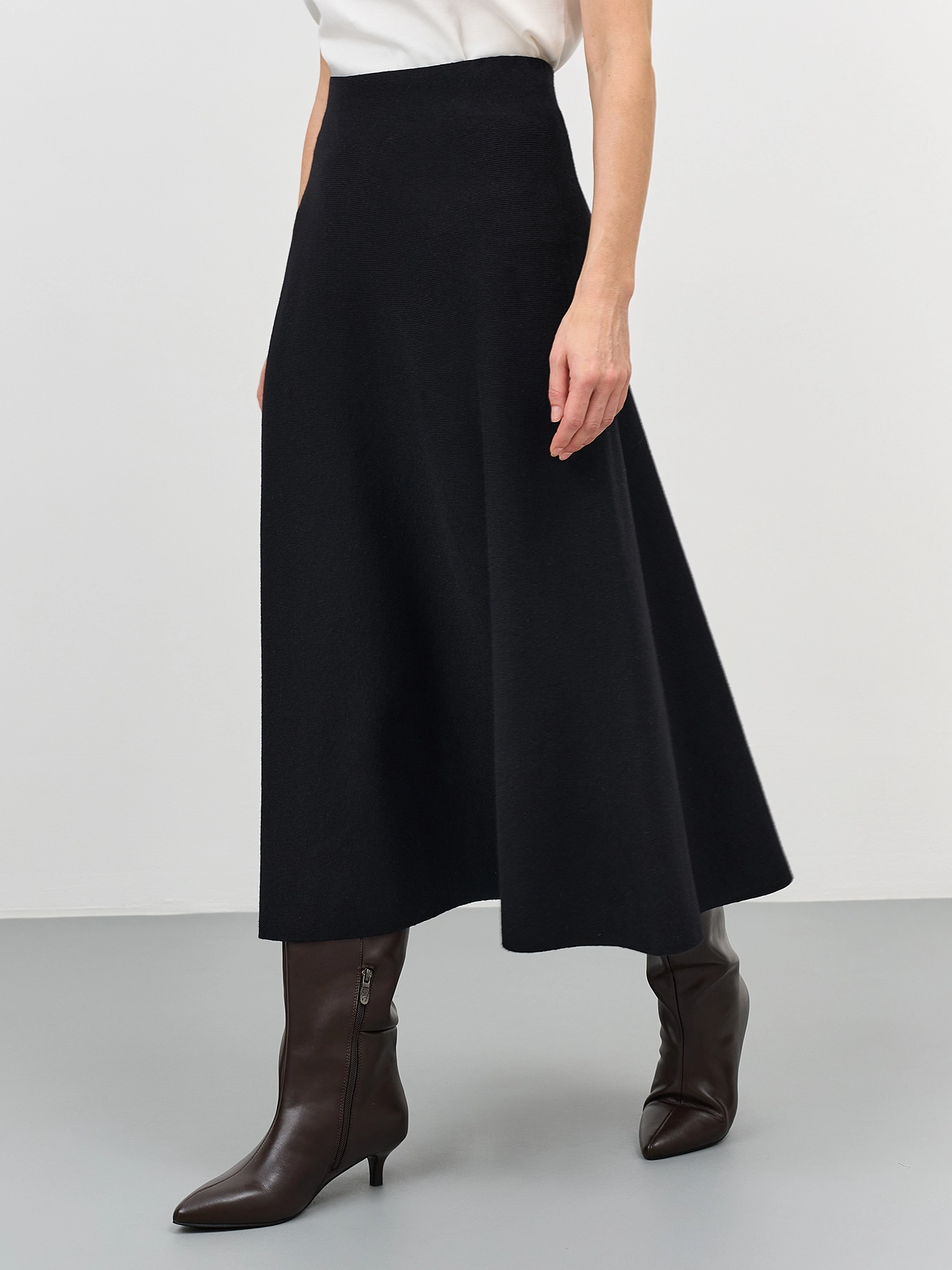 Трикотажная юбка-миди А-силуэта. Резинка по линии талии. В составе вискоза и шерсть.