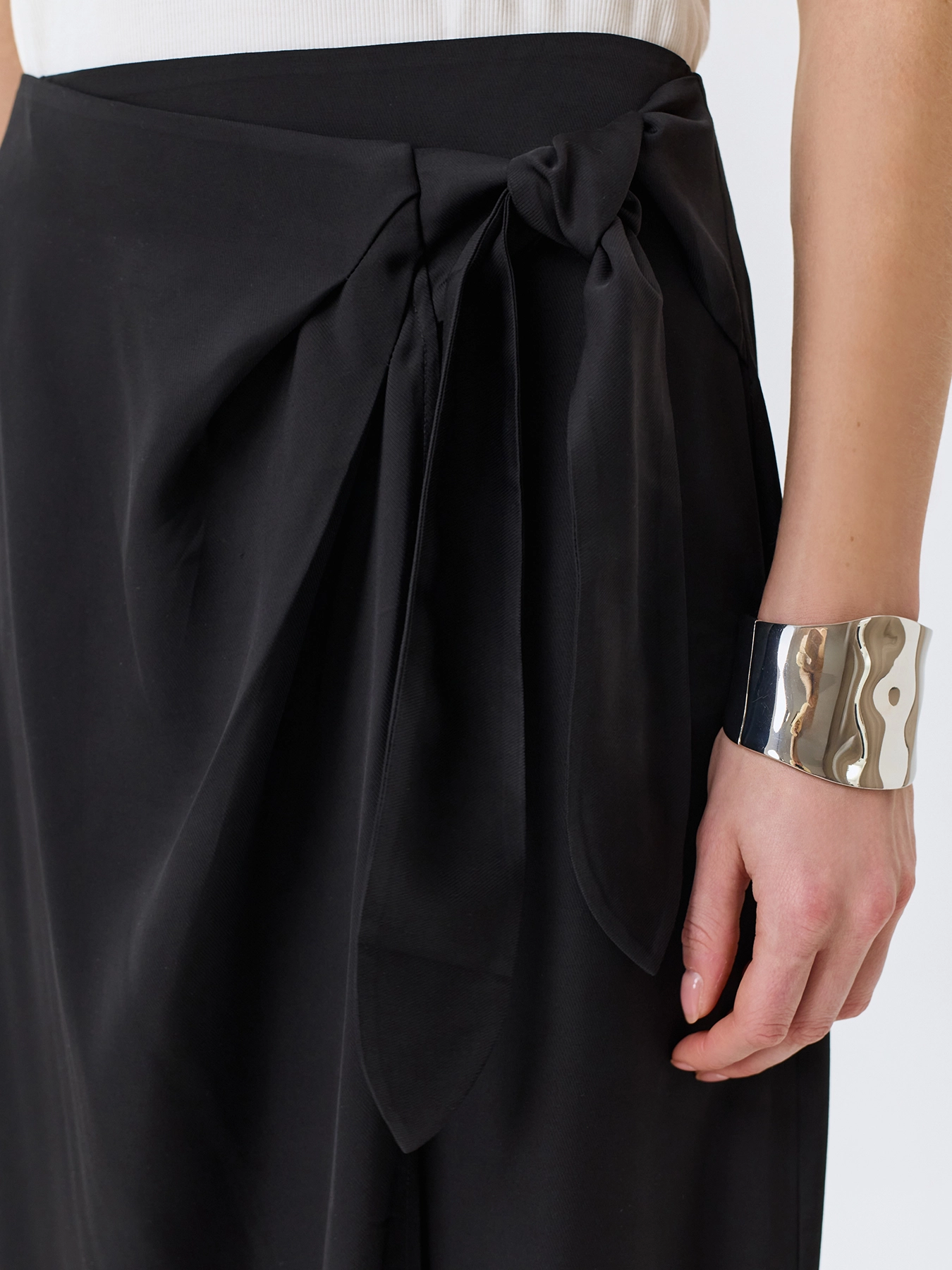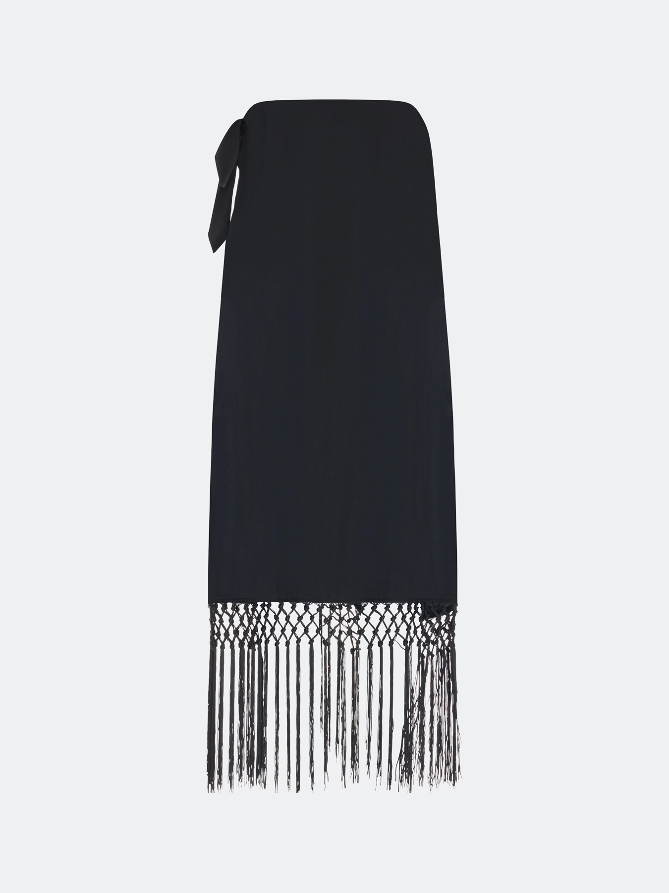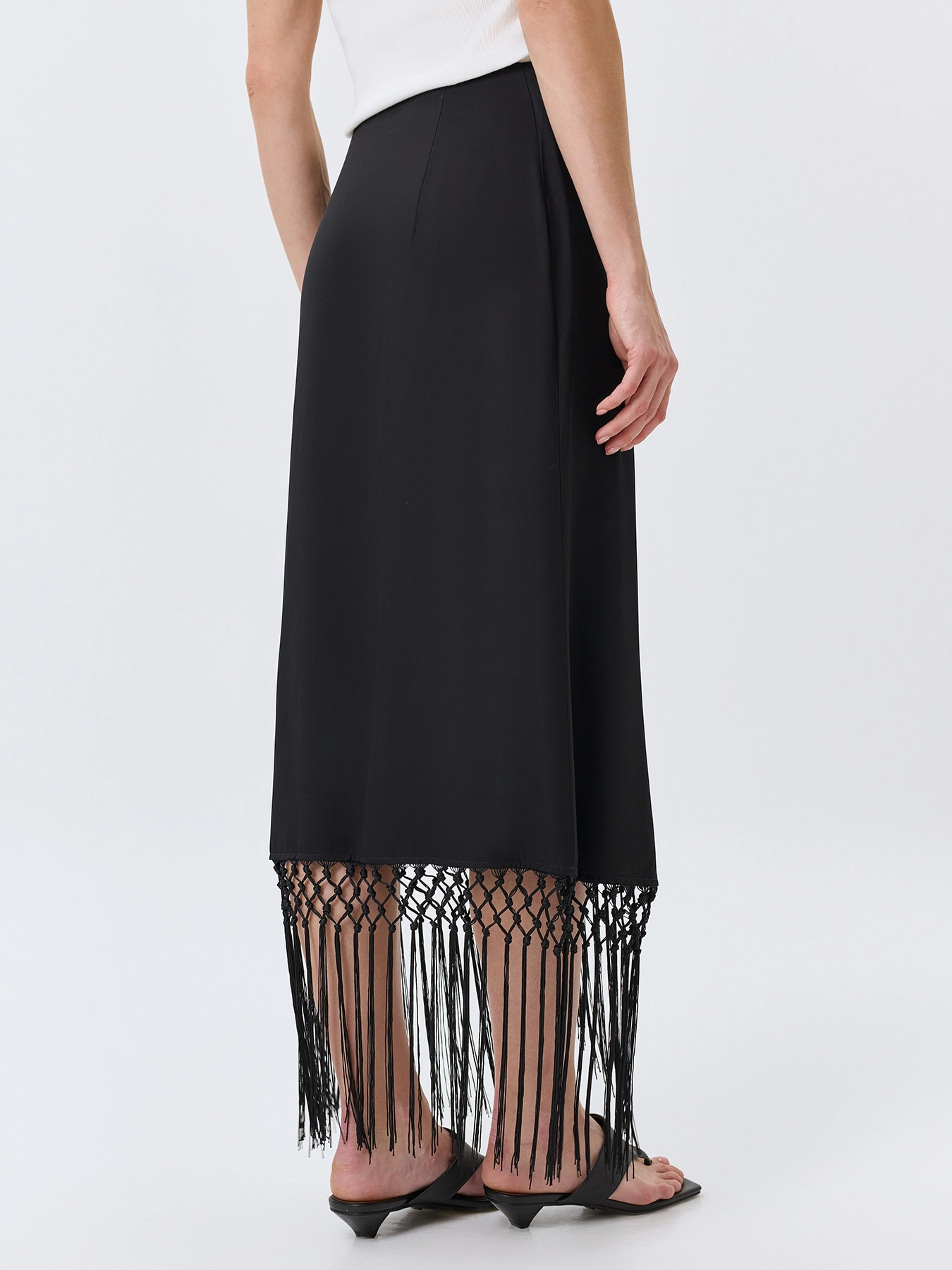 Юбка на запах с акцентной бахромой по низу. Прямой силуэт. Длина миди. Дополнена акцентным бантом и защипами по линии талии. В составе вискоза и район.