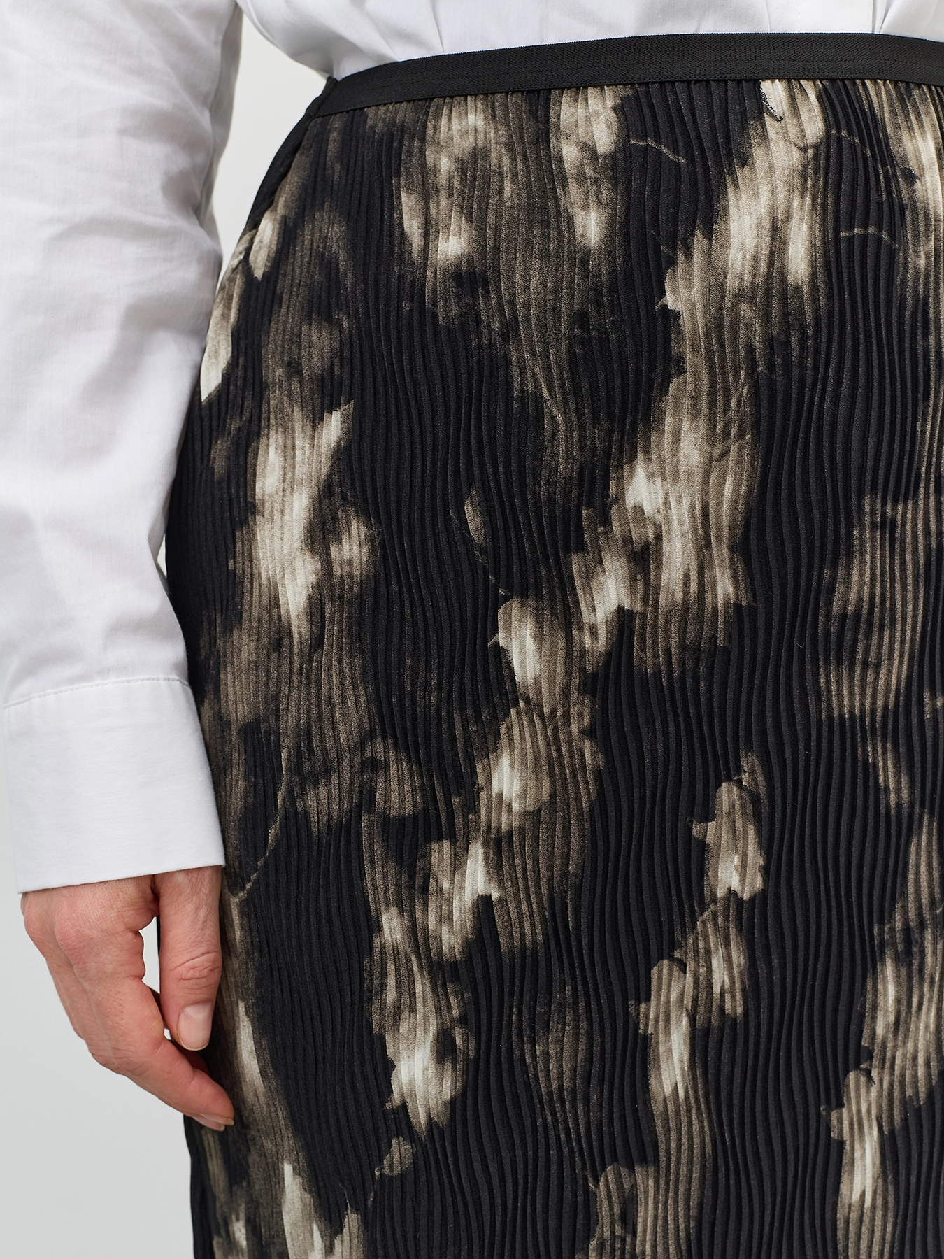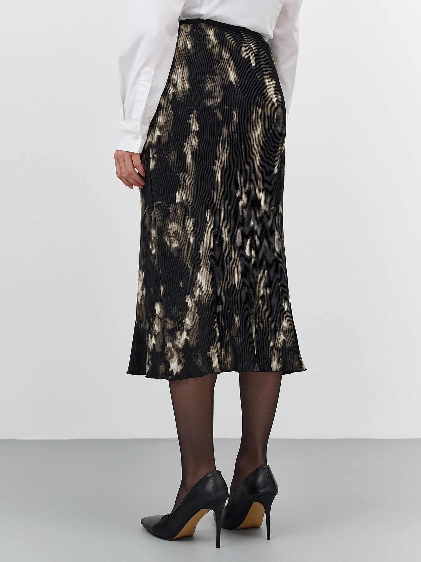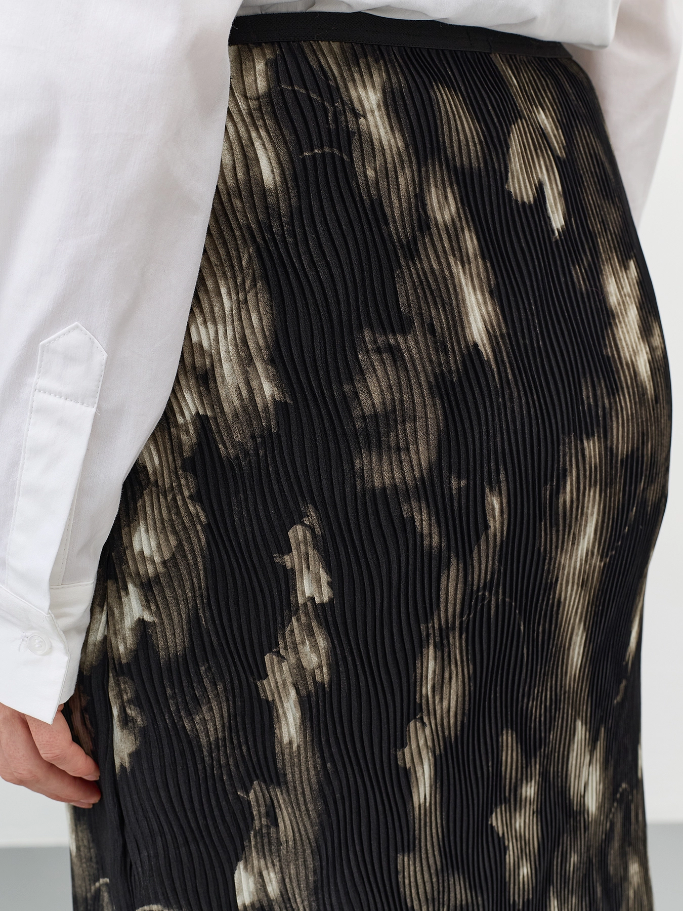 Юбка-плиссе из фактурной ткани с фантазийным принтом. Длина миди. А-силуэт. Оригинальная тонкая волнообразная плиссировка. Эластичный пояс