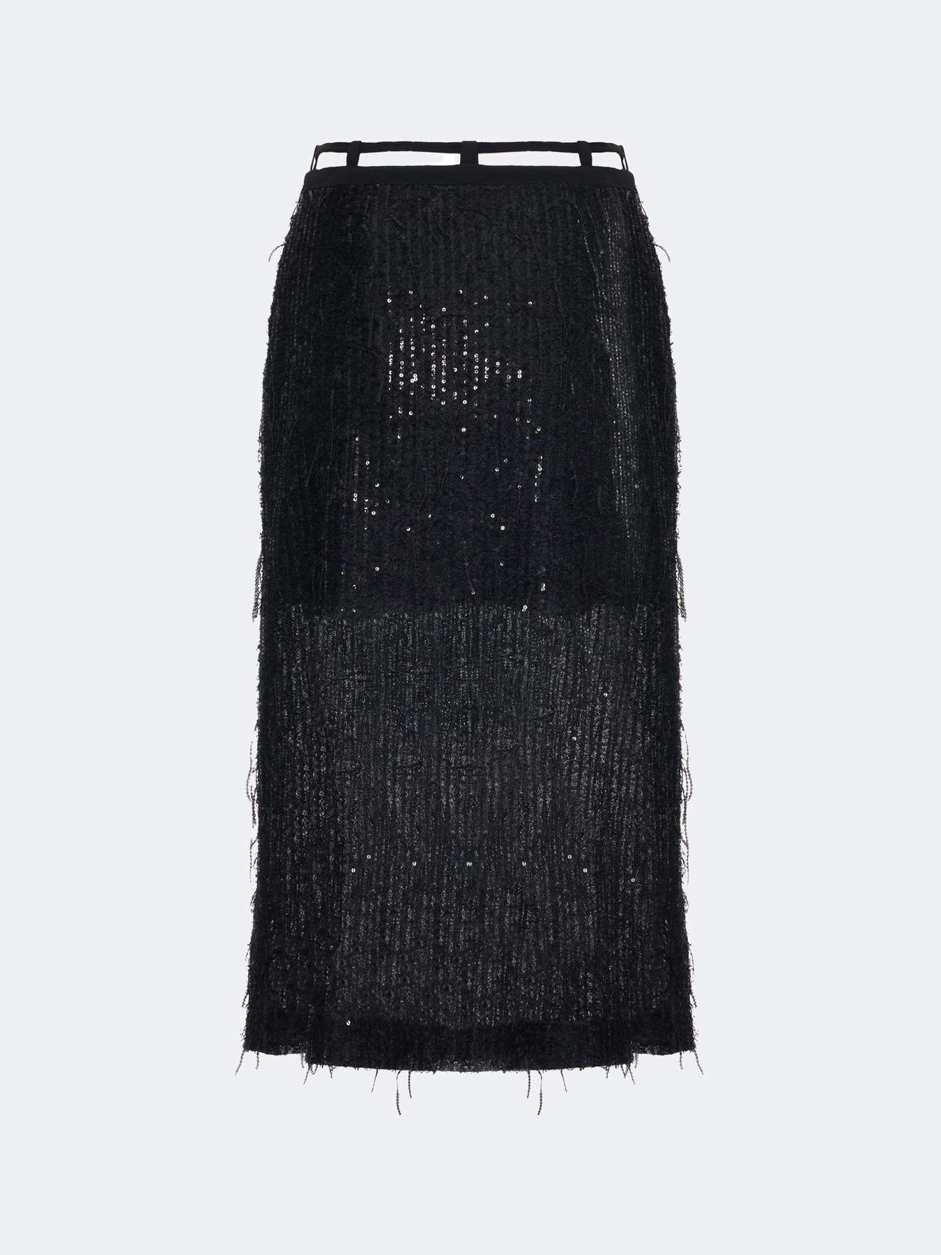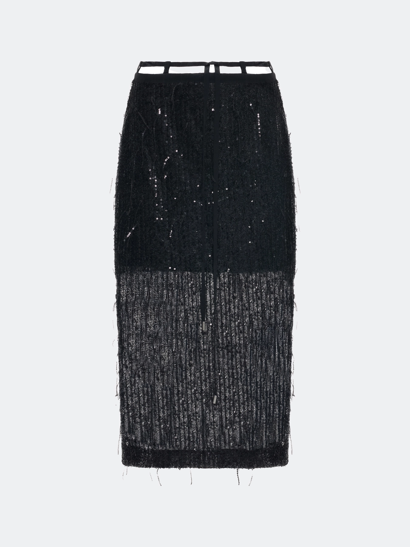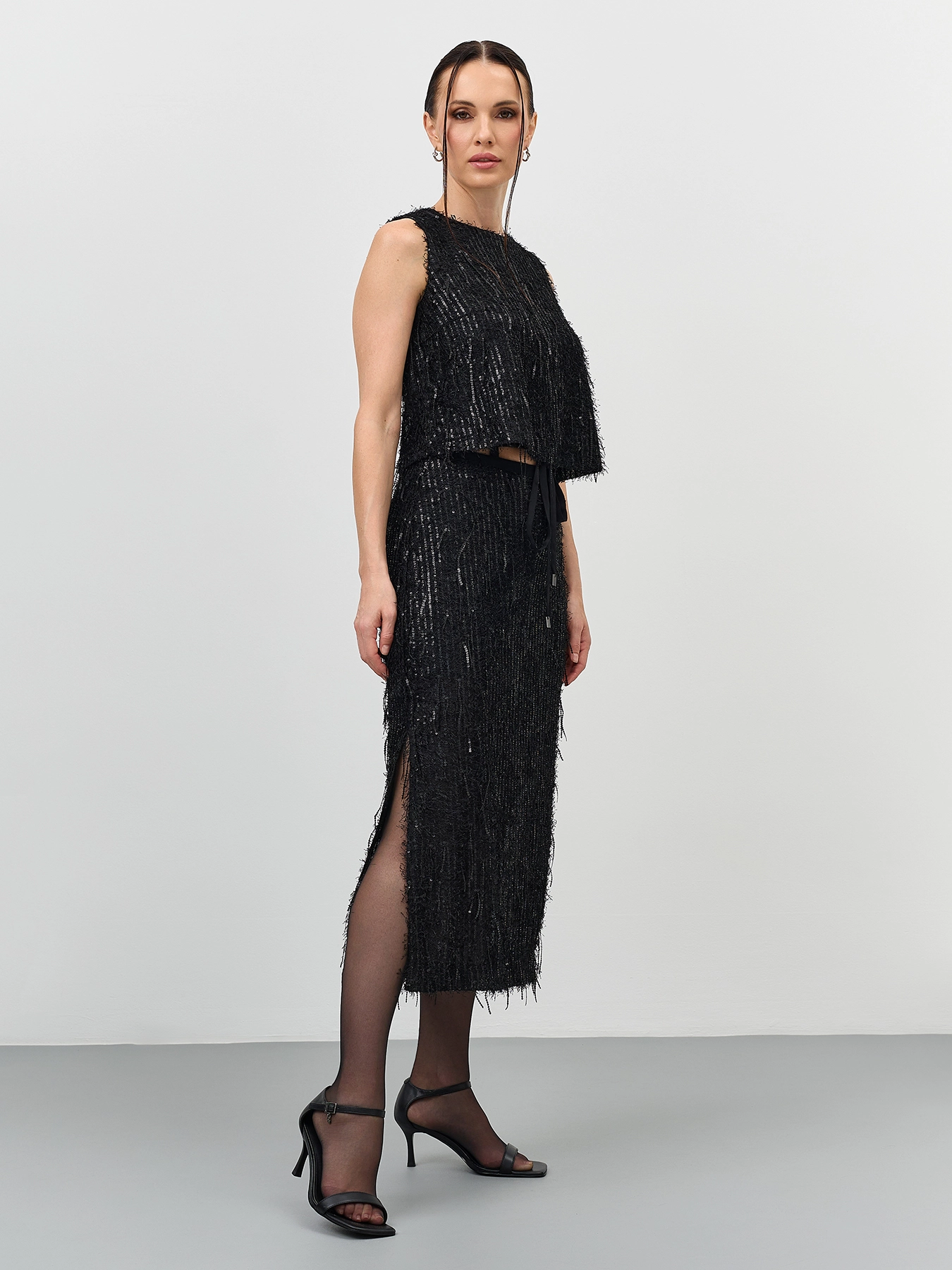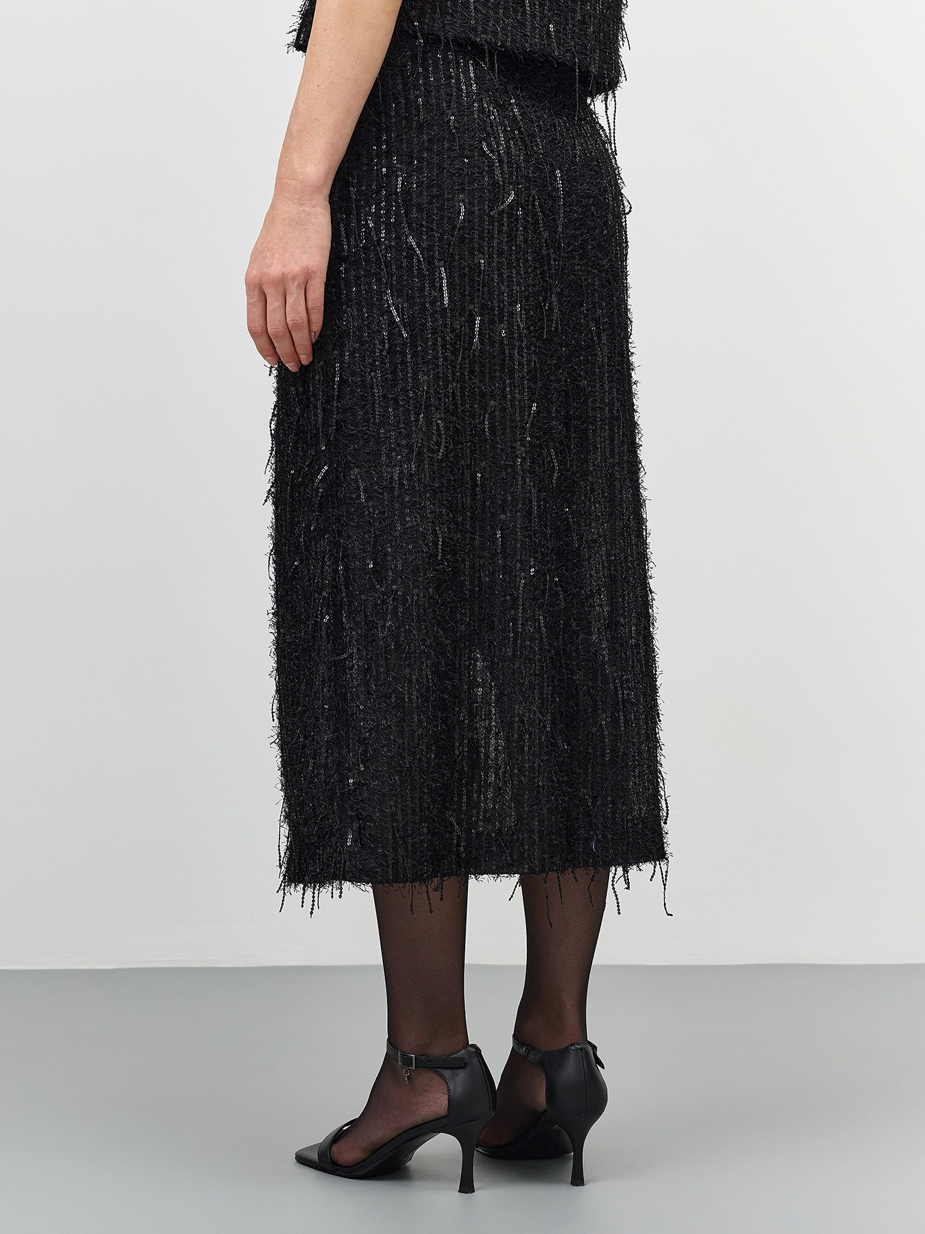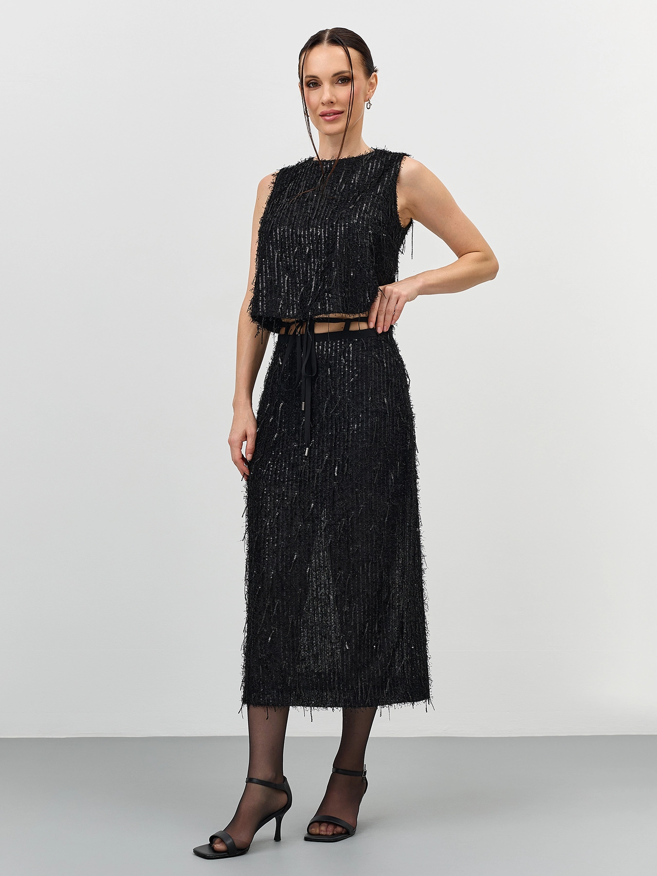 Юбка с пайетками и бахромой. Длина миди. Прямой силуэт. Дополнена подвесным тонким поясом на петлях. Застежка на молнию. Подкладка из 100% вискозы. Комплект с арт. 60325.