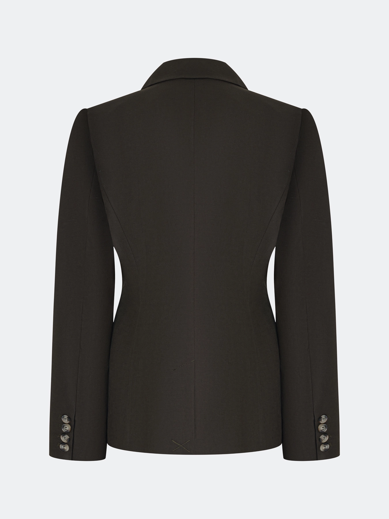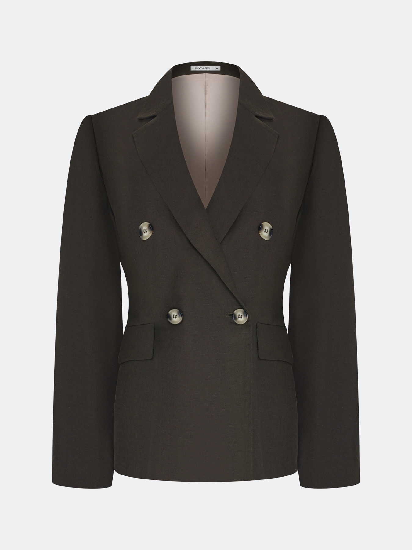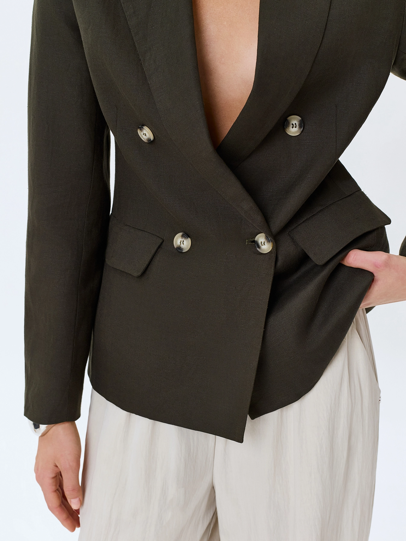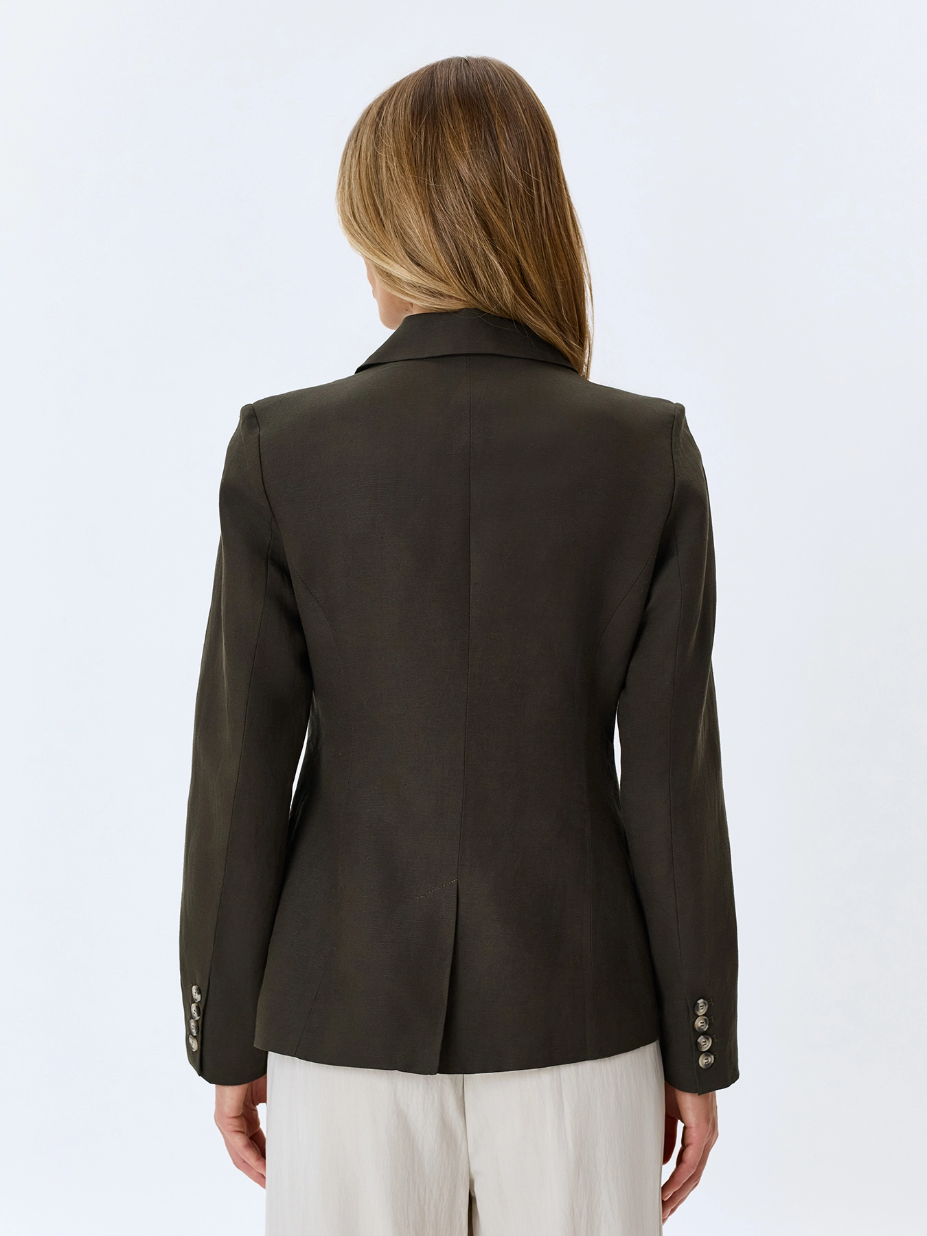 Двубортный жакет из смесового льна и вискозы. Полуприталенный силуэт. Классический английский воротник. Боковые карманы с листочками. Застежка на роговые пуговицы.
