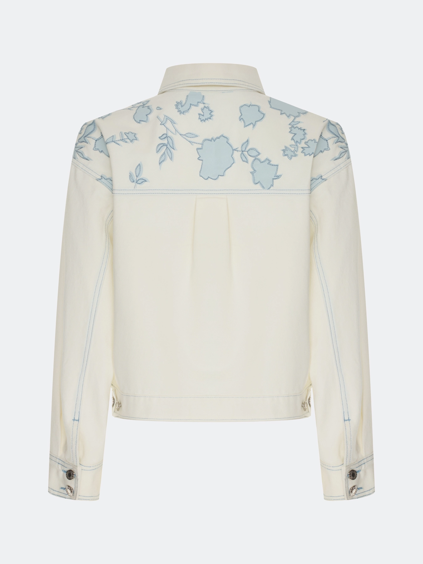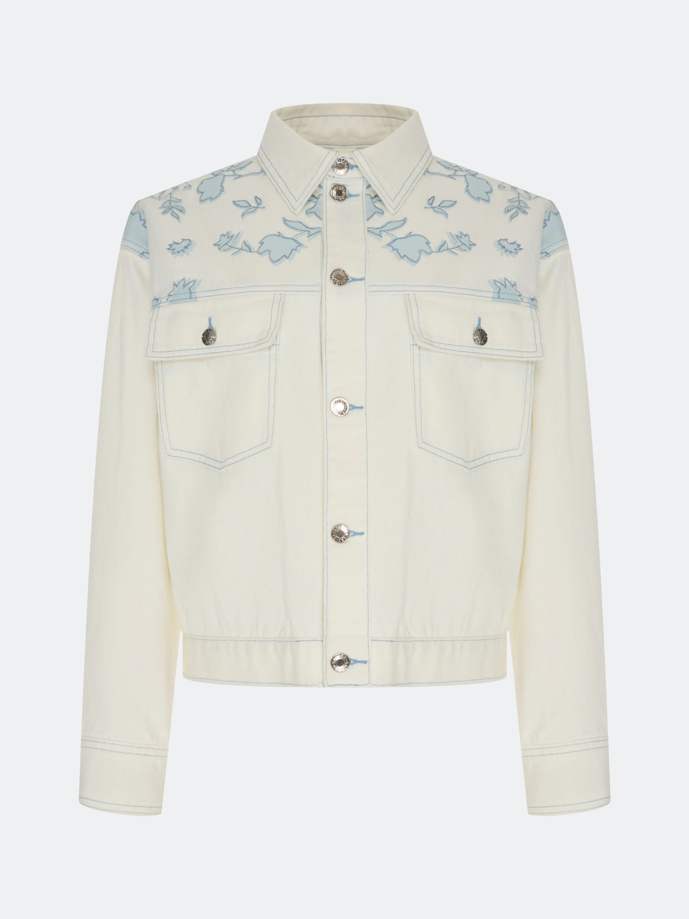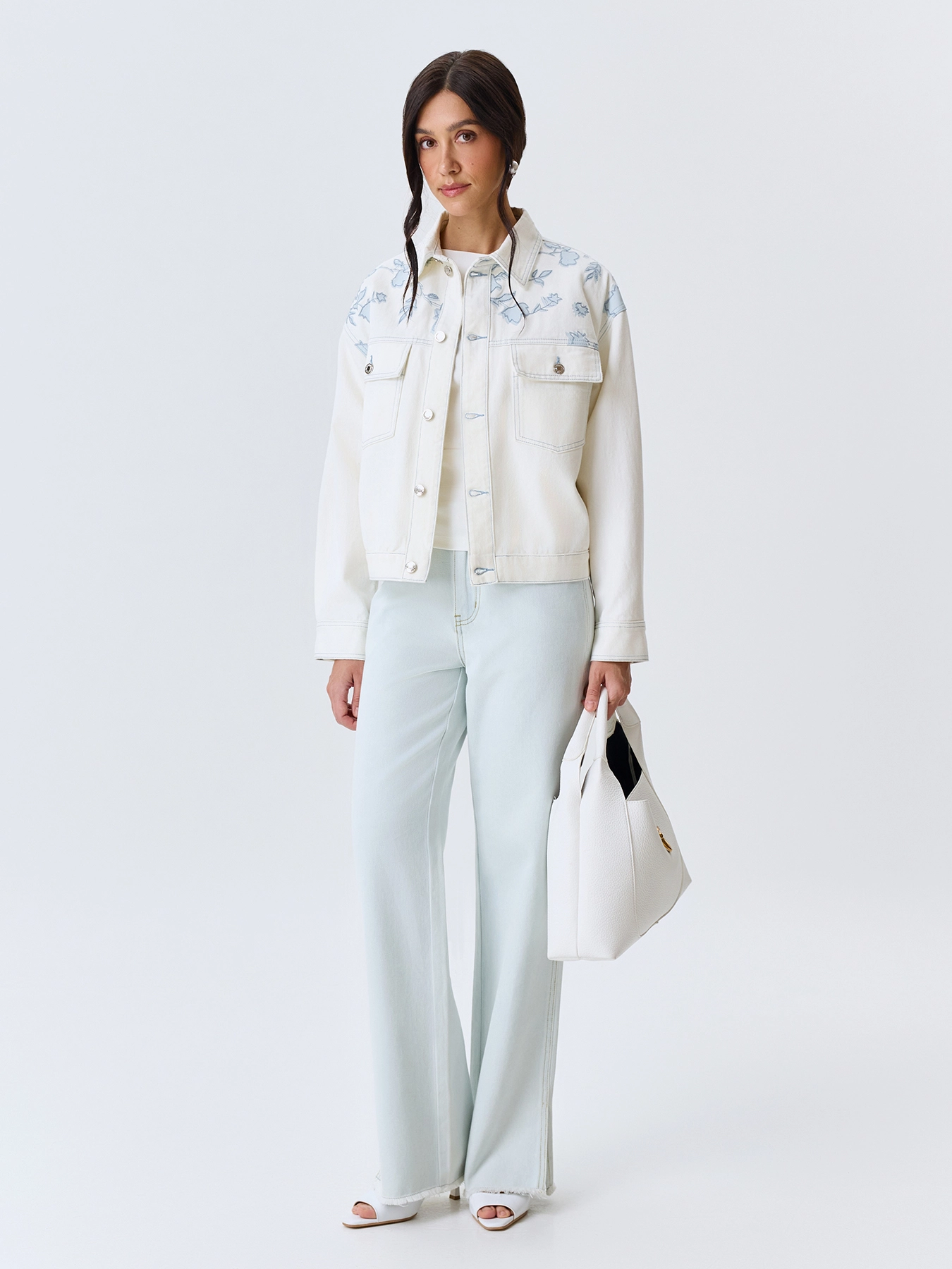 Джинсовый жакет с ярким флоральным принтом и вышивкой. Свободный силуэт. Застежка на пуговицы. Отложной воротник. Накладные нагрудные карманы с клапанами на пуговицах. Спущенная линия плеч. В составе хлопок.