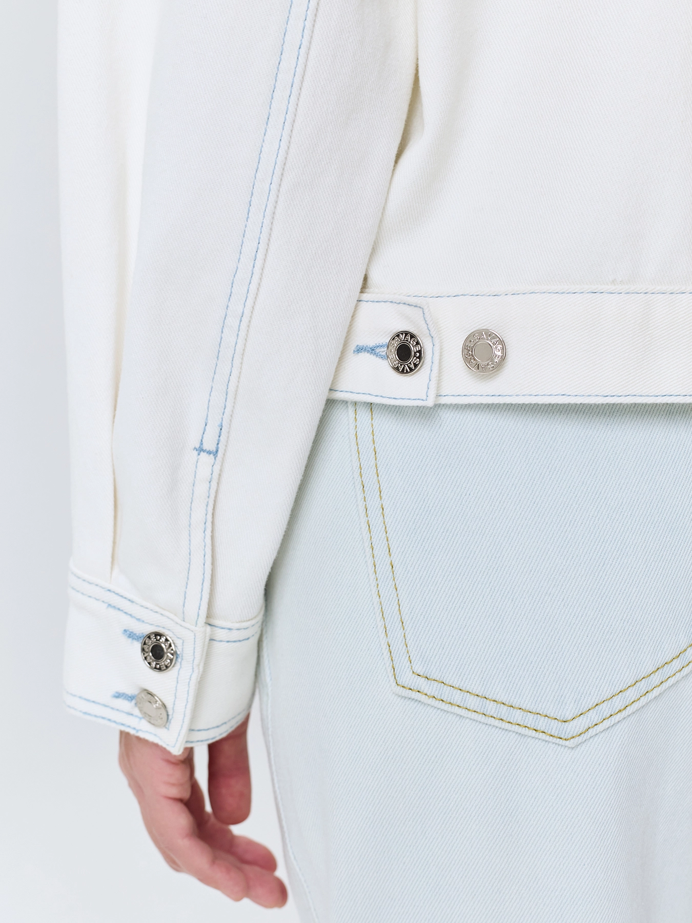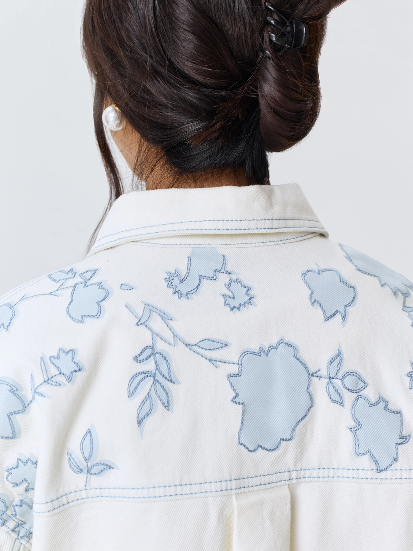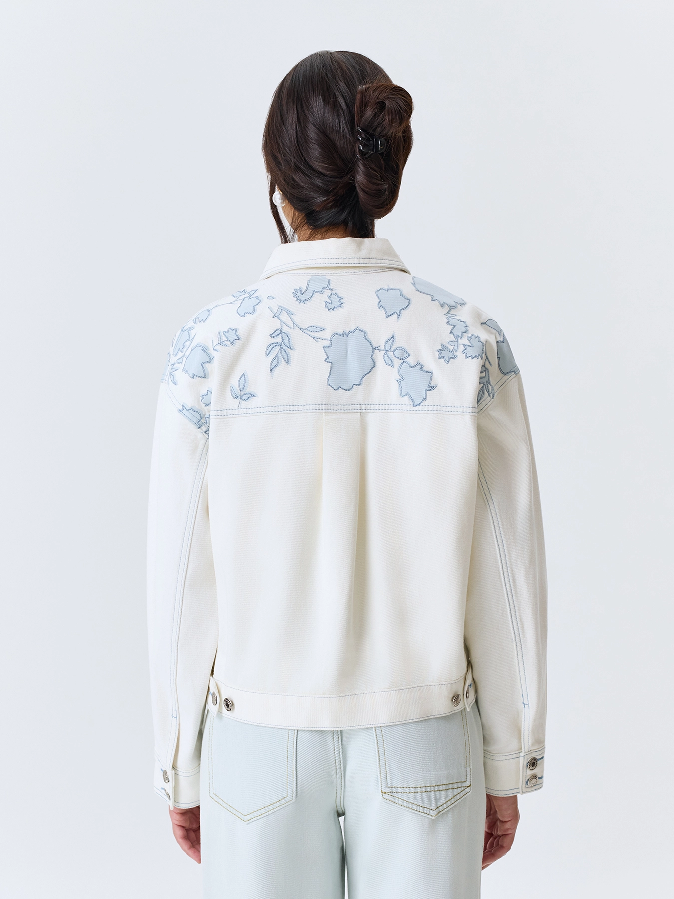 Джинсовый жакет с ярким флоральным принтом и вышивкой. Свободный силуэт. Застежка на пуговицы. Отложной воротник. Накладные нагрудные карманы с клапанами на пуговицах. Спущенная линия плеч. В составе хлопок.