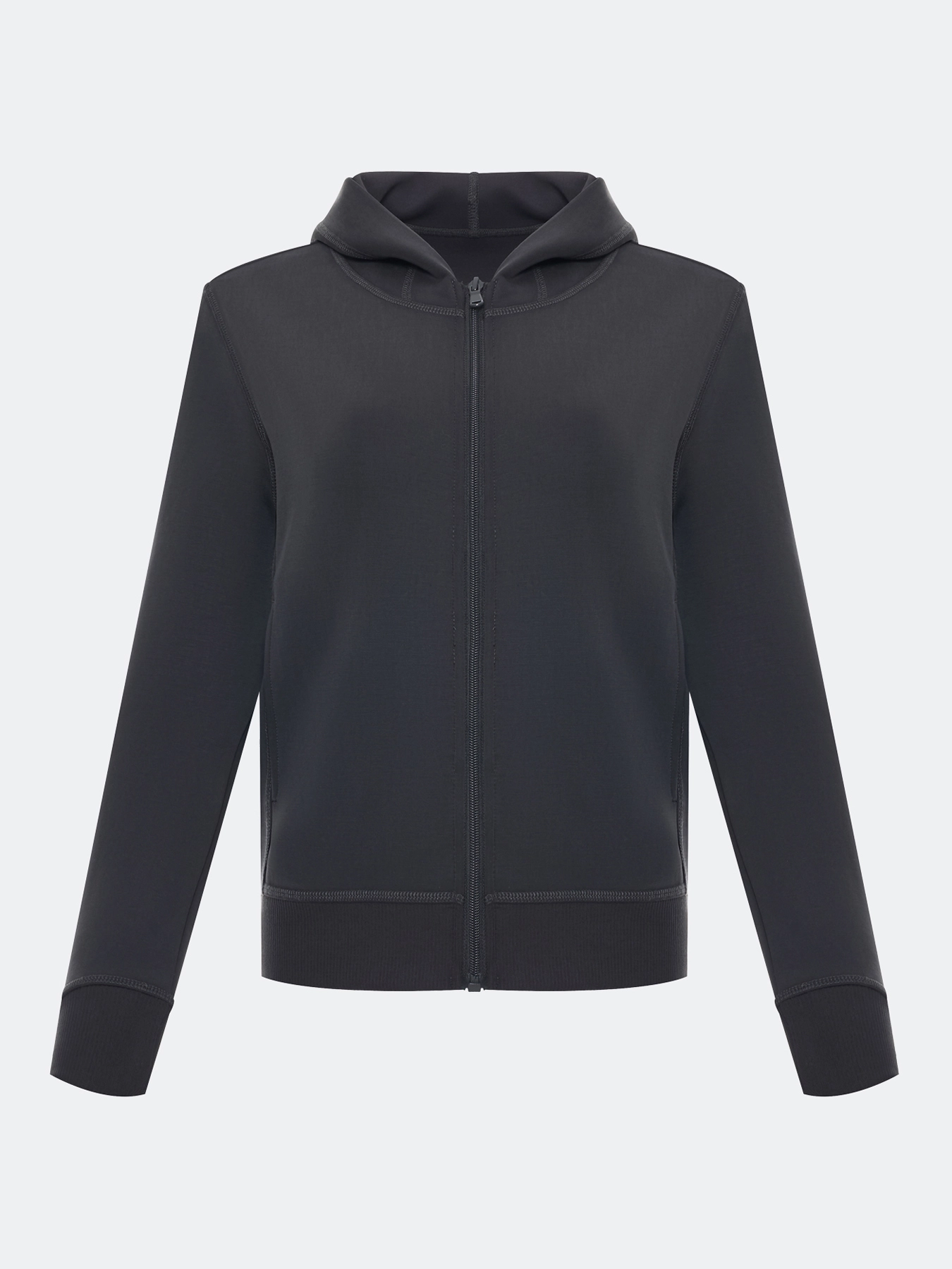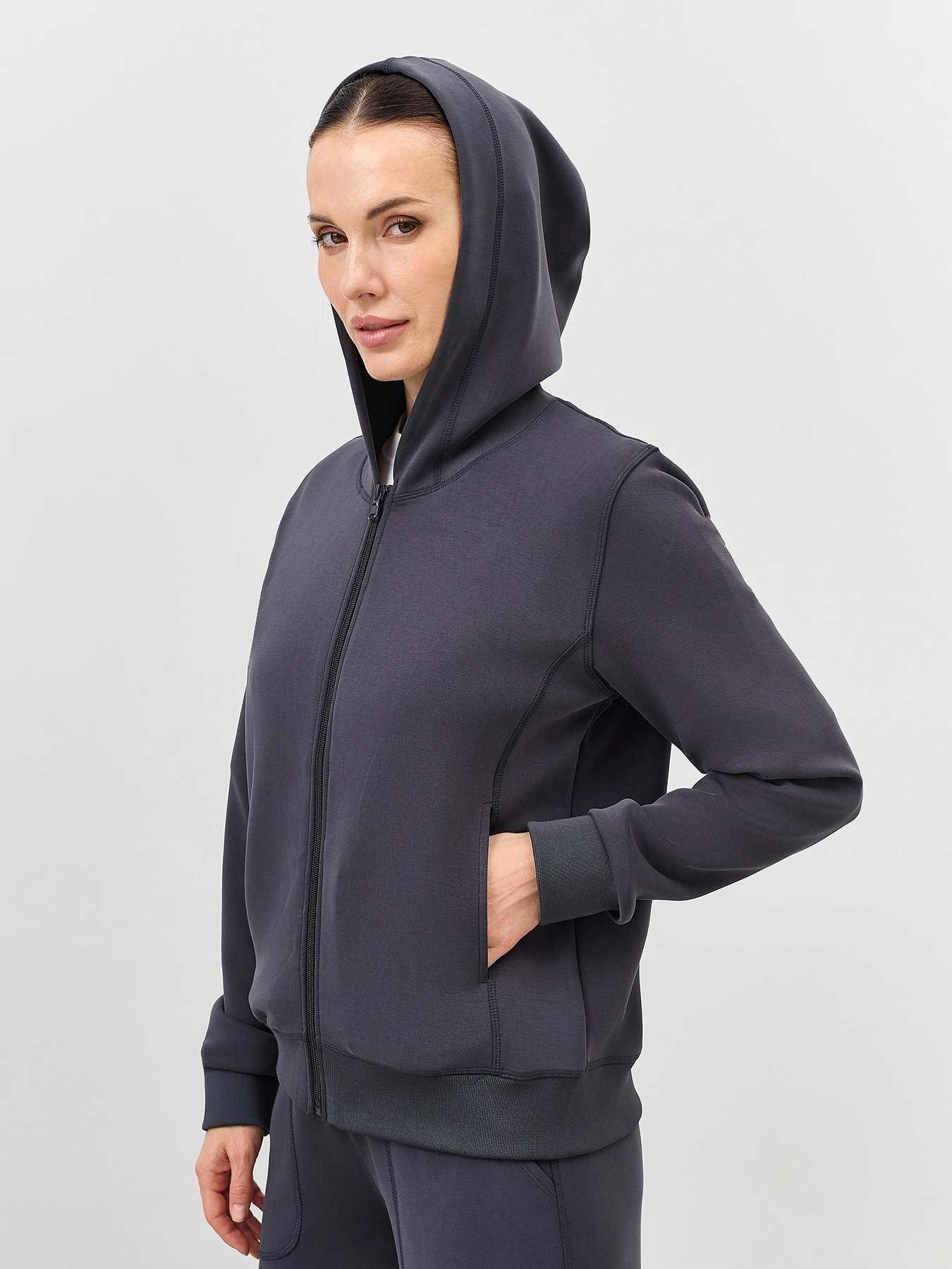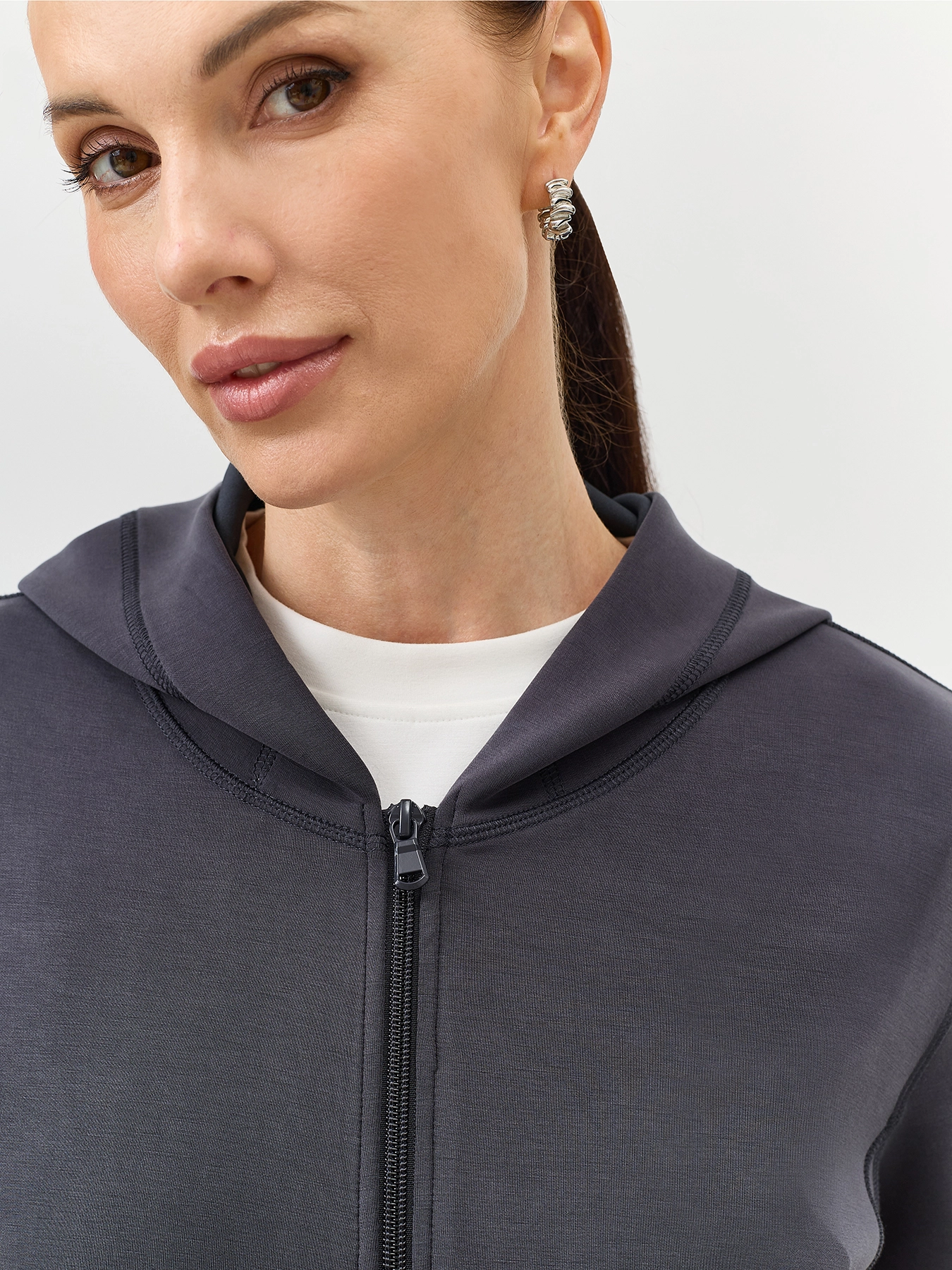 Худи из смесового трикотажного модала полуприталенного силуэта. Воротник стойка дополнен капюшоном. Застежка на молнию. Манжеты по низу рукавов и изделия. Деликатная отстрочка в тон. Комплект с арт. 60863.