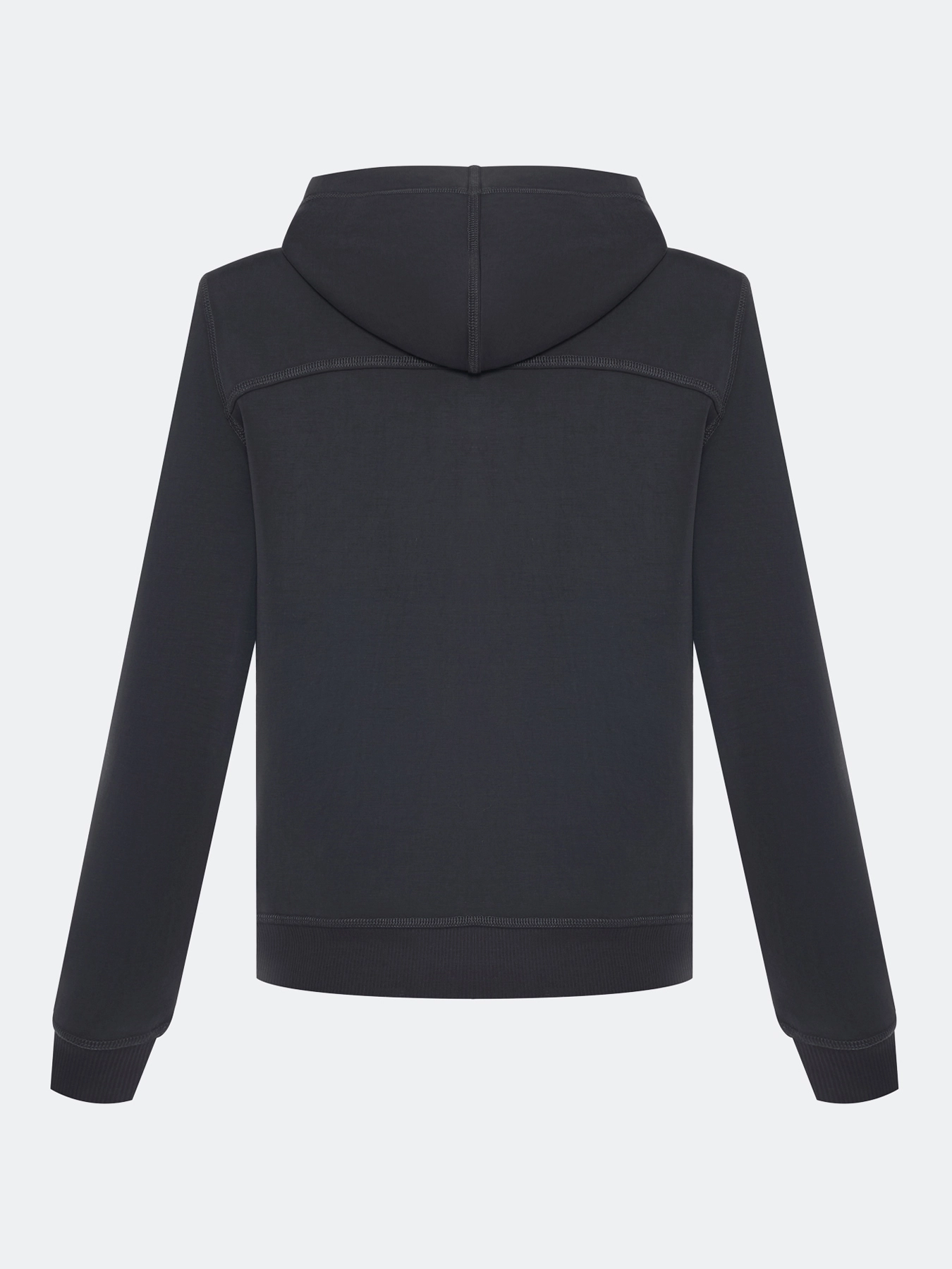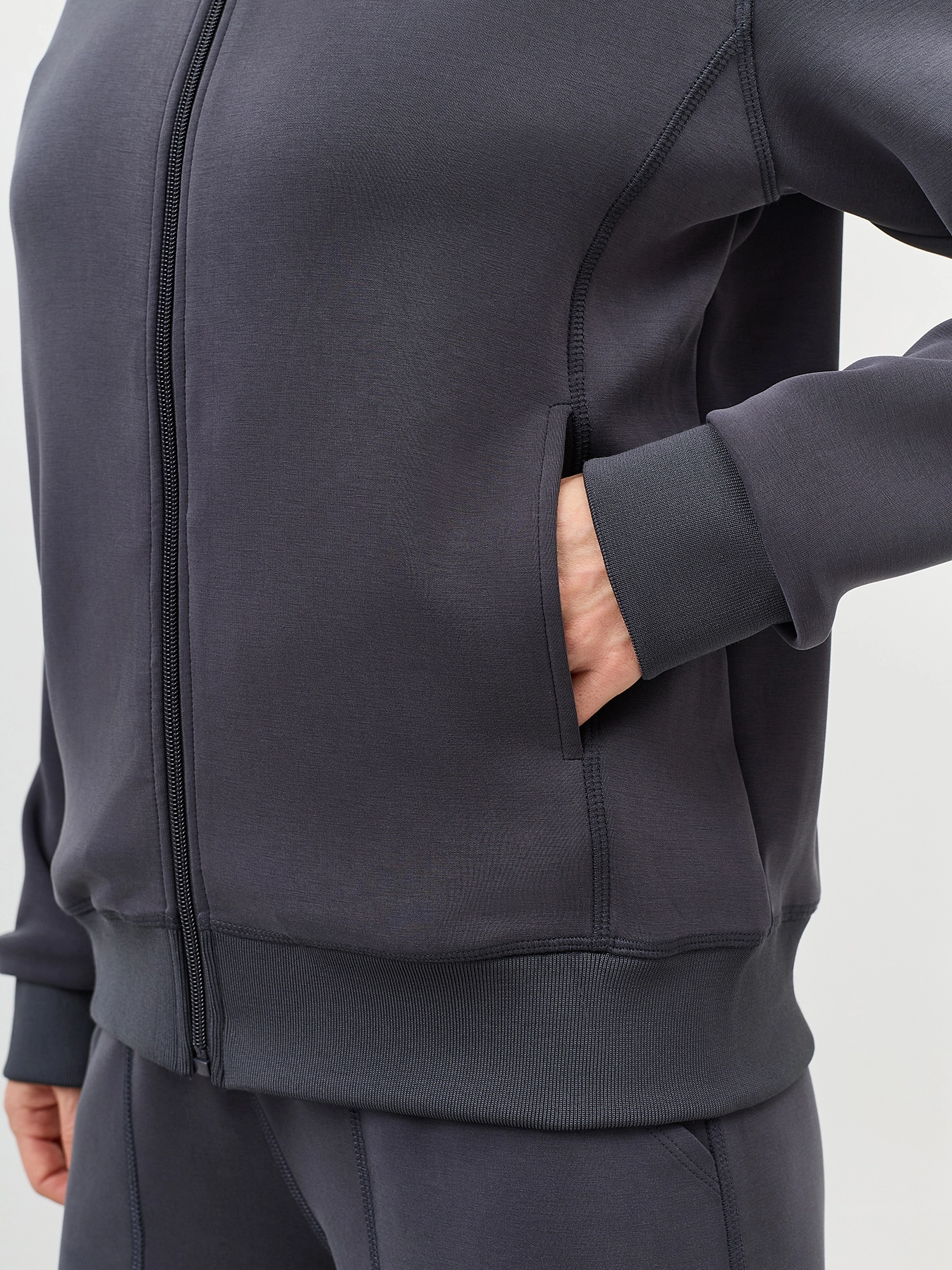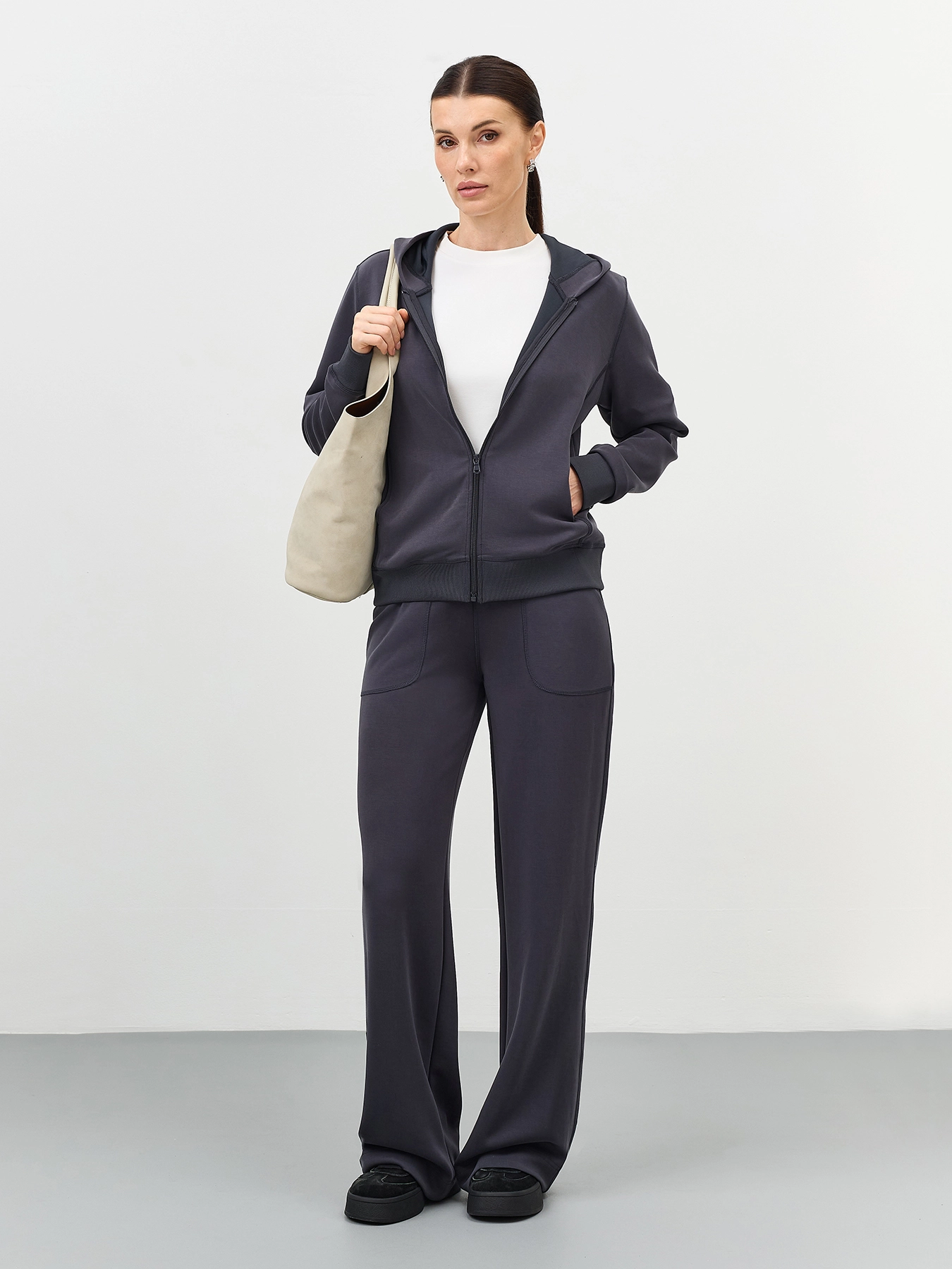Худи из смесового трикотажного модала полуприталенного силуэта. Воротник стойка дополнен капюшоном. Застежка на молнию. Манжеты по низу рукавов и изделия. Деликатная отстрочка в тон. Комплект с арт. 60863.