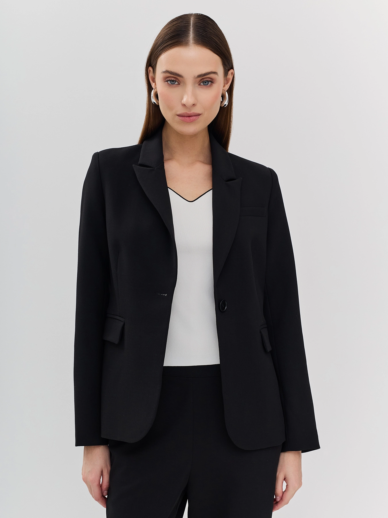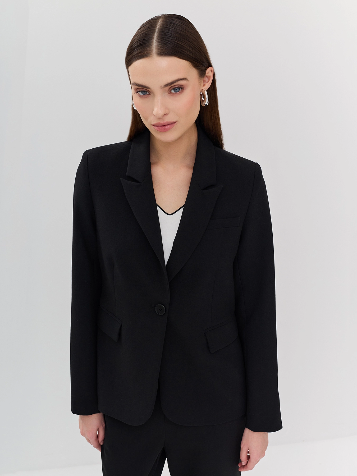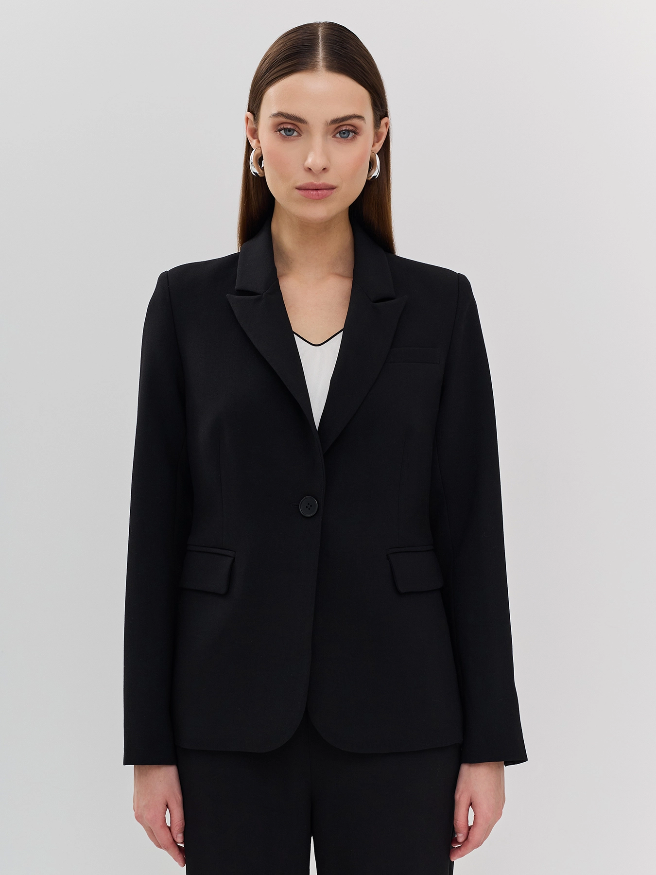 Классический блейзер с вискозой в составе. Английский воротник. Прямой силуэт. Боковые карманы с клапанами. Застежка на одну пуговицу. Комплект с арт. 60401.