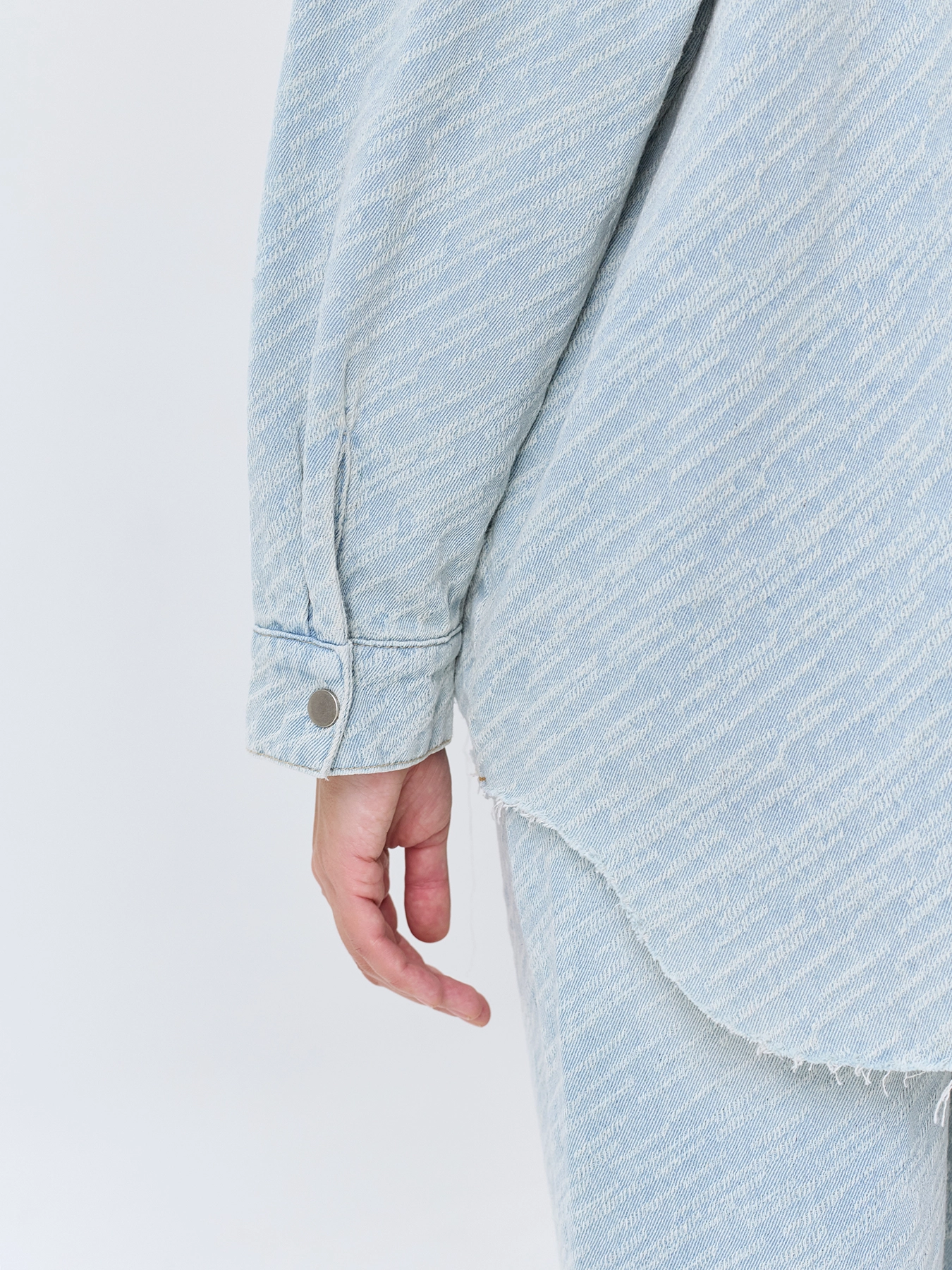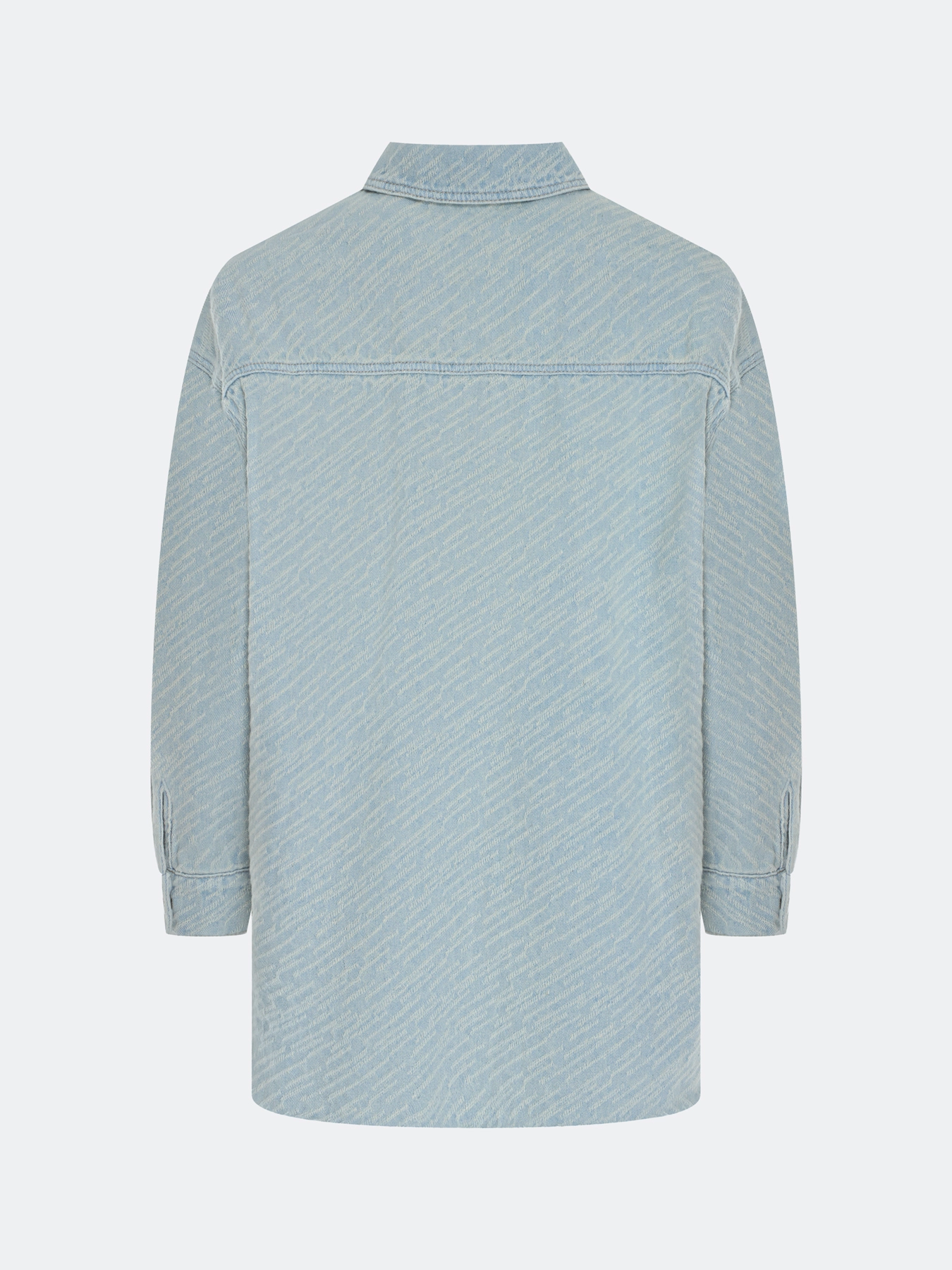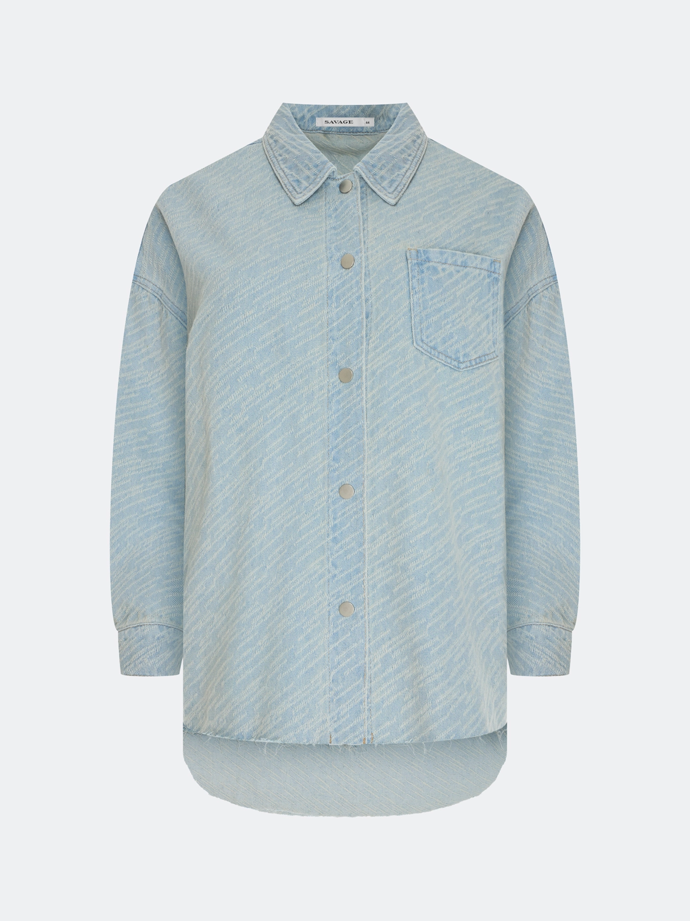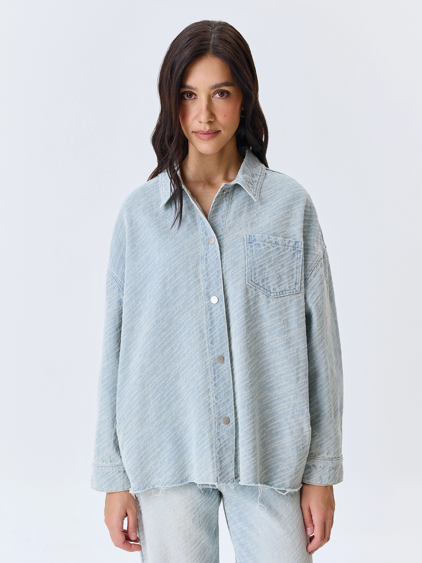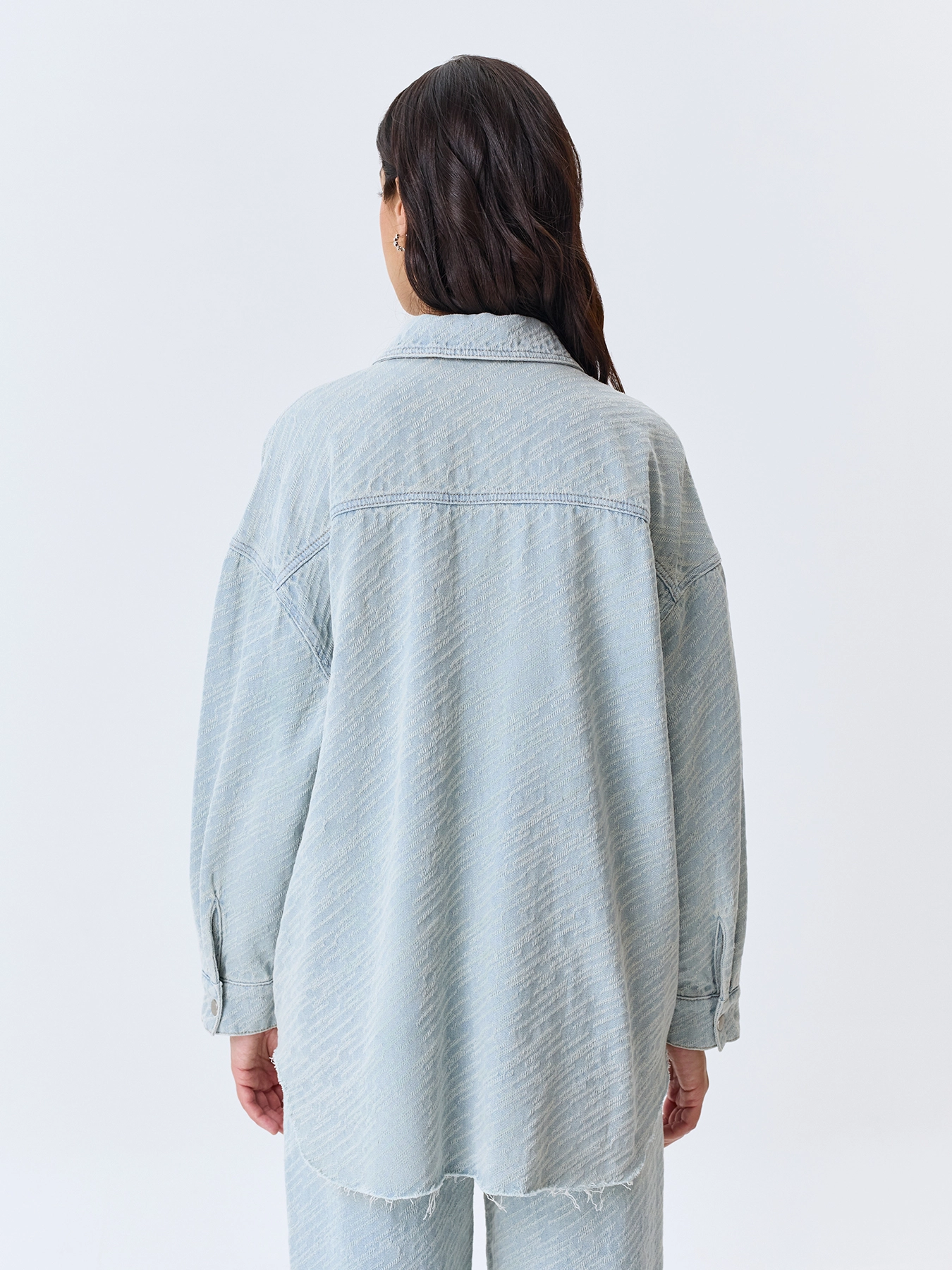 Жаккардовая джинсовая рубашка свободного силуэта. Спущенная линия плеч. Отложной воротник. Застежка на пуговицы. Накладной нагрудный карман. Спинка немного удлинена. Длинные втачные рукава с манжетами по низу. Дополнена необработанной линией низа. В составе хлопок. Комплект с 63644.