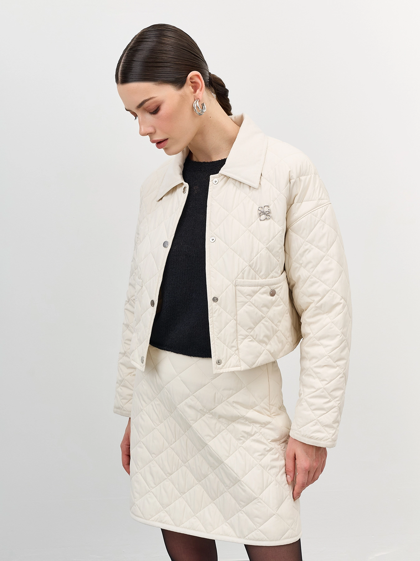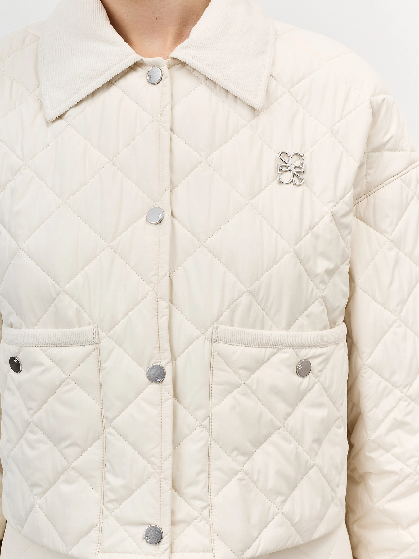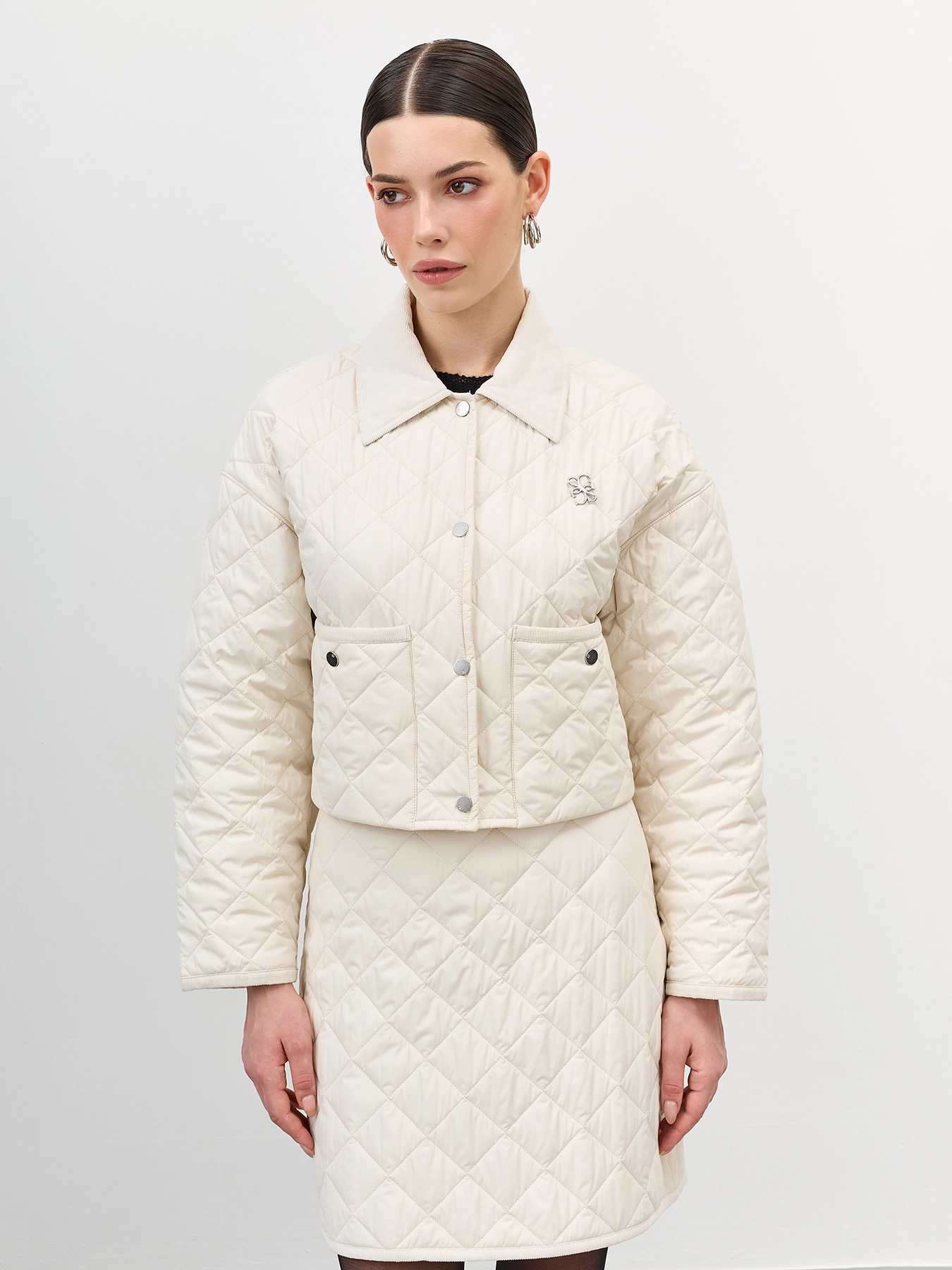 Стеганый укороченный жакет прямого силуэта. Ромбовидная стежка. Отложной воротник. Застежка на металлические кнопки. Накладные боковые карманы на кнопках. Спущенная линия плеч. Комплект с арт. арт. 60523.