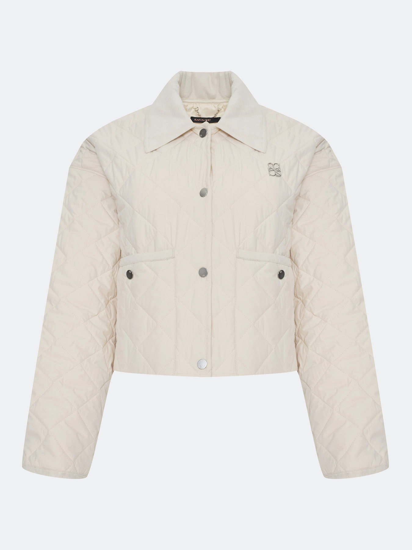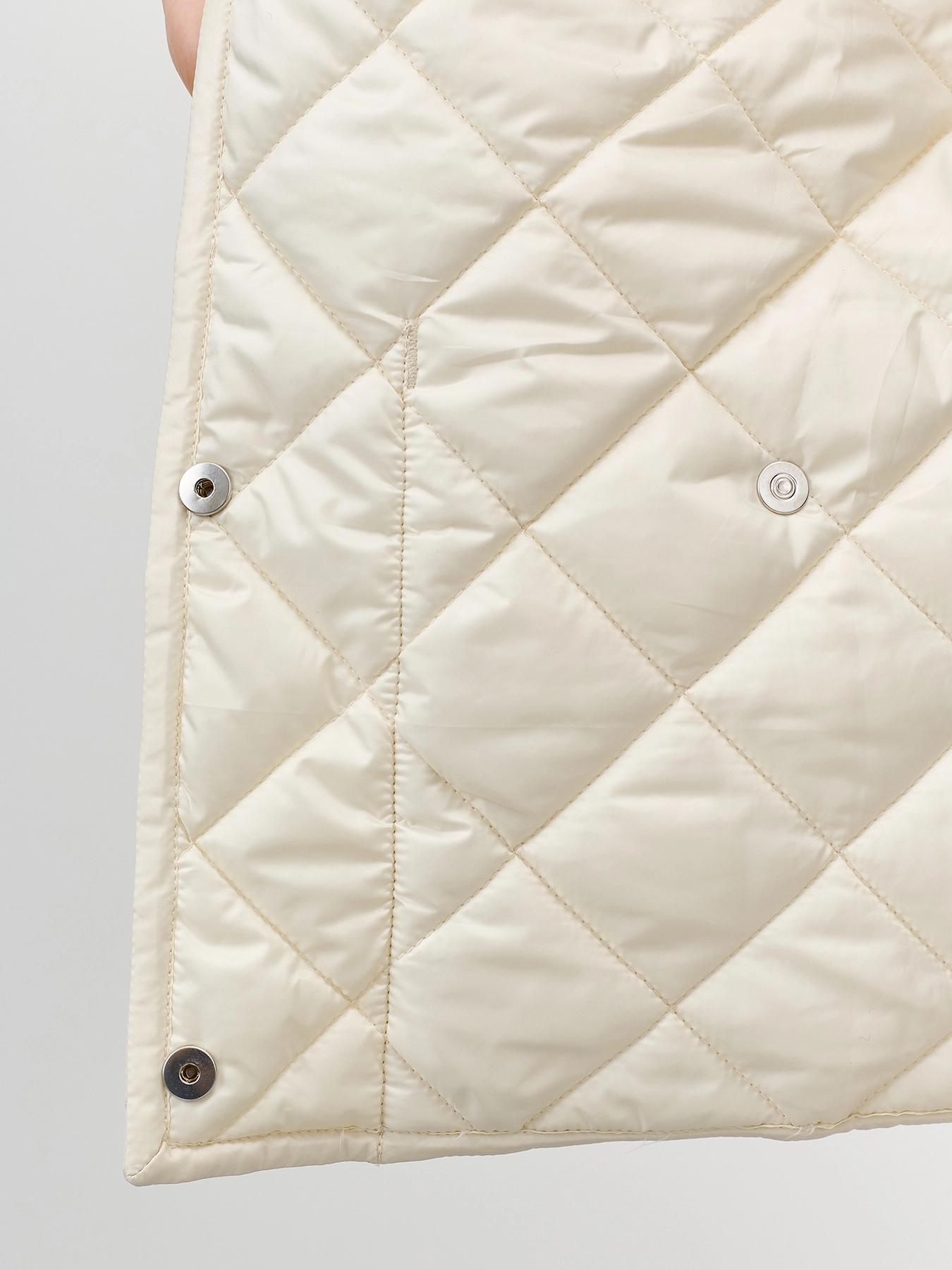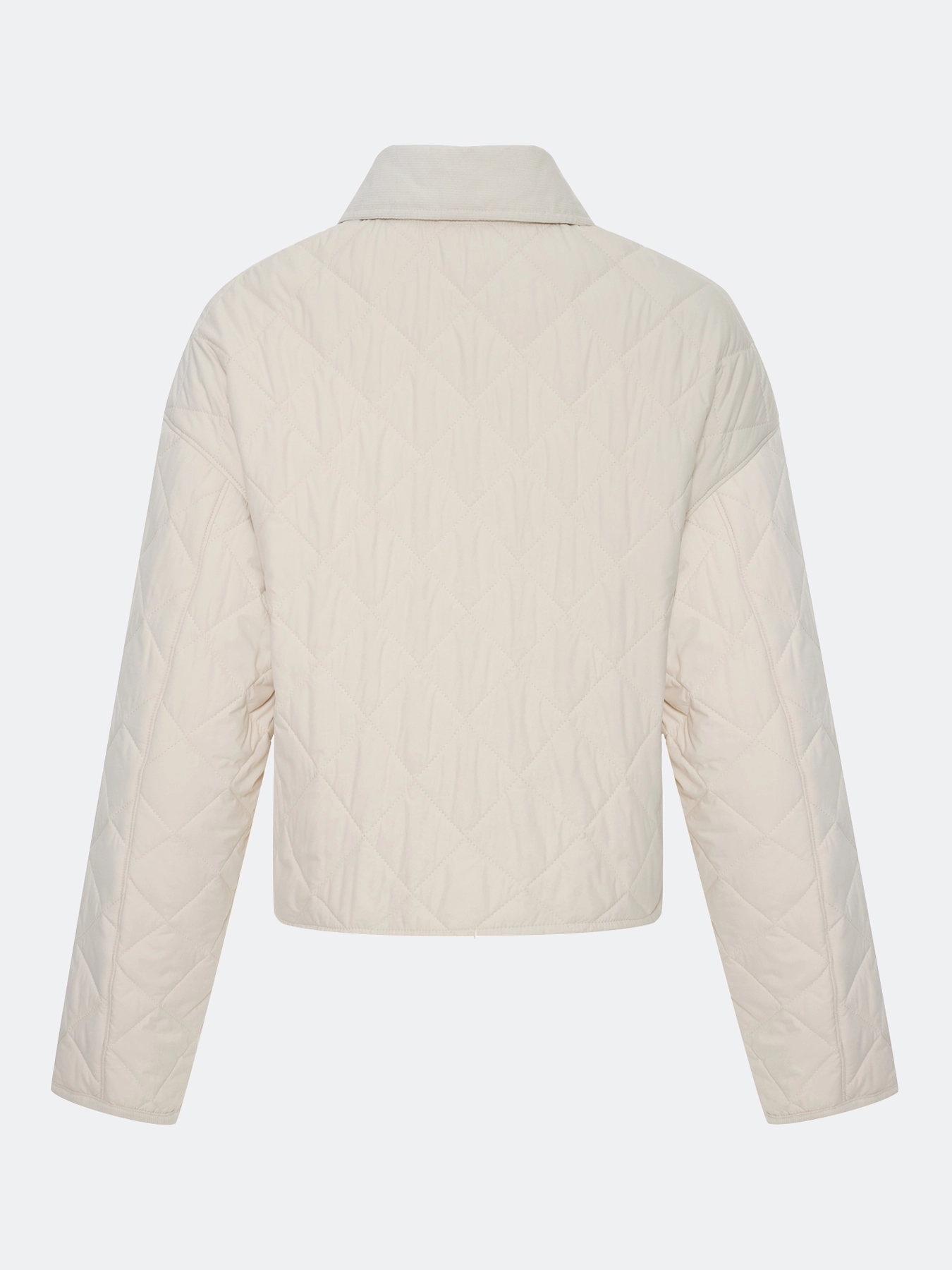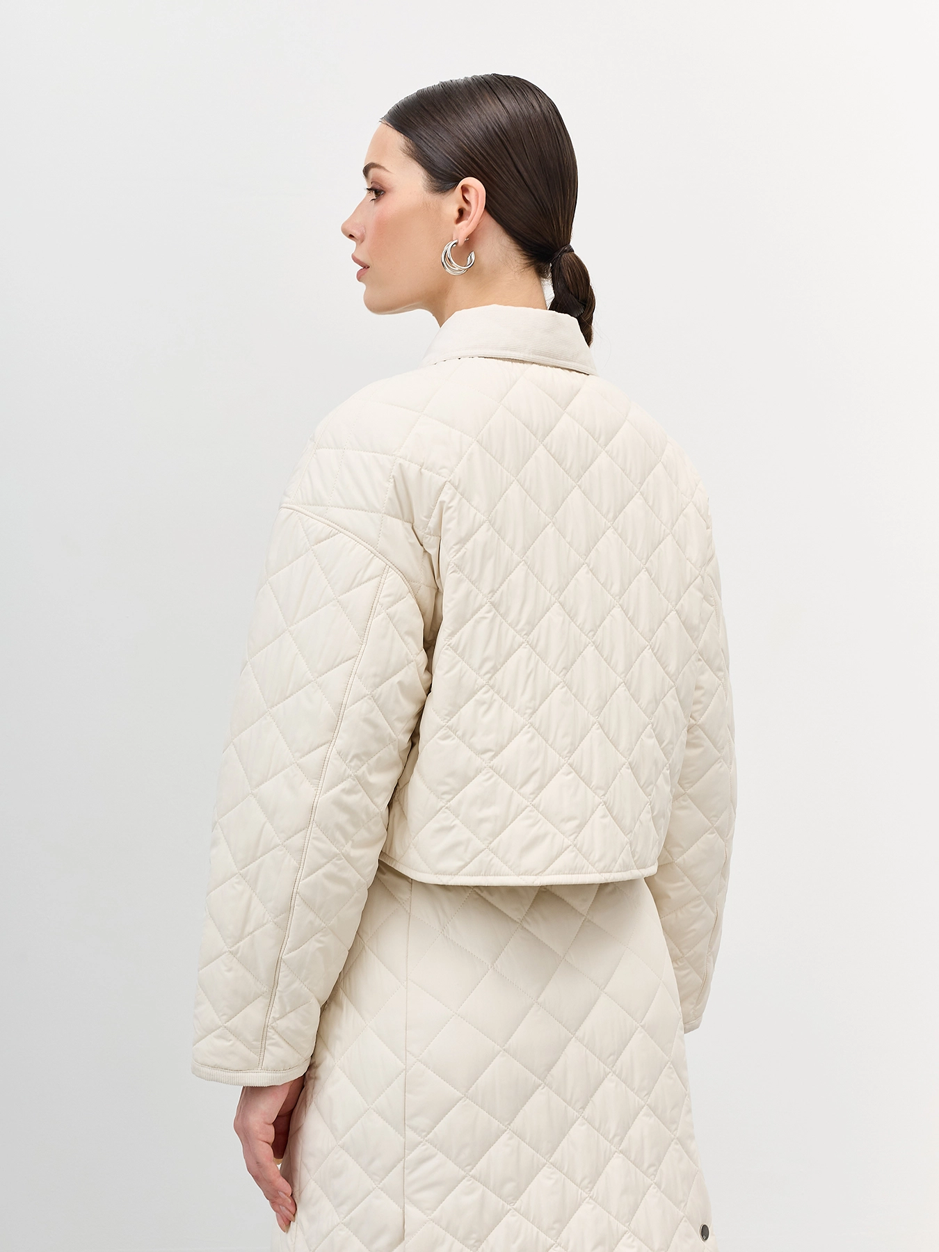 Стеганый укороченный жакет прямого силуэта. Ромбовидная стежка. Отложной воротник. Застежка на металлические кнопки. Накладные боковые карманы на кнопках. Спущенная линия плеч. Комплект с арт. арт. 60523.