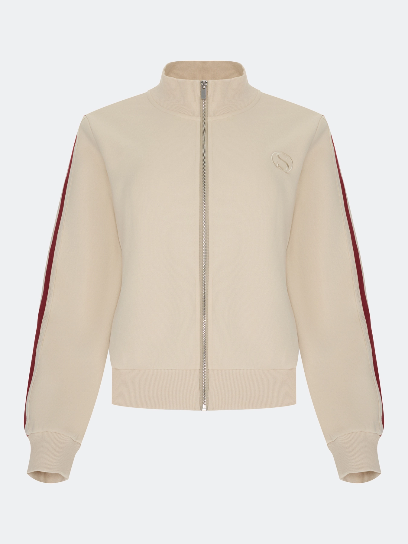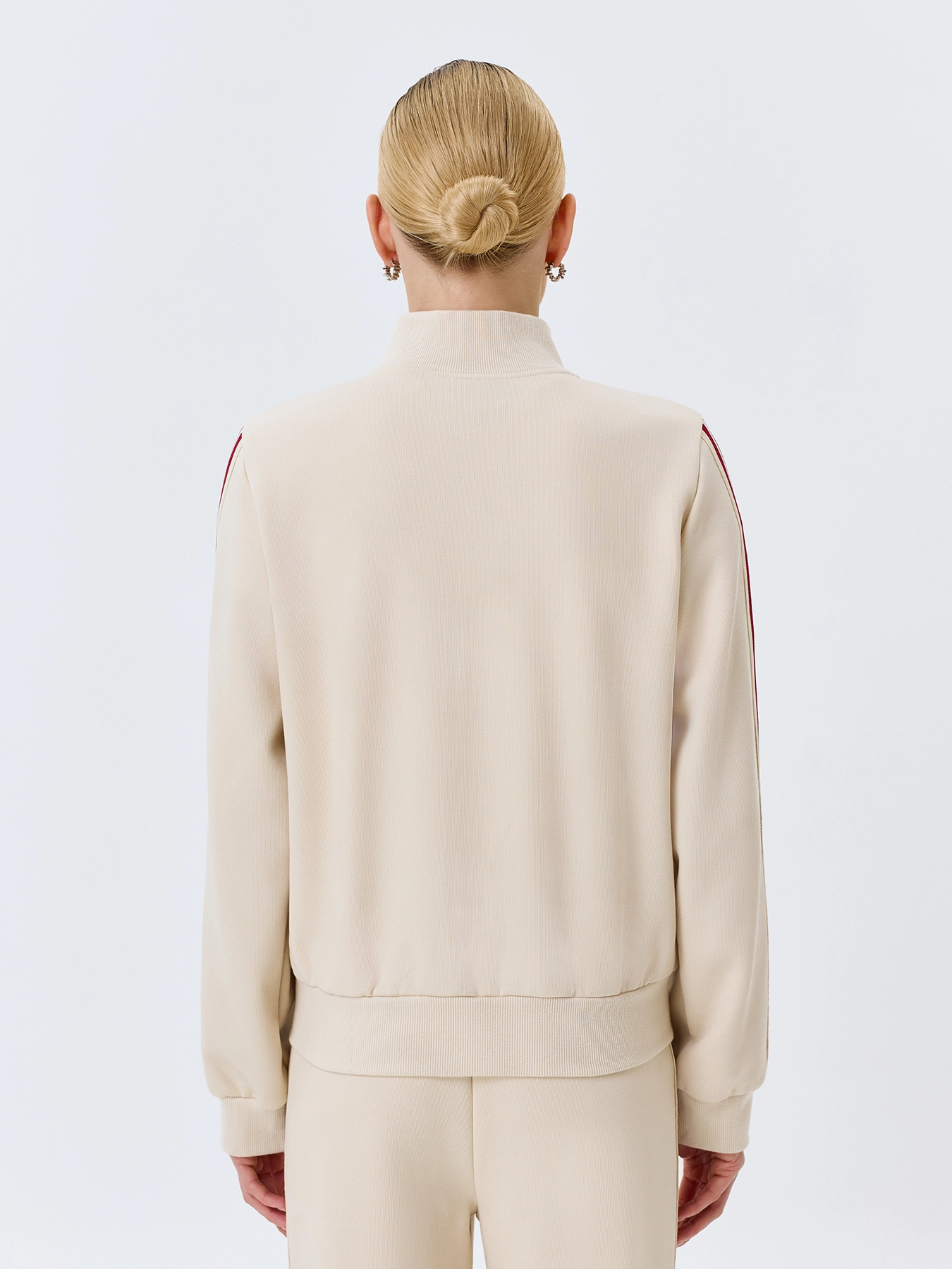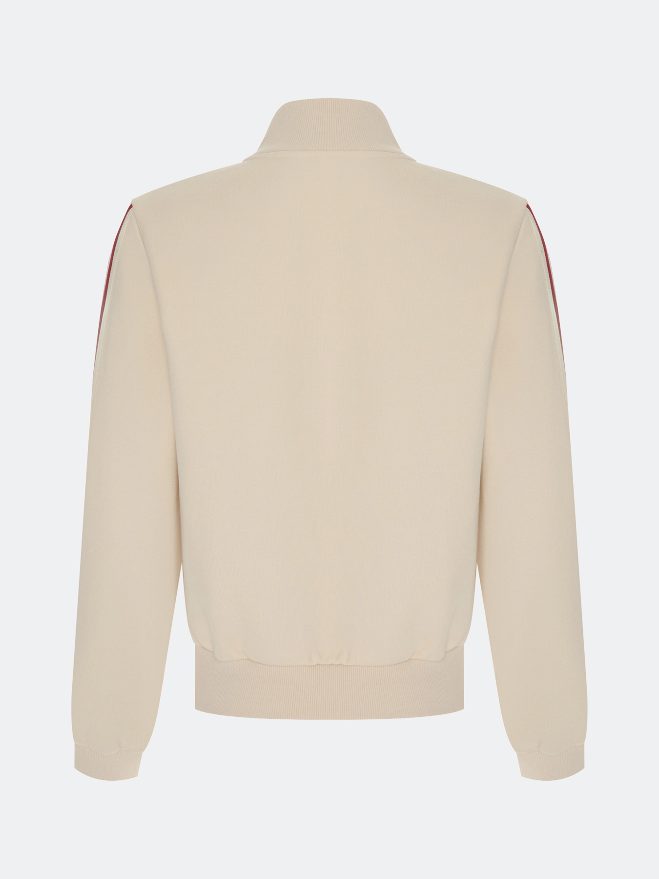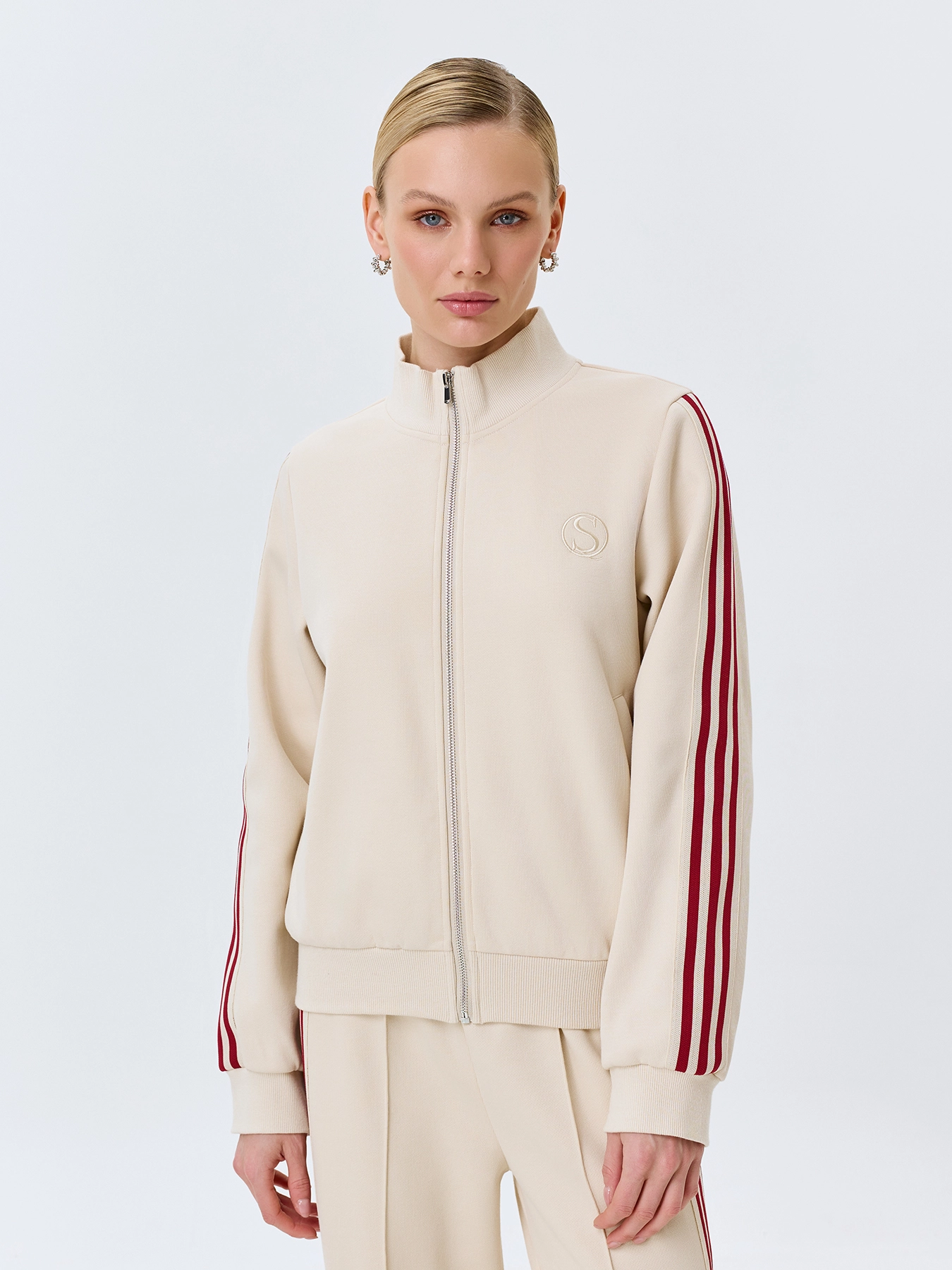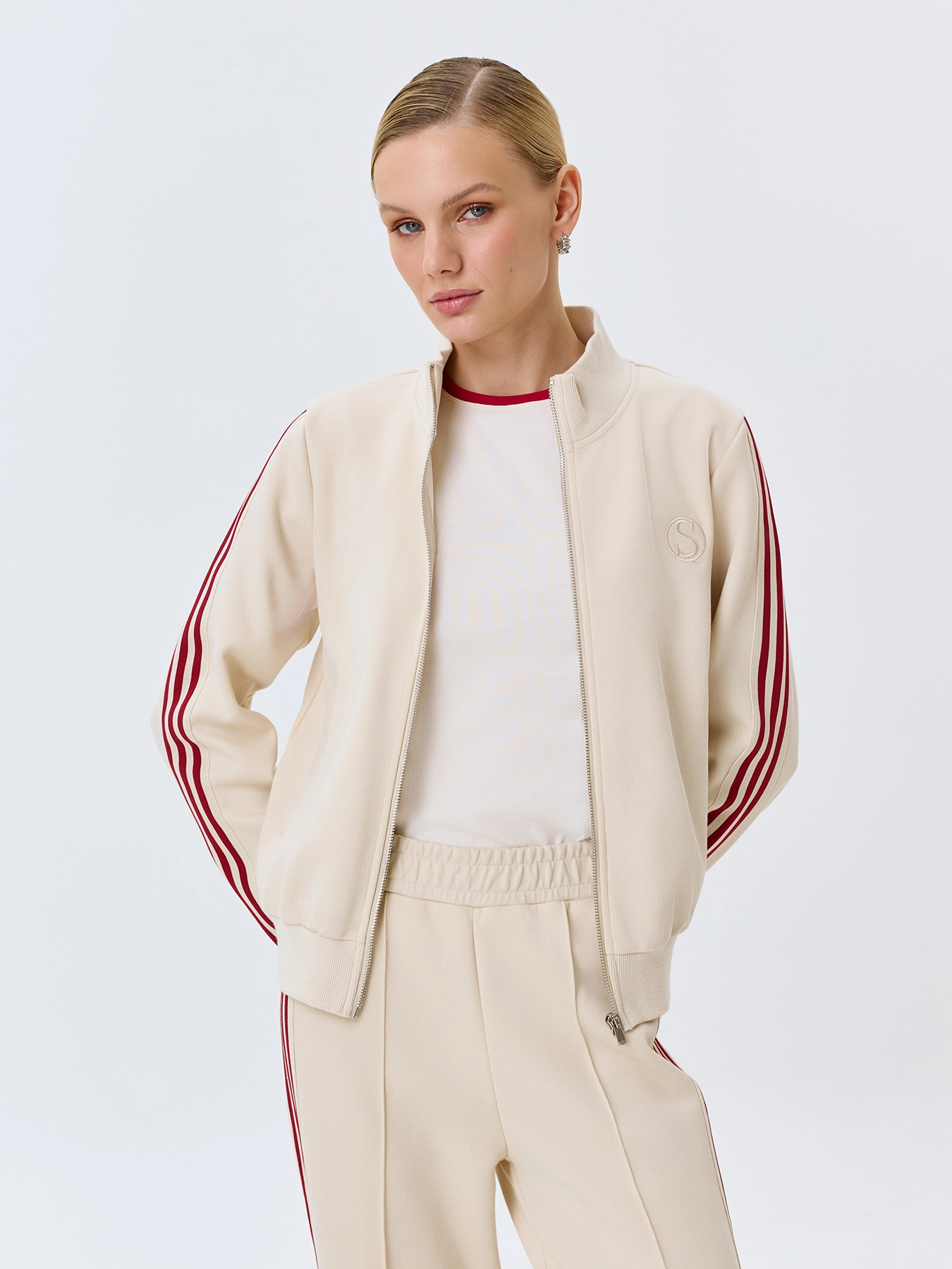 Трикотажный жакет бомбер с контрастными лампасами по рукавам. Свободный силуэт. Воротник стойка. Застежка на молнию. Риб по воротнику, низу изделия и рукавов. В составе хлопок. Комплект с 63818.