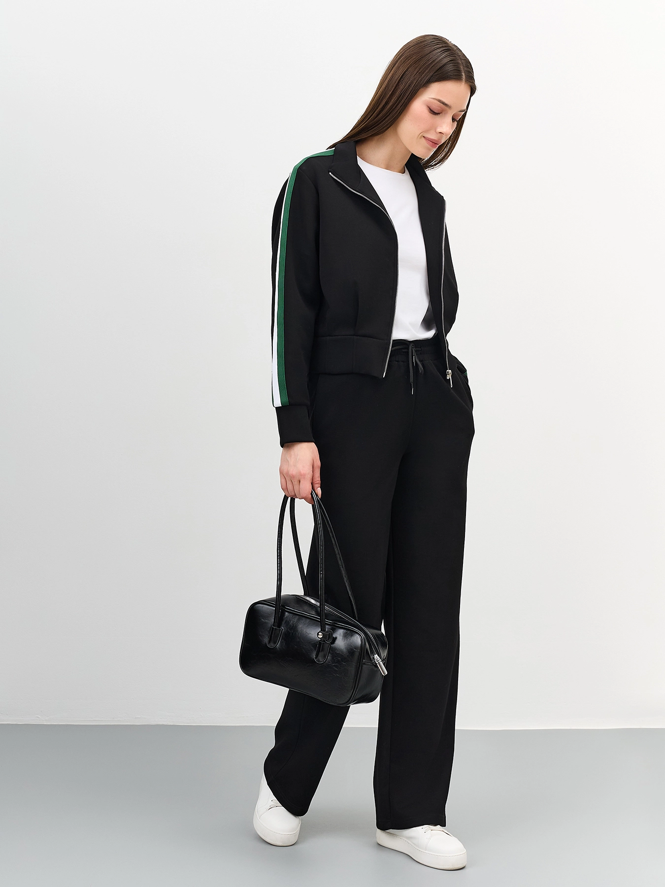 Укороченный жакет бомбер с лампасами в спортивном стиле. Прямой силуэт. Воротник стойка меняется на отложной. Длинные рукава с манжетами. Застежка на молнию. Дополнен вышивкой. В составе вискоза. Комплект с арт. 60859.