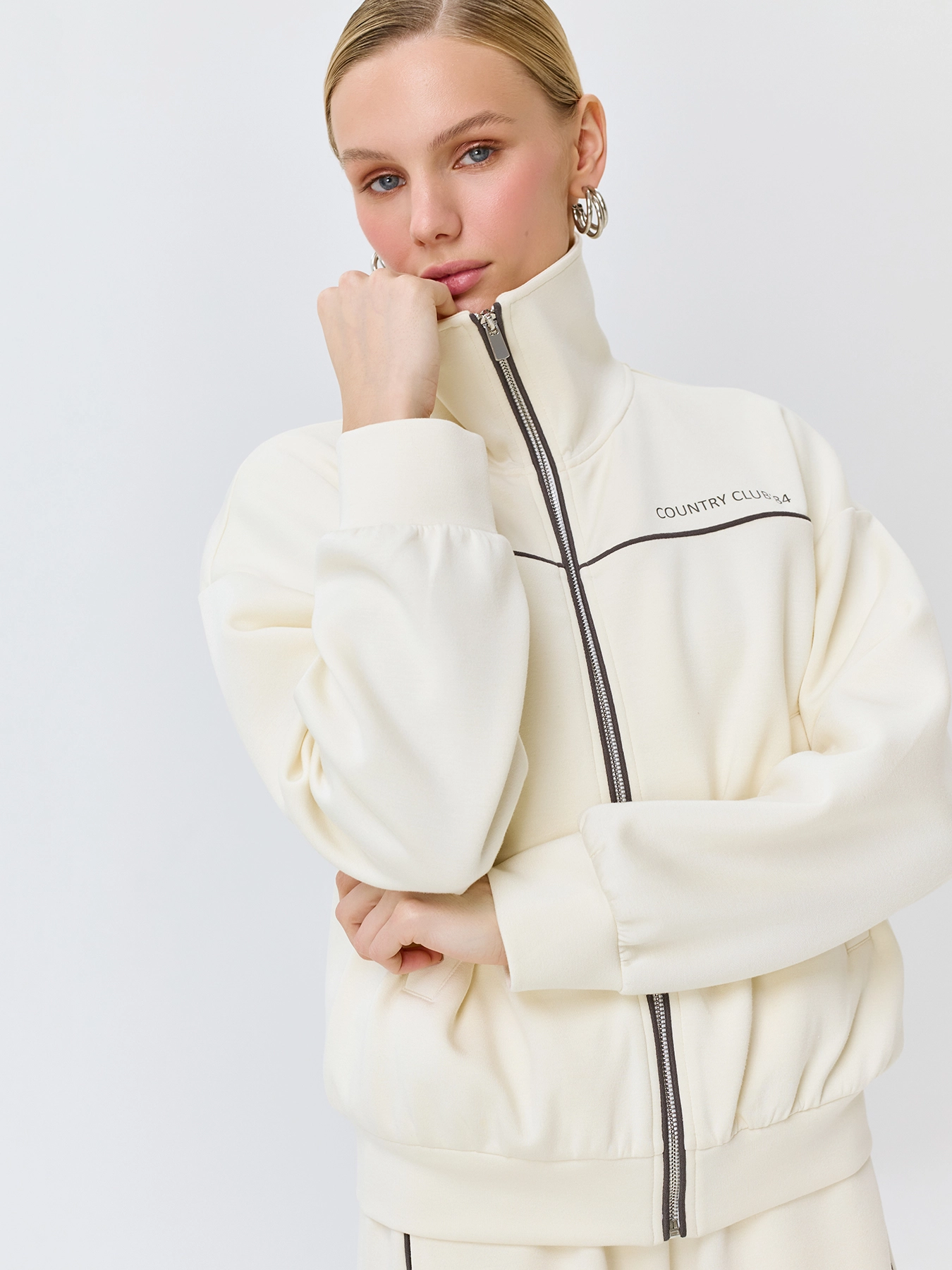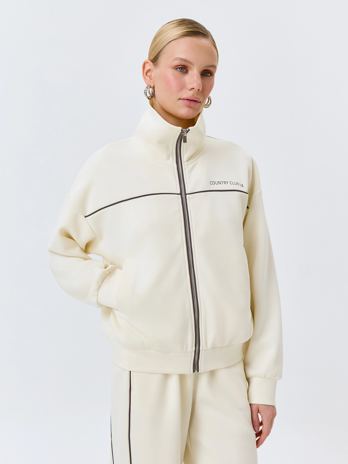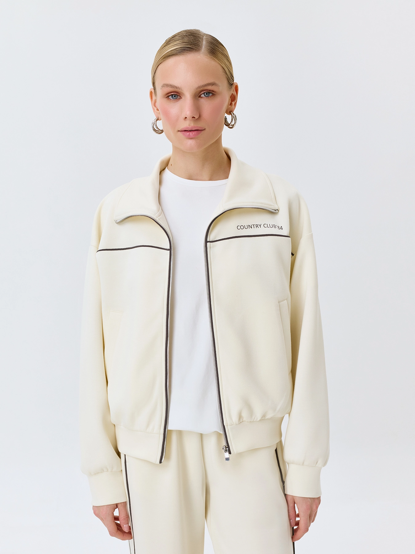 Трикотажный бомбер в спортивном стиле. Свободный силуэт. Спущенная линия плеч. Воротник стойка. Застежка на молнию с контрастными кантами. Дополнен контрастной полосой и вышивкой на груди. В составе вискоза. Комплект с 63850.