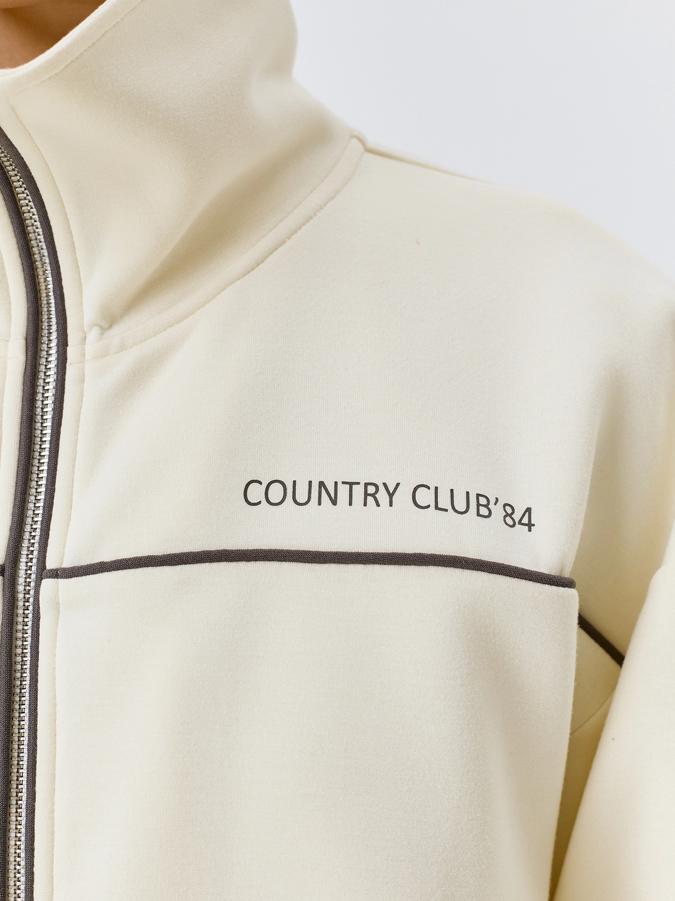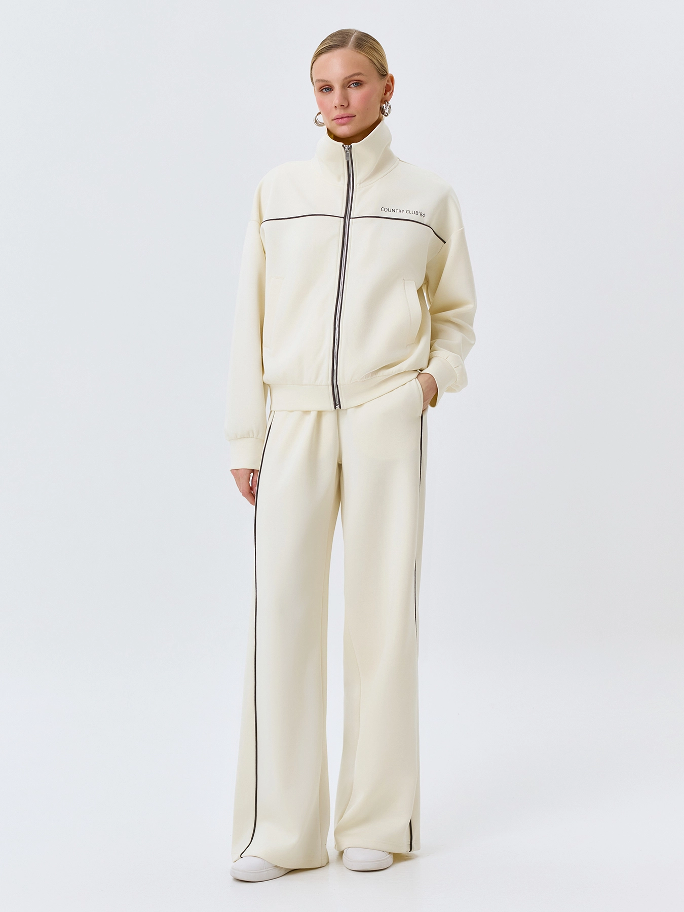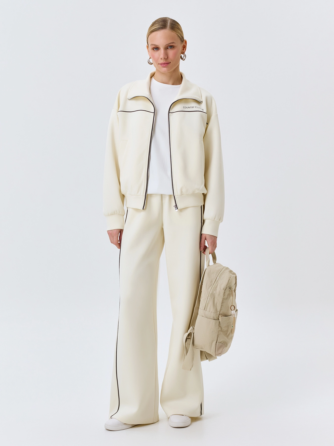 Трикотажный бомбер в спортивном стиле. Свободный силуэт. Спущенная линия плеч. Воротник стойка. Застежка на молнию с контрастными кантами. Дополнен контрастной полосой и вышивкой на груди. В составе вискоза. Комплект с 63850.