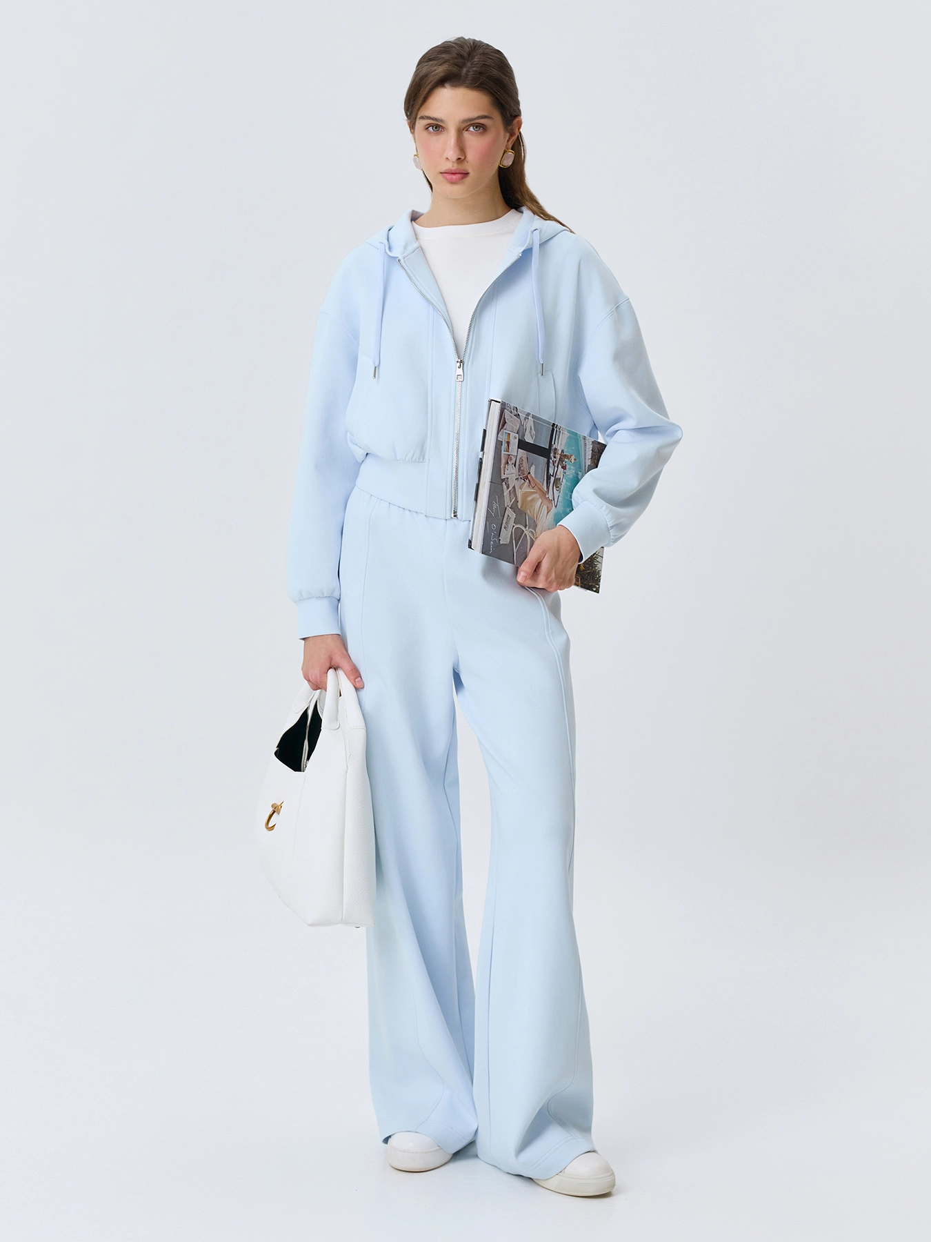 Укороченное худи из эластичного хлопка. Свободный силуэт. Застежка на молнию. Воротник дополнен капюшоном с кулиской и шнурком. Боковые карманы с листочками. Спущенная линия плеч и объемные длинные рукава. Дополнено рибом по низу изделия и рукавов. В комплекте с 63912.