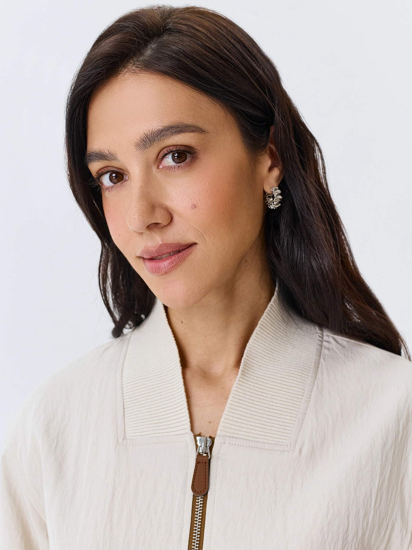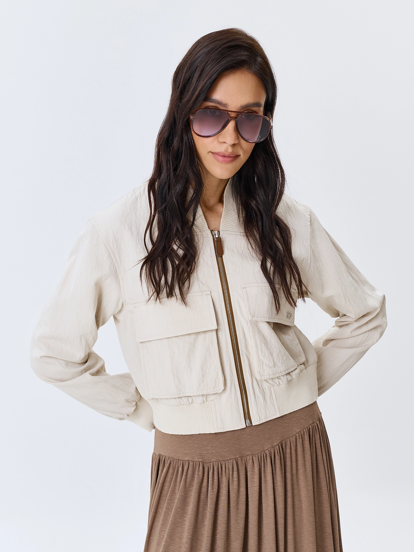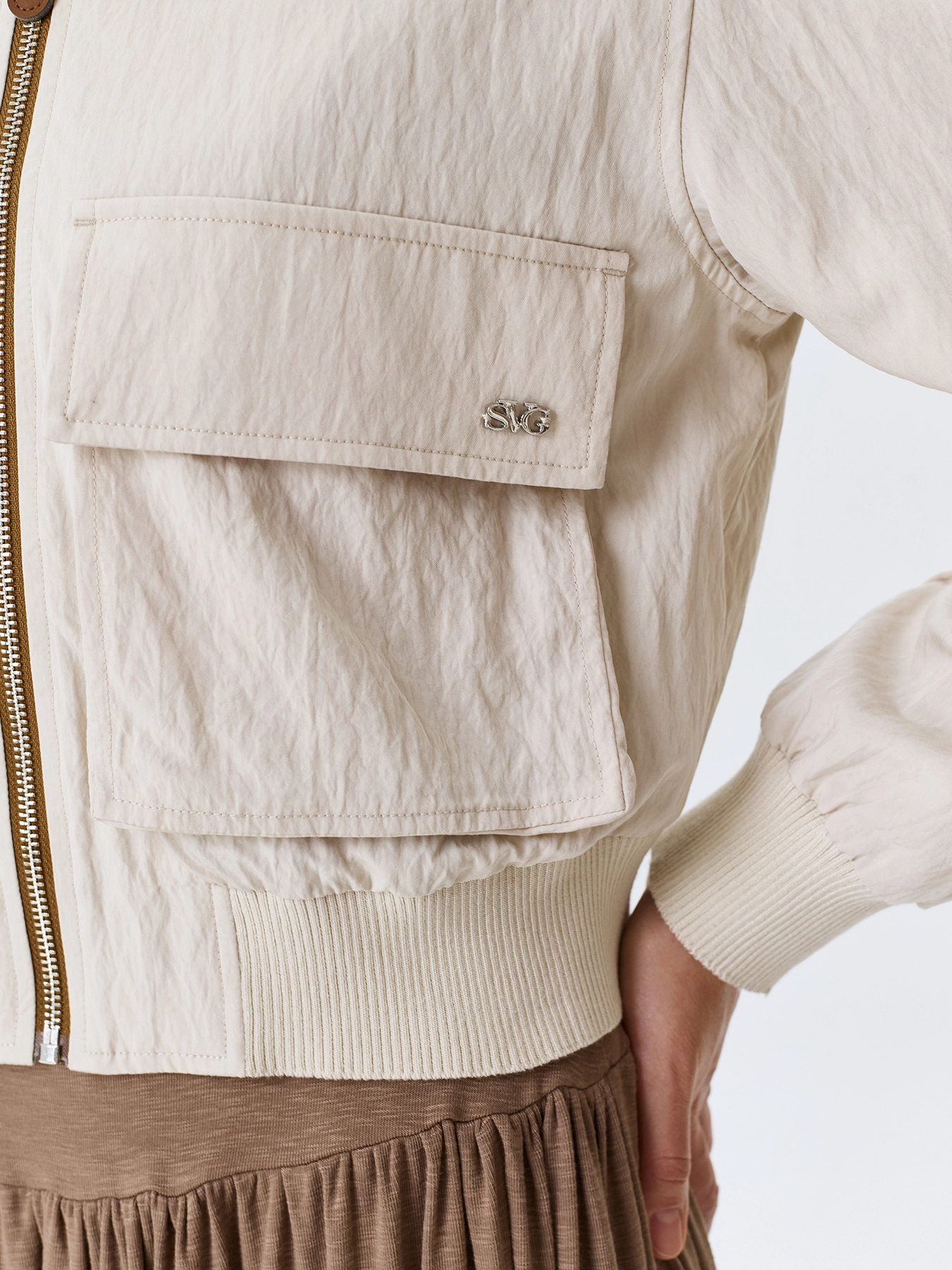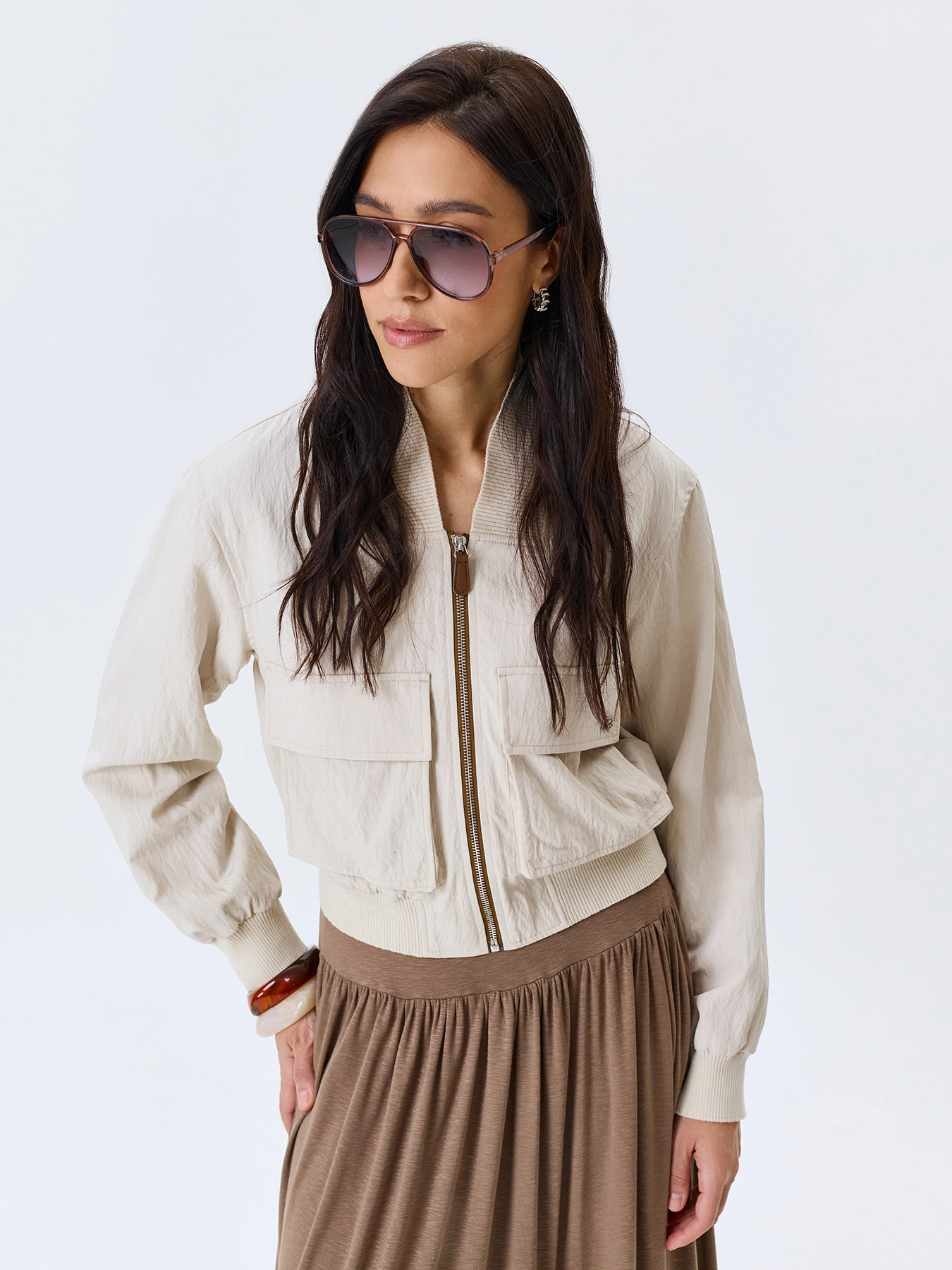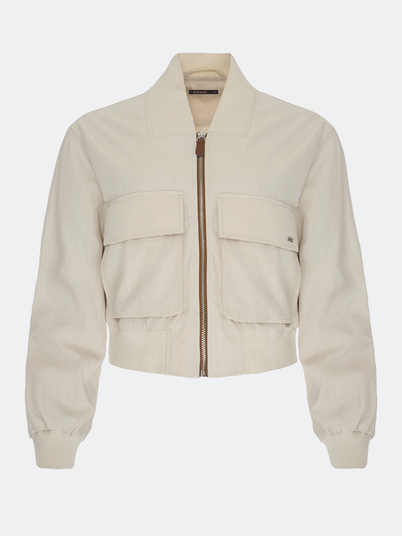 Укороченный бомбер с широким рибом по горловине. Свободный силуэт. Широкие накладные карманы с клапанами. Застежка на молнию. V-образный вырез. Спущенная линия плеч. Широкий риб по низу изделия. Кант из эко кожи вдоль молнии.