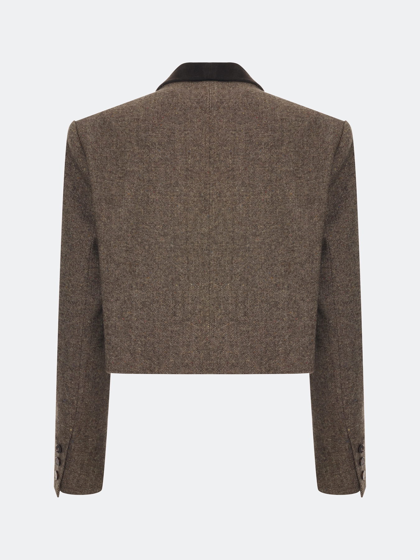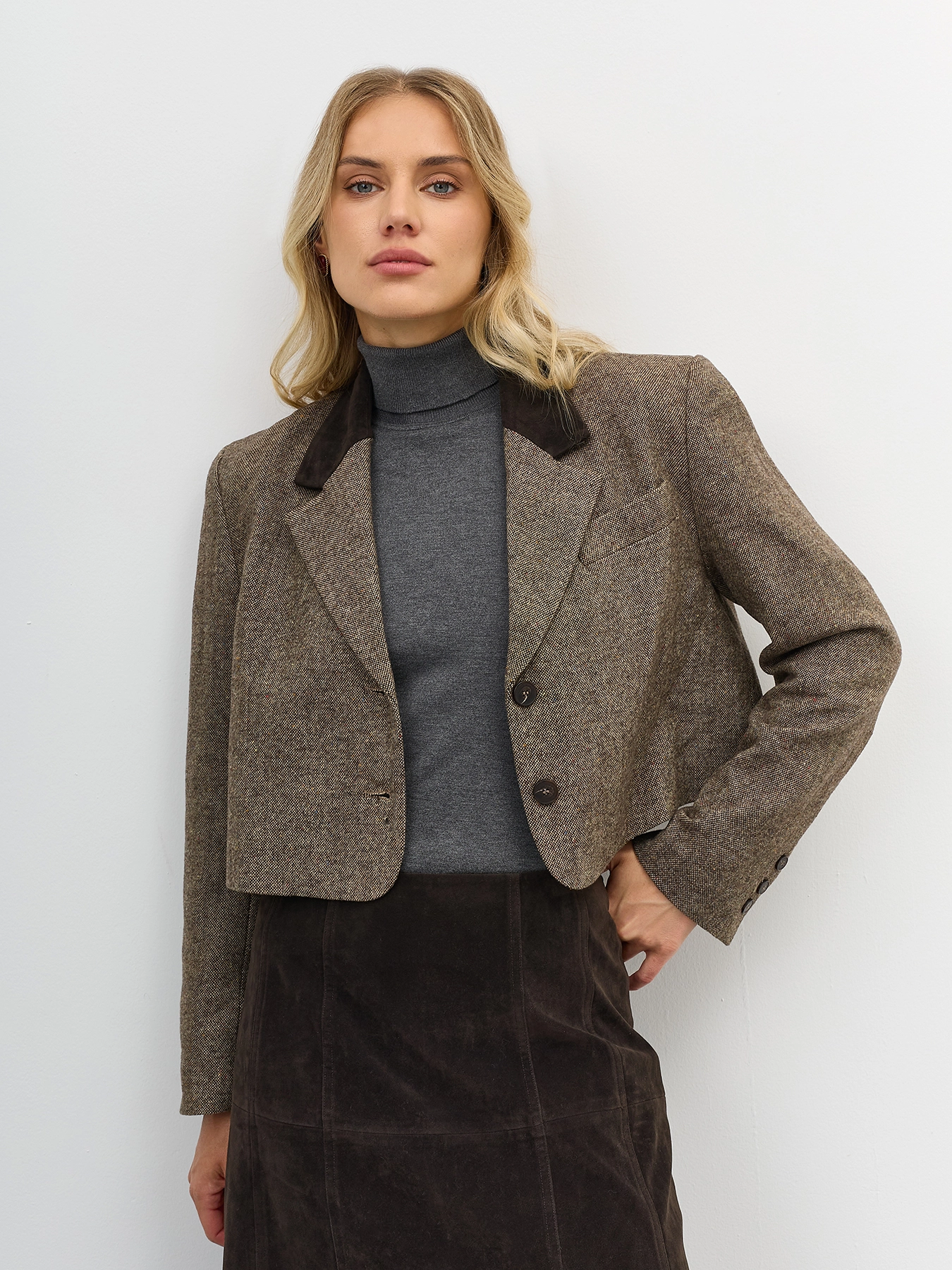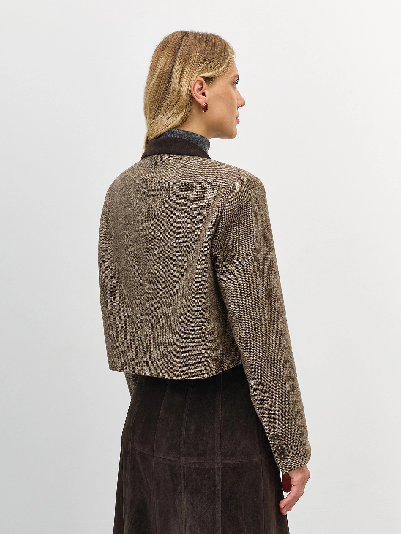 Укороченный жакет свободного силуэта из шерстяного твида. Классический английский воротник дополнен вставкой из искуственной замши. Застежка на две пуговицы. Дополнен шелковистой подклдкой.