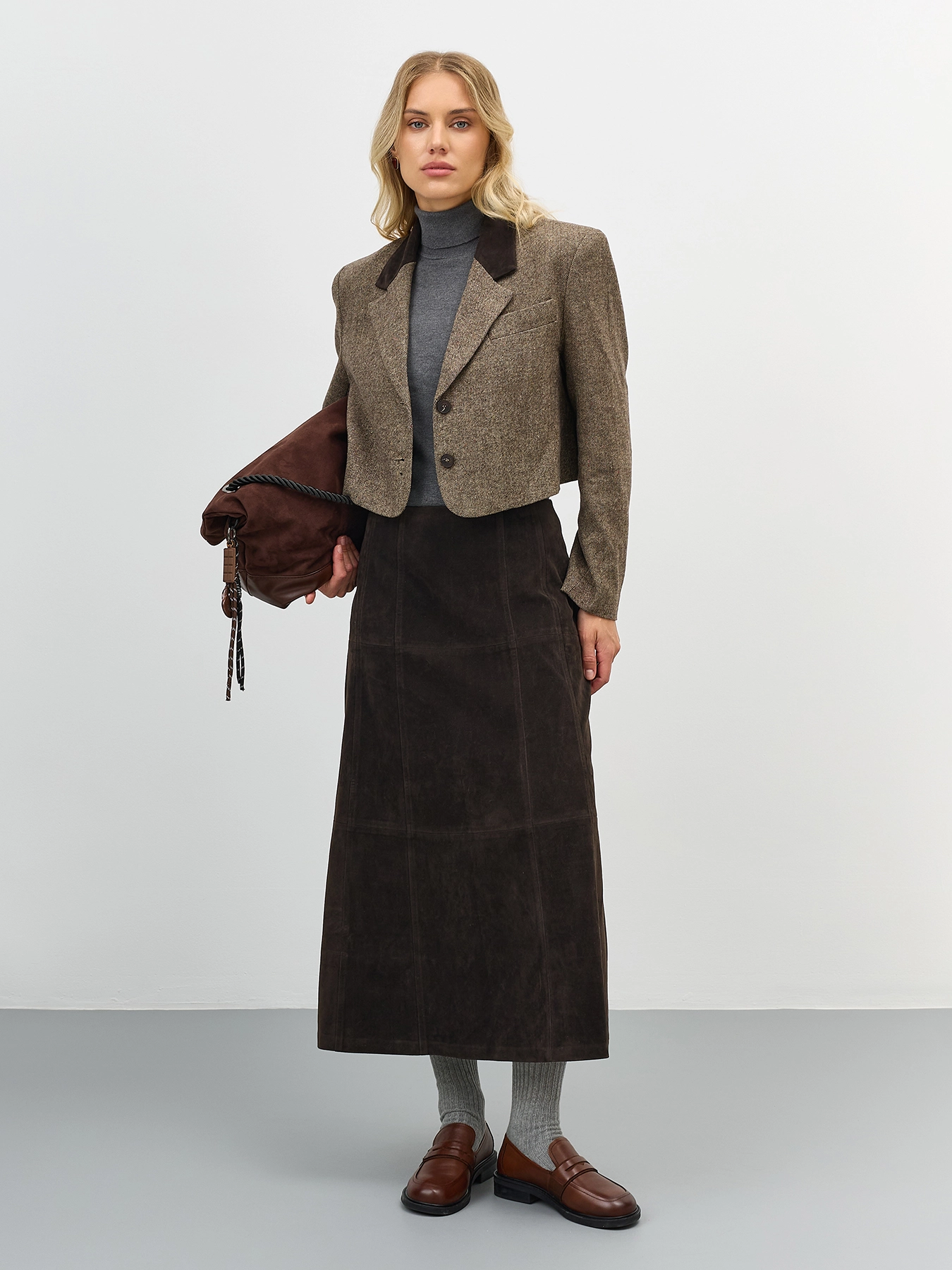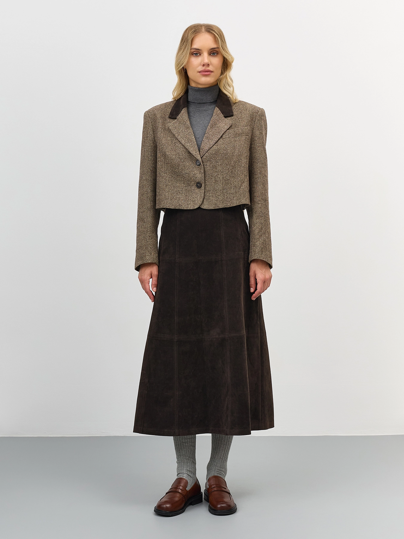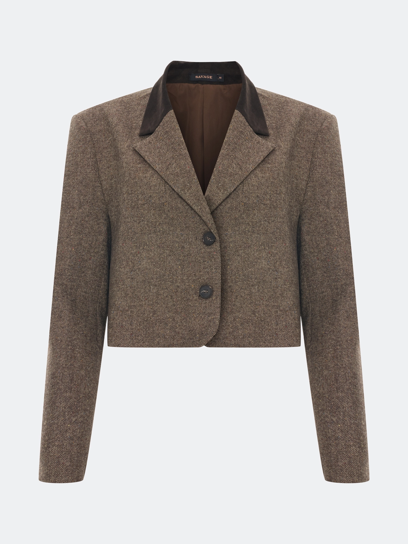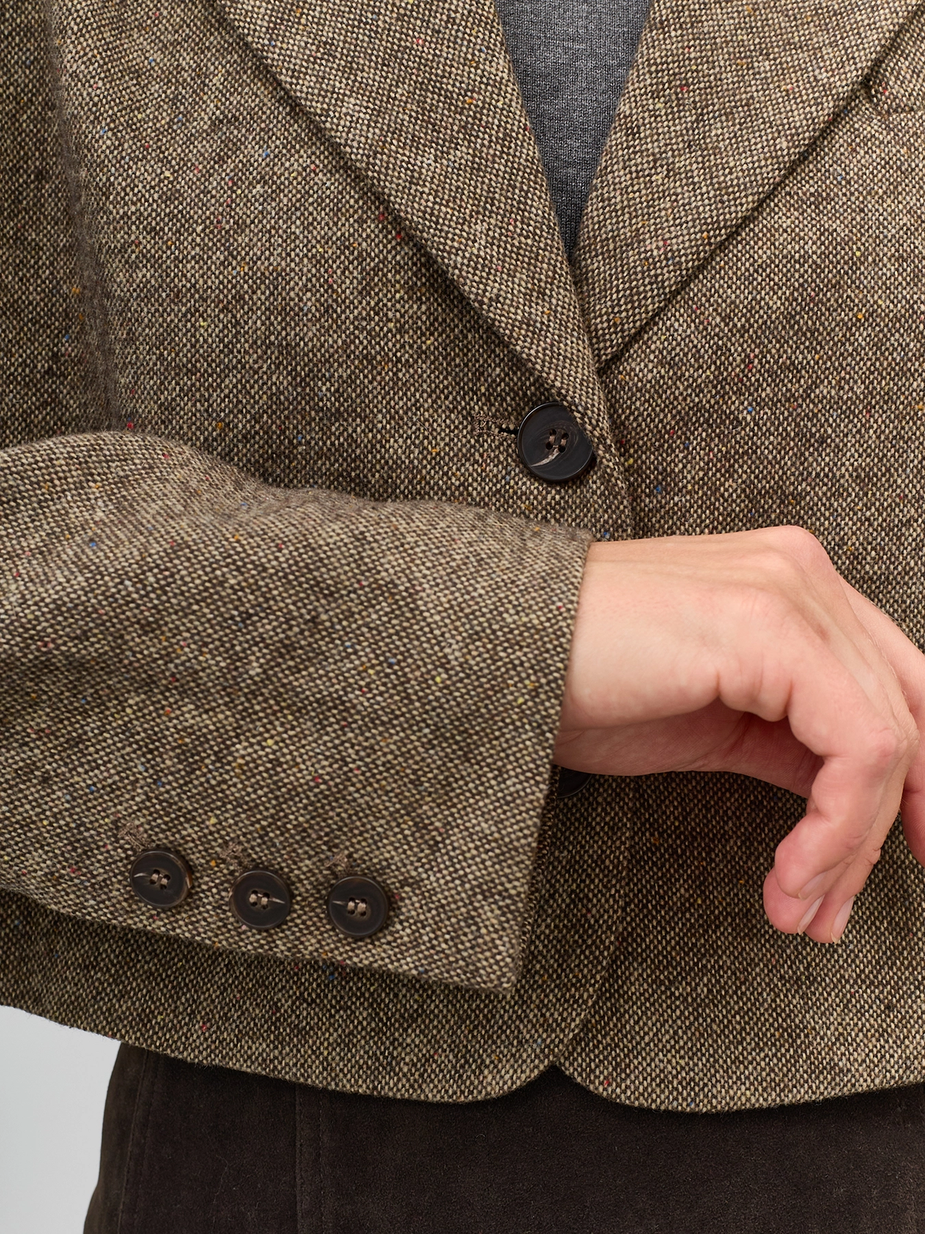 Укороченный жакет свободного силуэта из шерстяного твида. Классический английский воротник дополнен вставкой из искуственной замши. Застежка на две пуговицы. Дополнен шелковистой подклдкой.