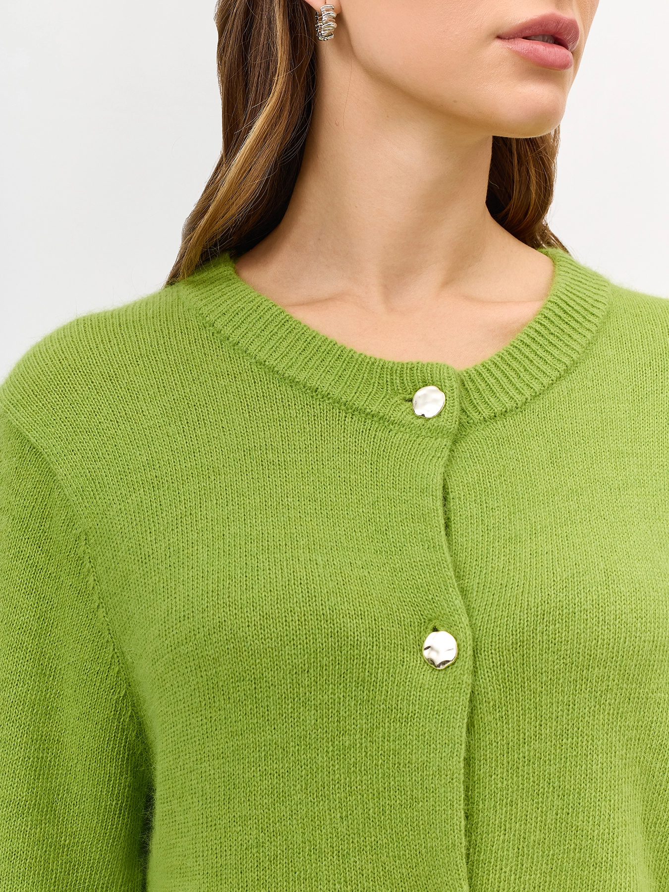 Яркий кардиган с ангорой и шерстью в составе. Прямой силуэт. Круглый вырез. Застежка на акцентные золотистые пуговицы. Риб по горловине, низу рукавов и изделия.
