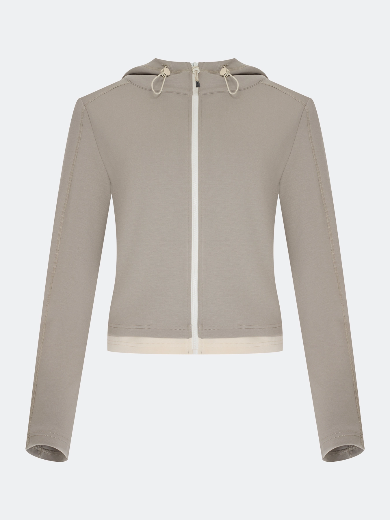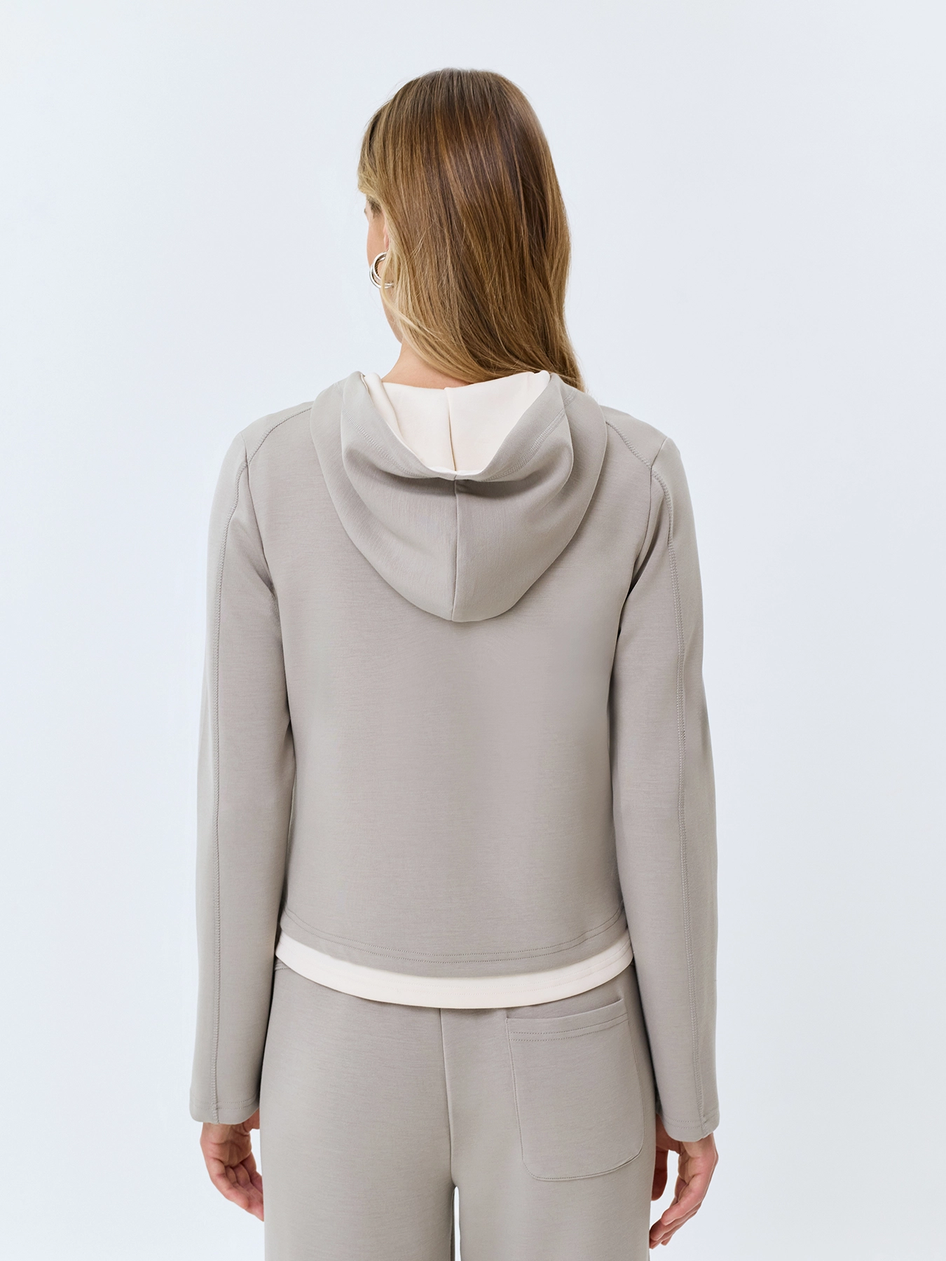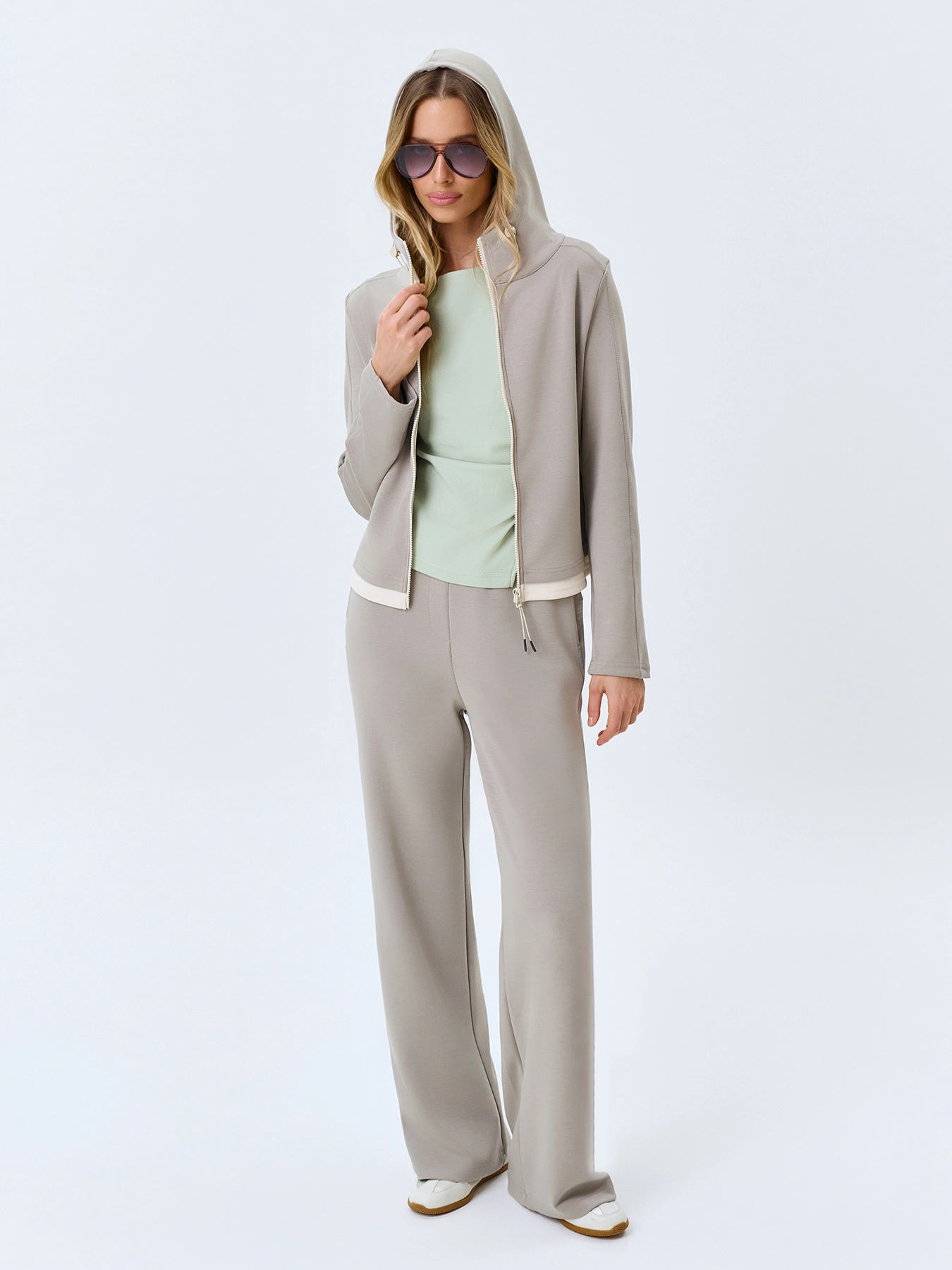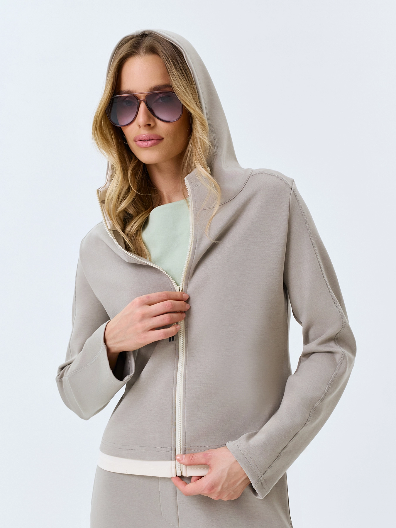 Жакет из модала в спортивном стиле. Полуприталенный силуэт. Воротник стойка дополнен капюшоном на кулисе. Застежка на контрастную молнию. Контрастная полоса по низу. Комплект с 63805.