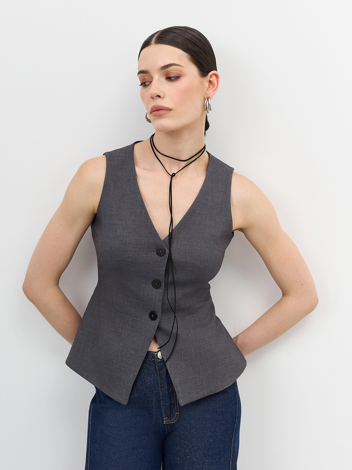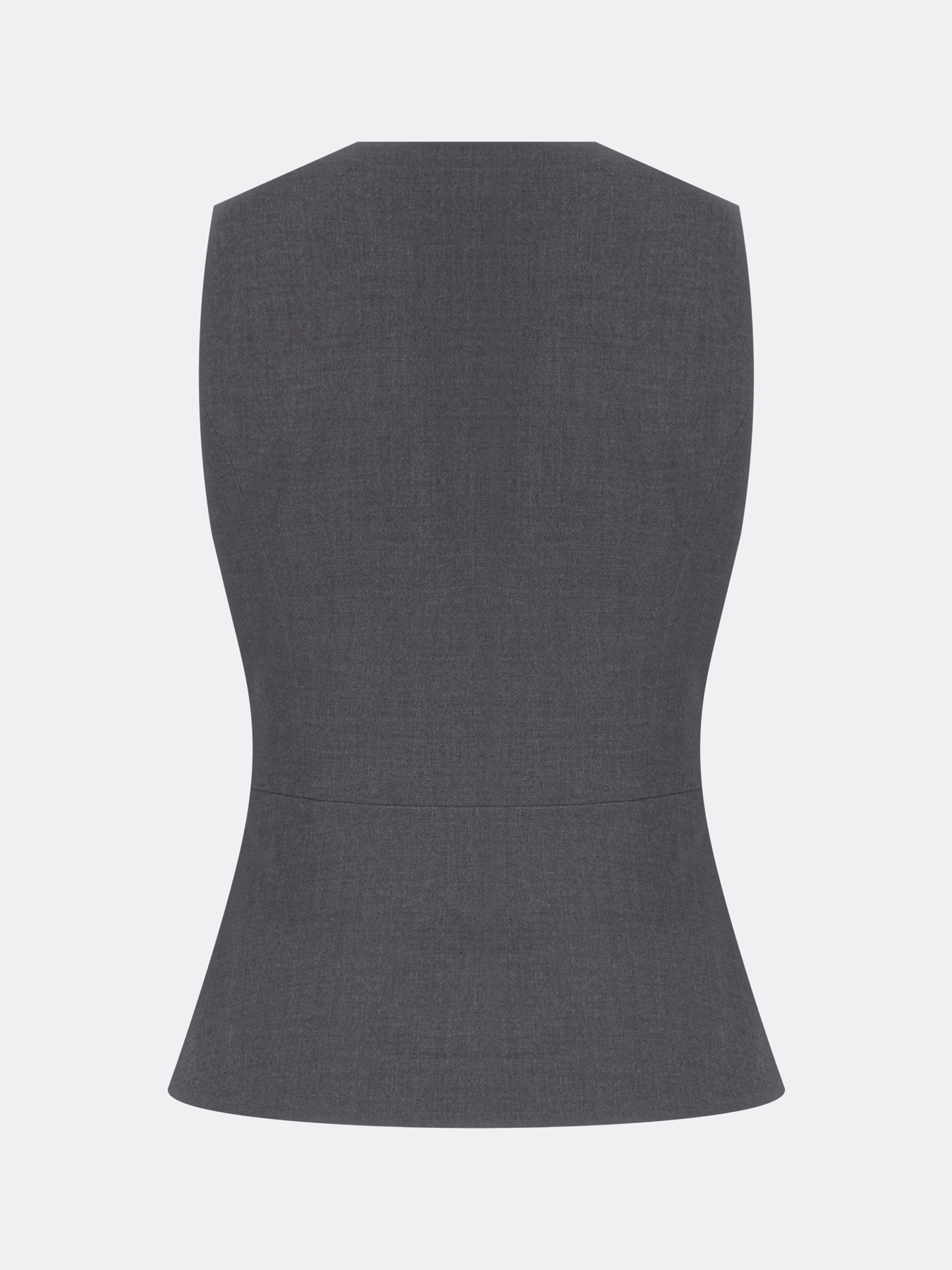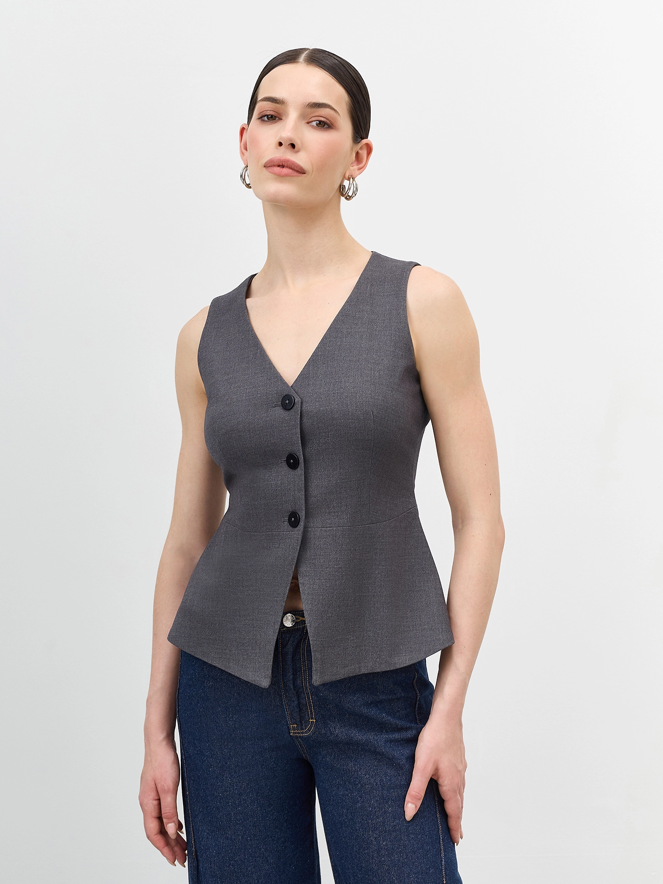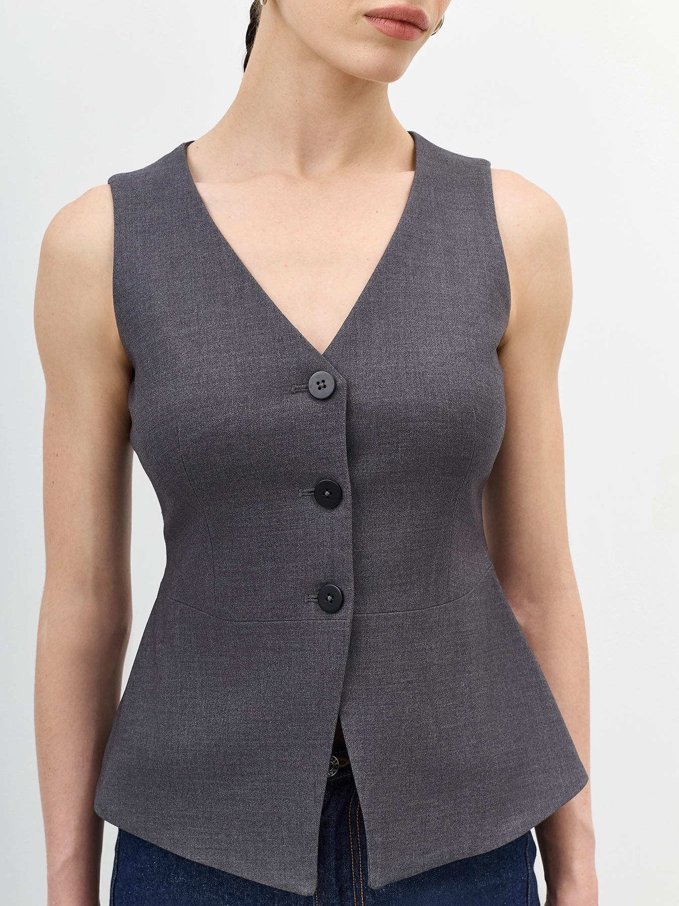 Удлиненный приталенный классический жилет. V-образный вырез. Застежка на пуговицы. В составе вискоза и шерсть. Подкладка из 100% вискозы. Комплект с арт. 60517.