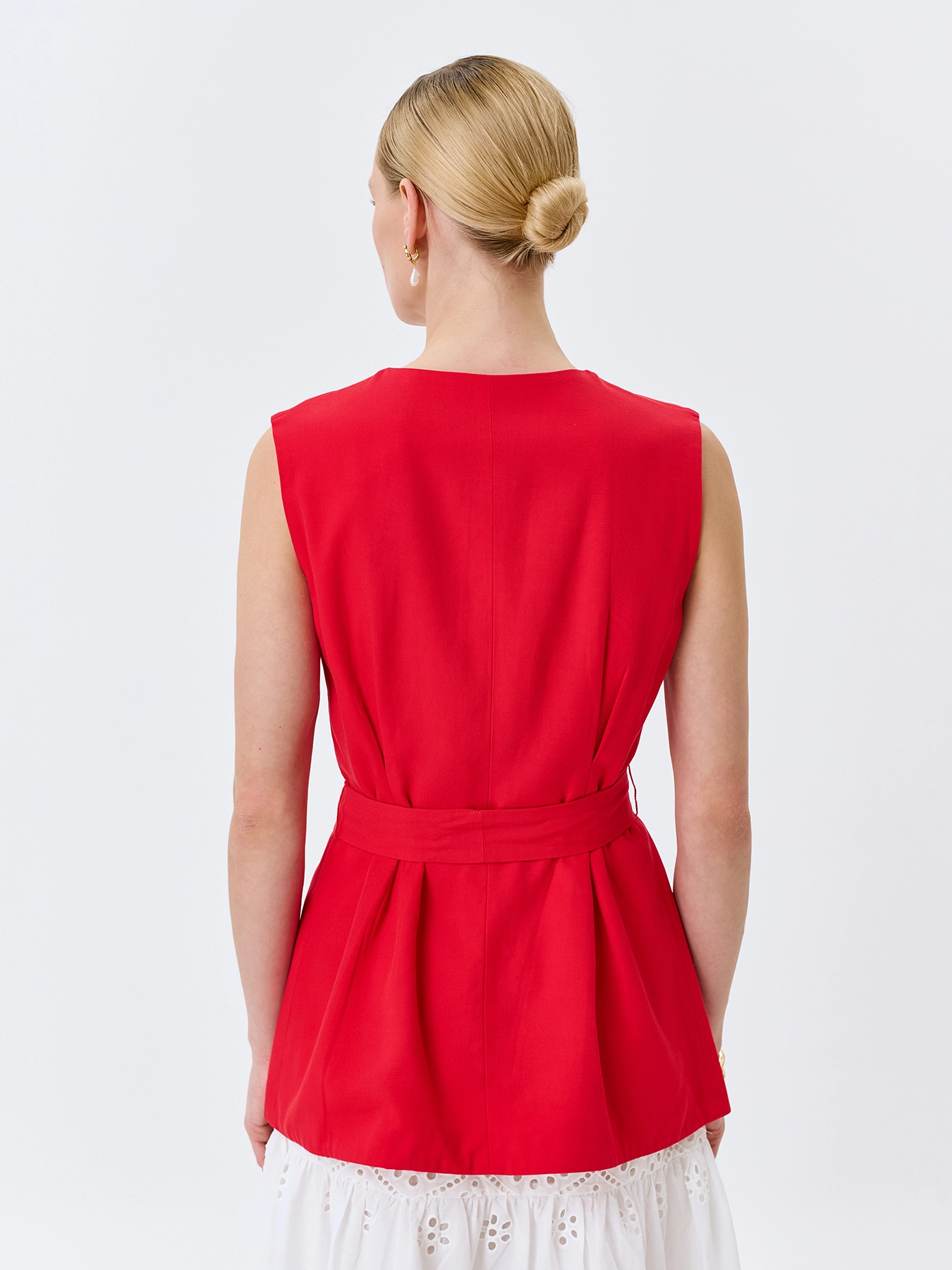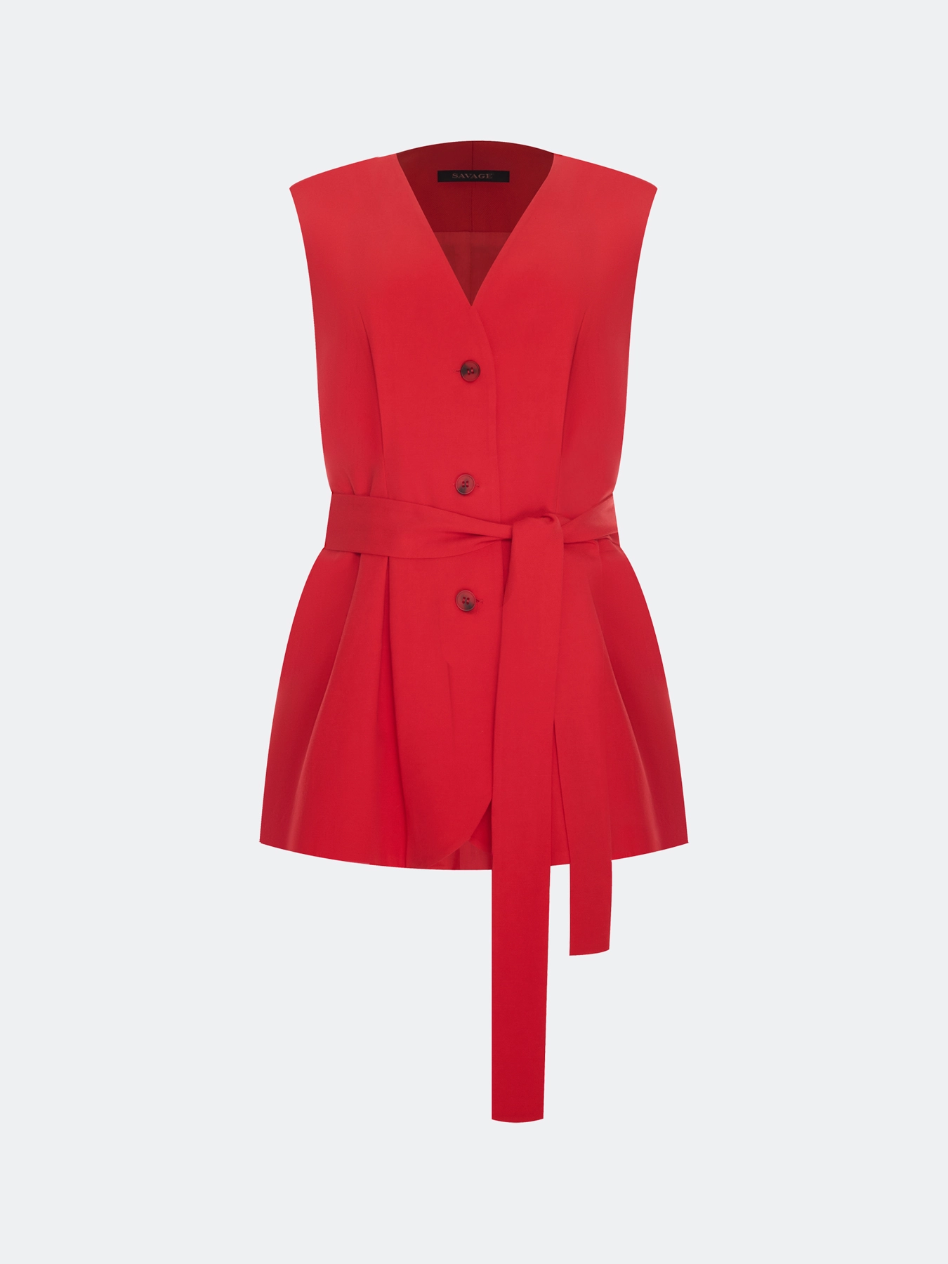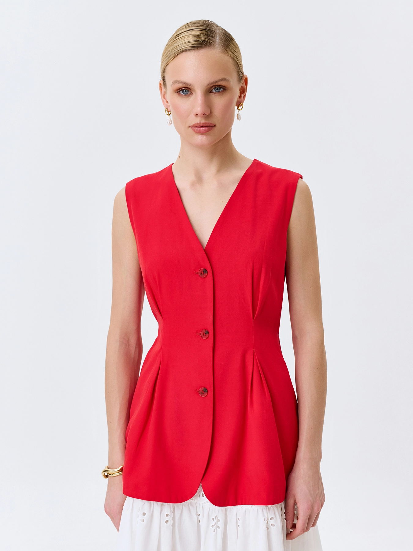 Яркий удлиненный жилет с акцентными складками по линии талии. V-образный вырез. Приталенный силуэт можно дополнить поясом. Застежка на пуговицы. В составе тенсель и лен. Комплект с 63422.