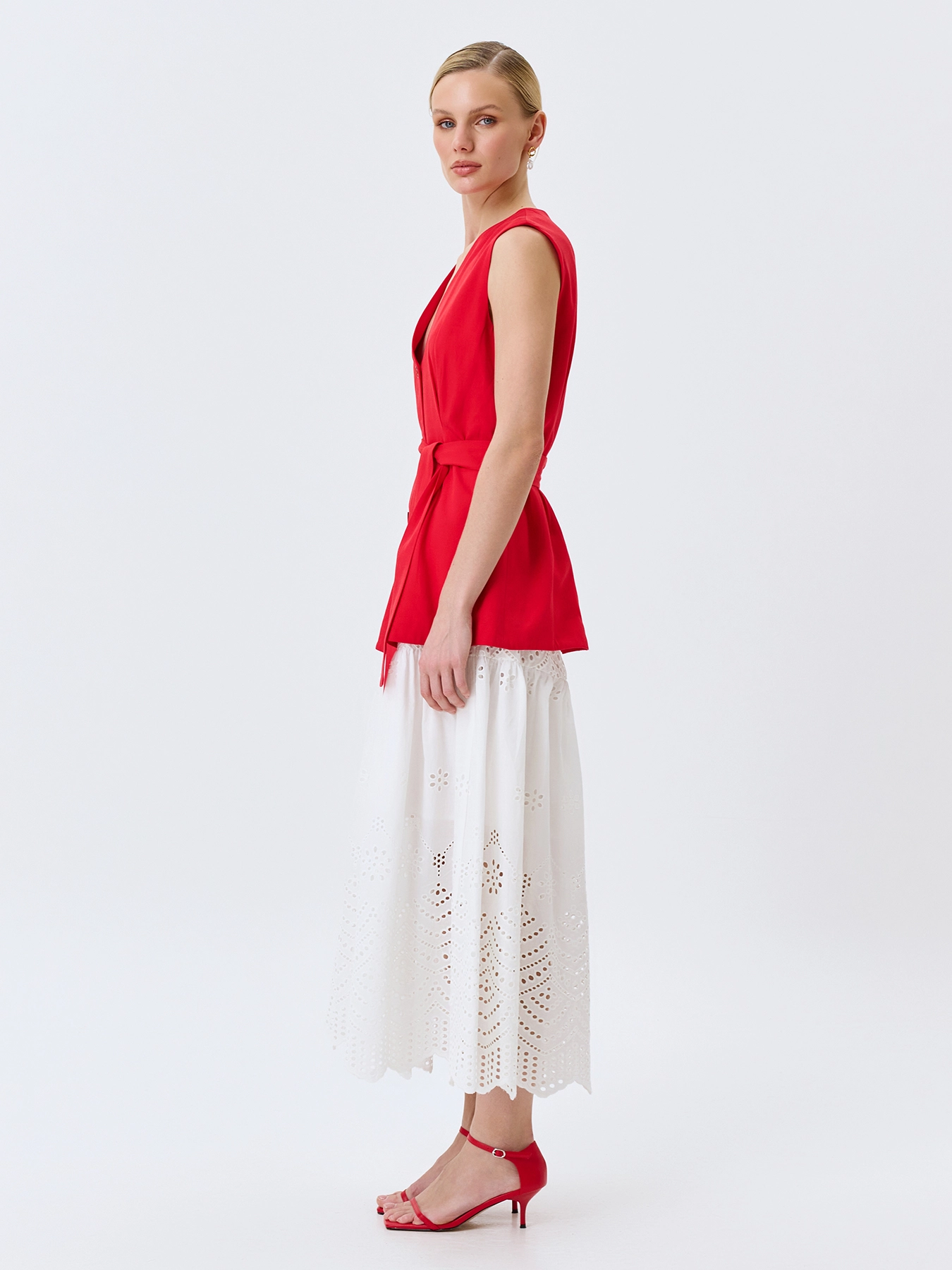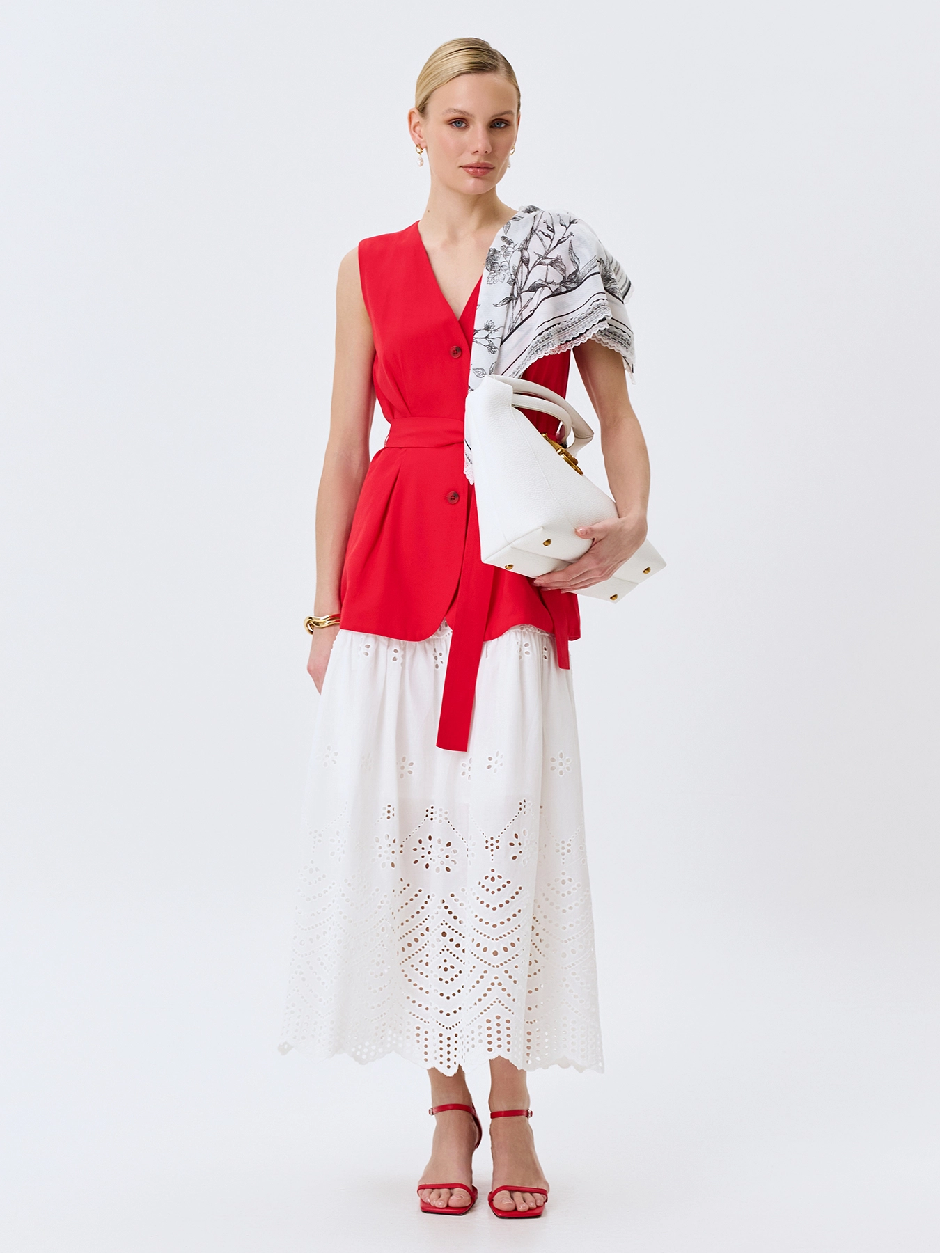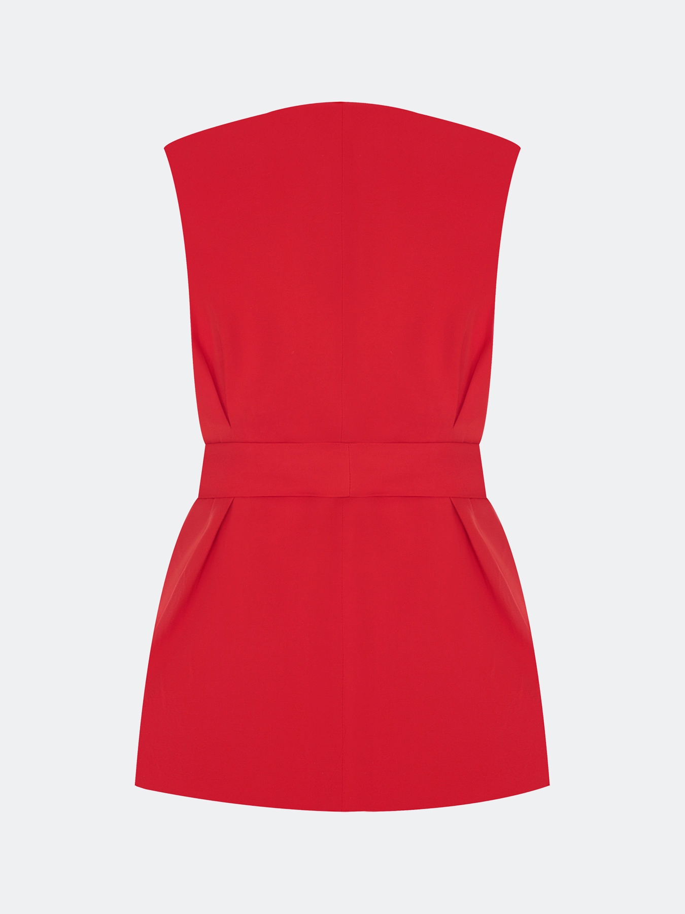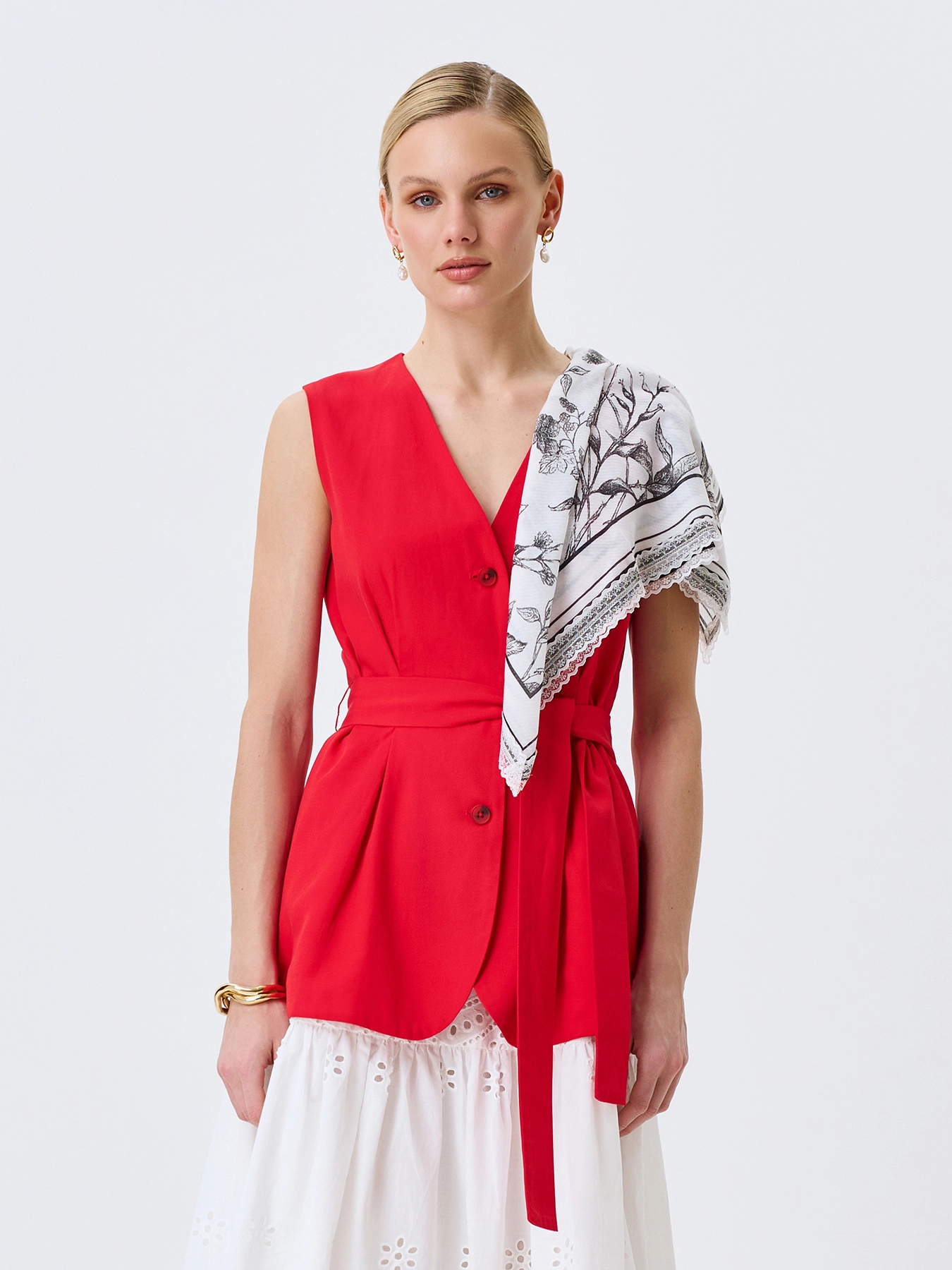 Яркий удлиненный жилет с акцентными складками по линии талии. V-образный вырез. Приталенный силуэт можно дополнить поясом. Застежка на пуговицы. В составе тенсель и лен. Комплект с 63422.
