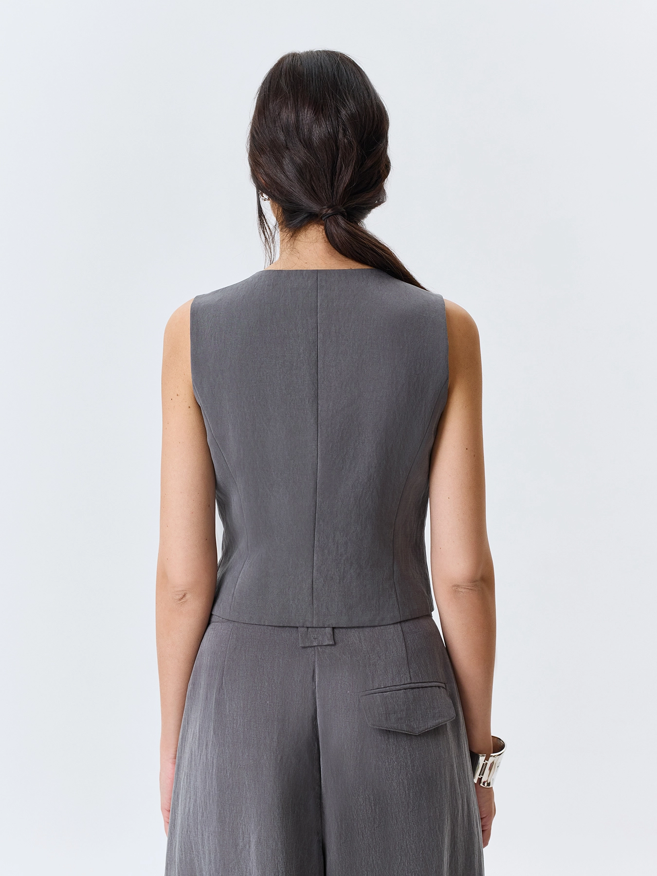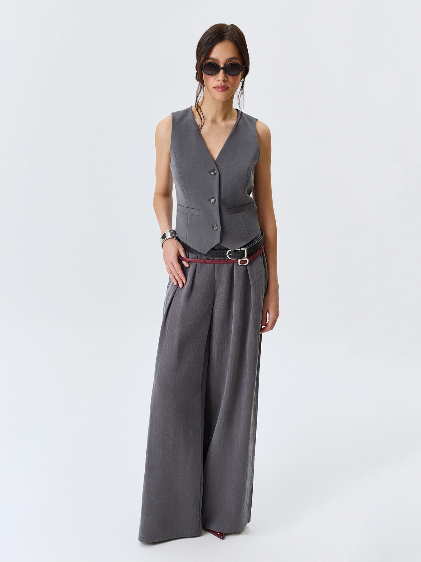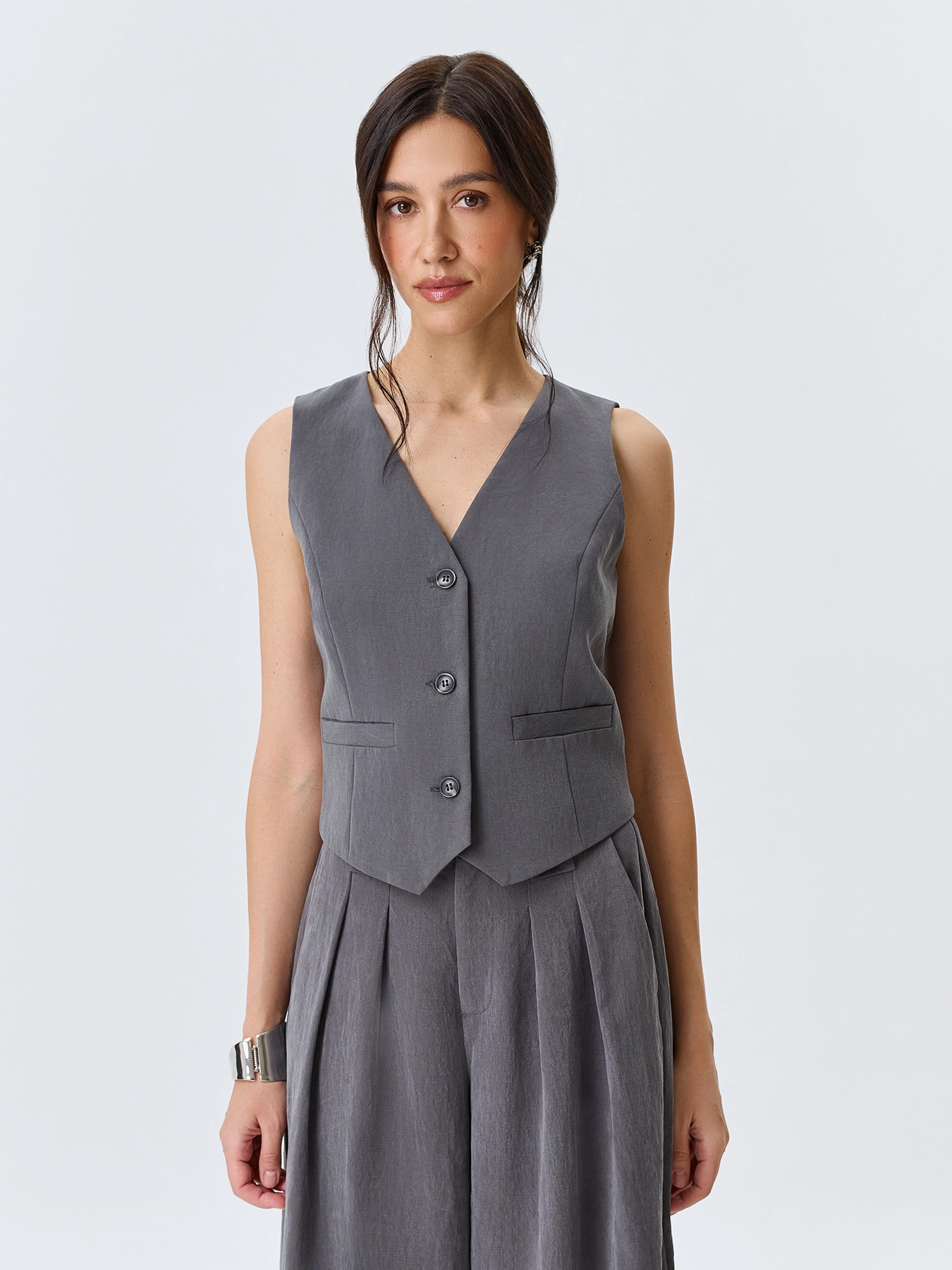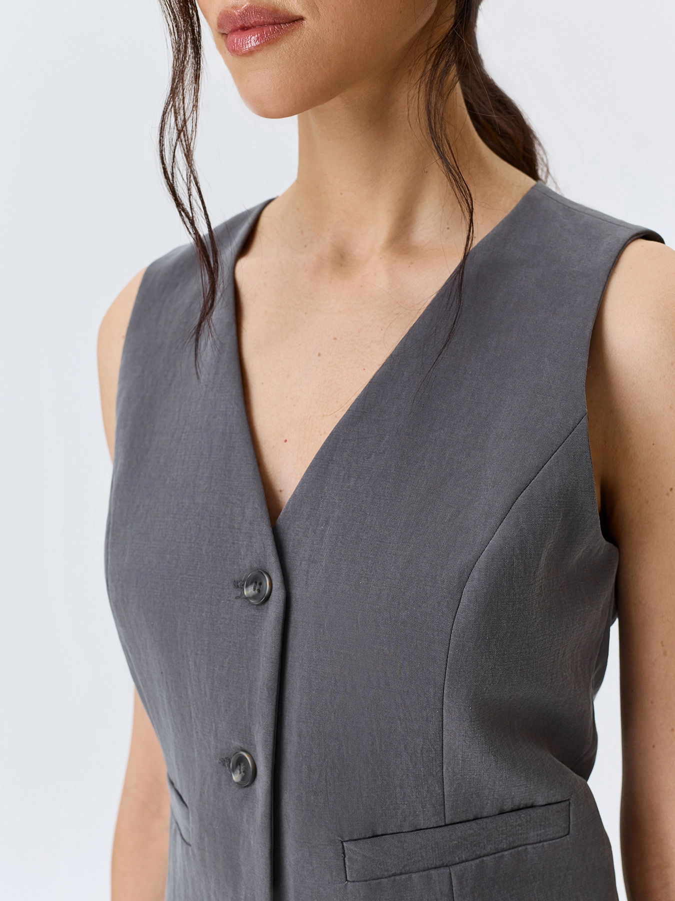 Жилет из фактурного лиоцелла приталенный силуэт. V-образный вырез. Застежка на пуговицы. Имитация боковых карманов с листочками. Комплект с 63413.