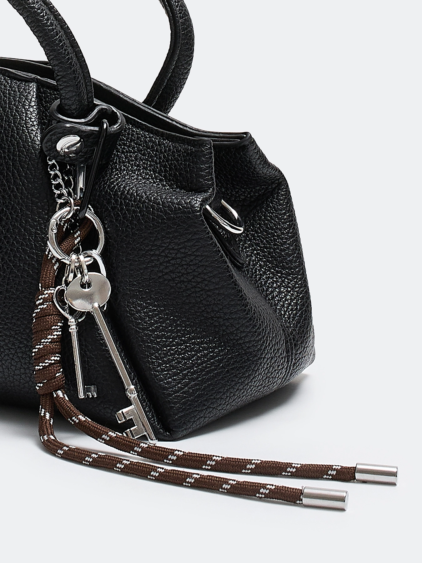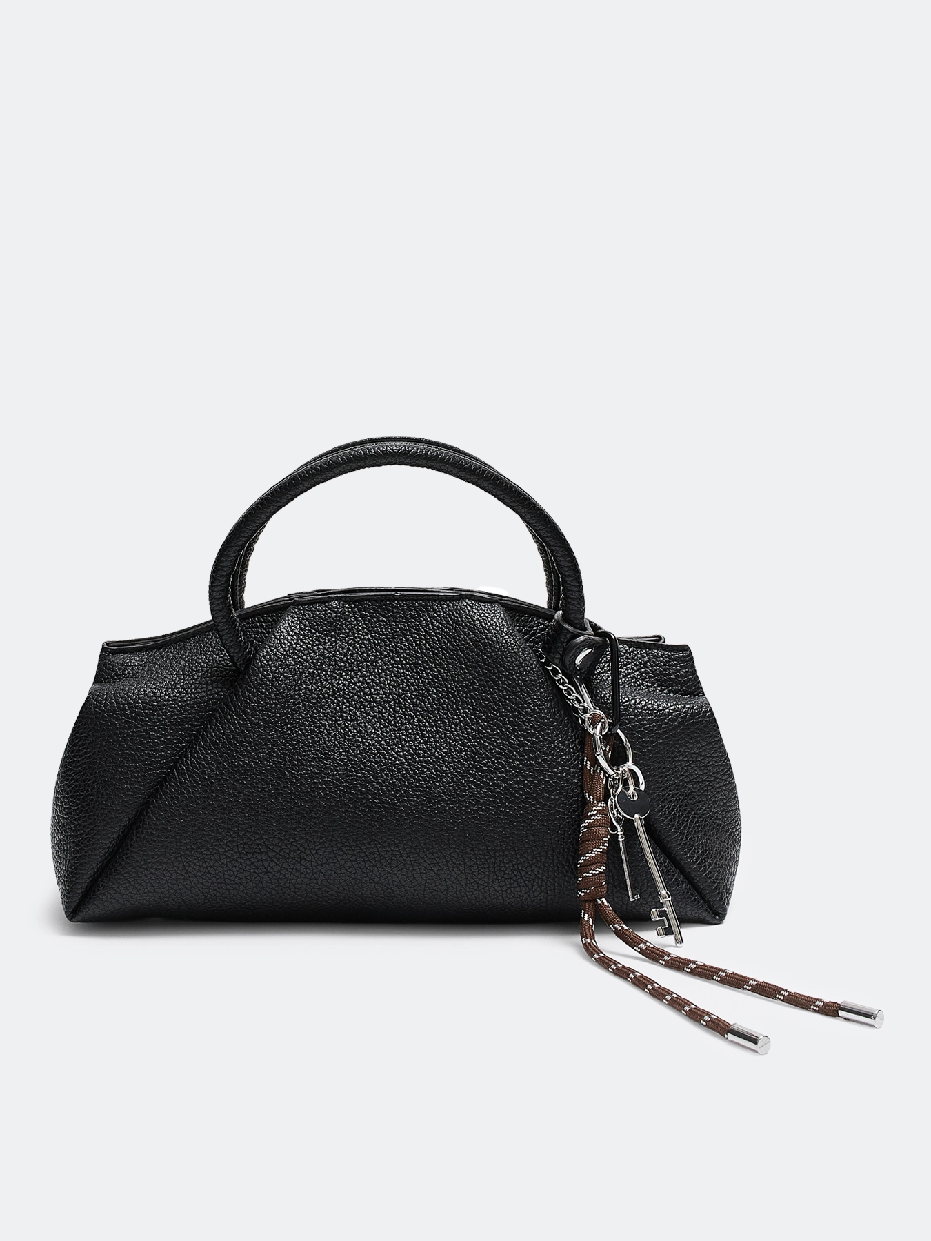 Cумка из зернистой эко кожи с акцентным обвесом. Прямоугольная форма с мягкими складками. Одно вместительное отделение и потайной карман на молнии. Две короткие ручки и длинный съемный ремешок. Застежка на молнию.