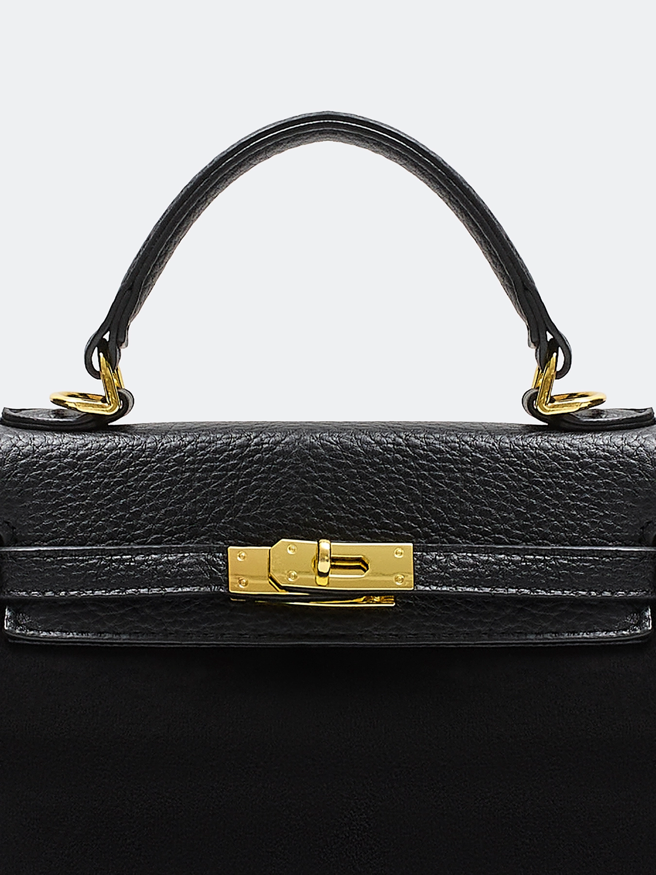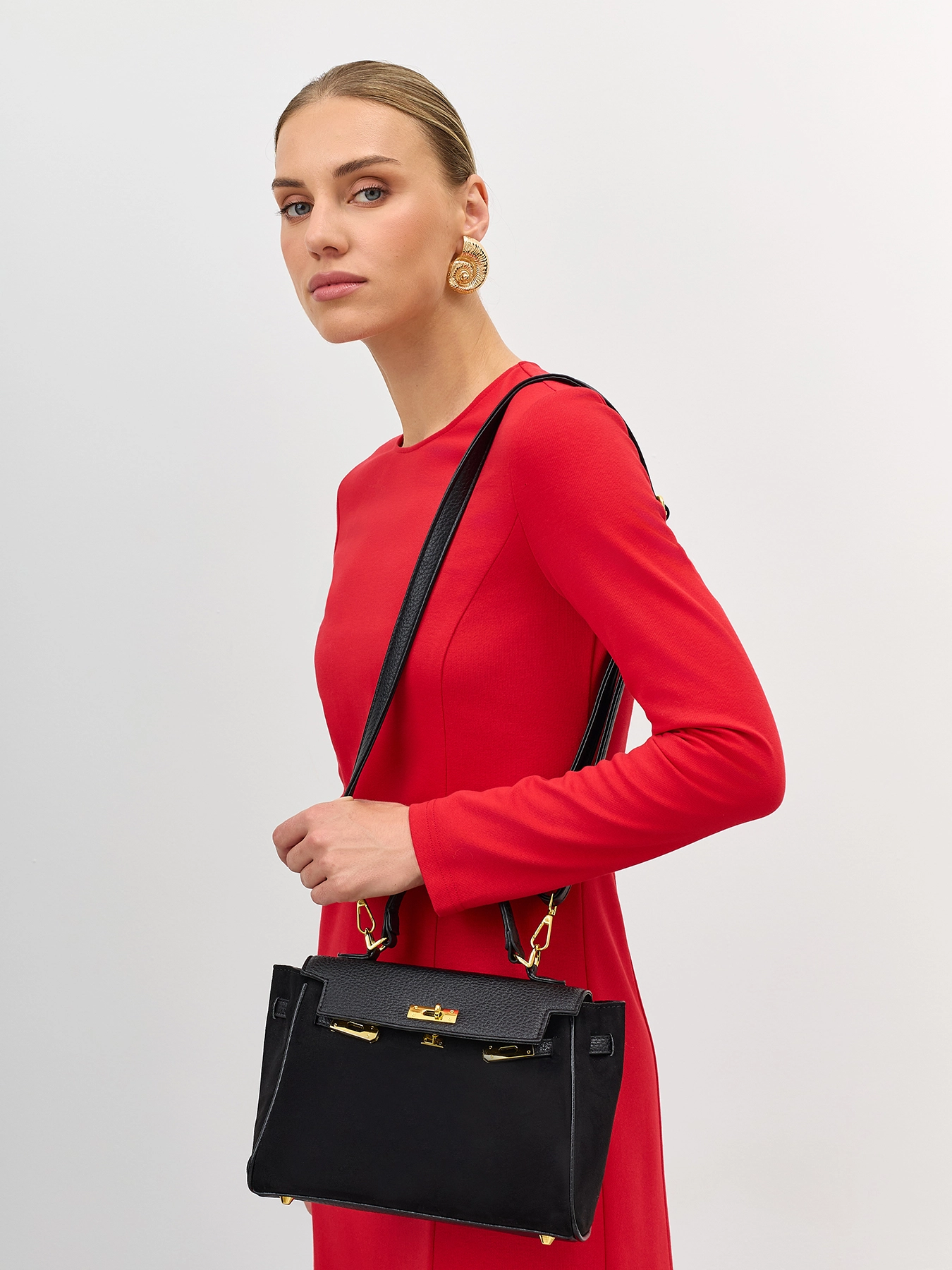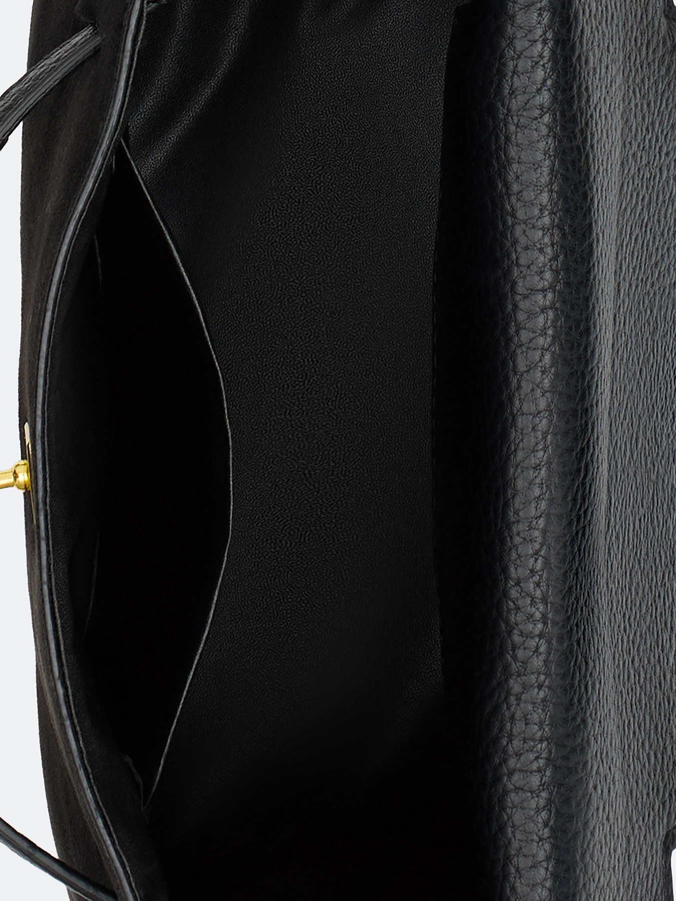 Комбинированная сумка из эко кожи и замши. Золотистая фурнитура. Одно вместительное отделение и потайной карман на молнии. Застежка на клапан с поворотным механизмом. Одна короткая ручка и длинный съемный регулируемый ремешок. Дополнена пуклями для устойчивости по низу.