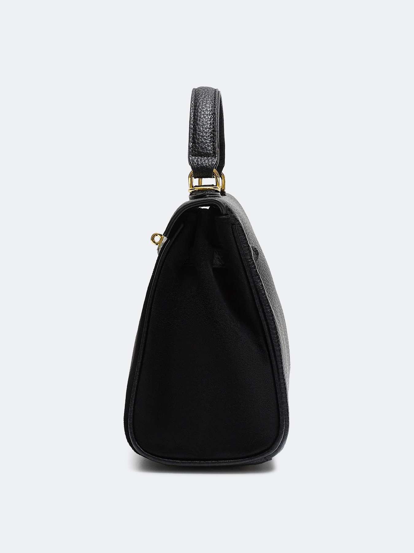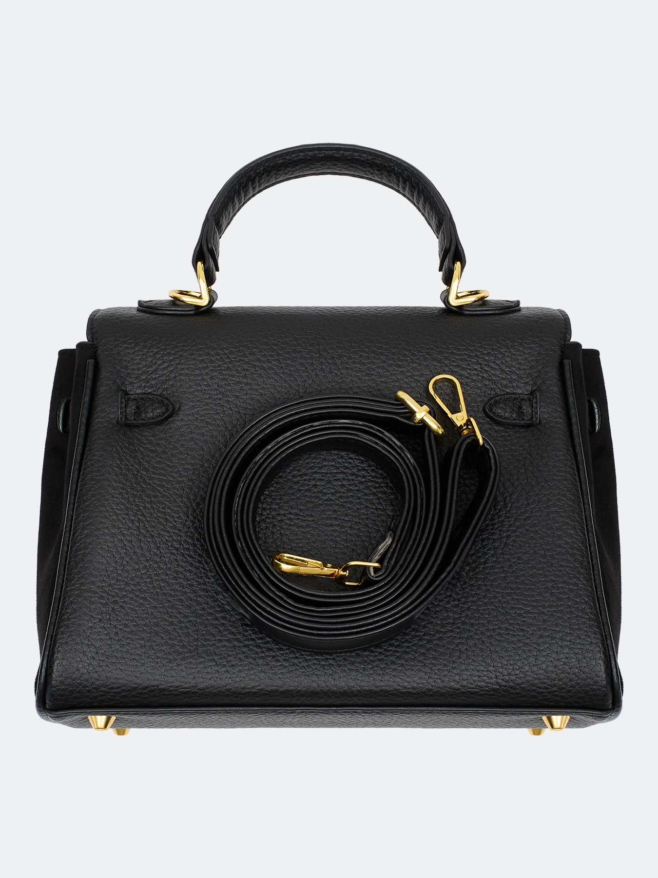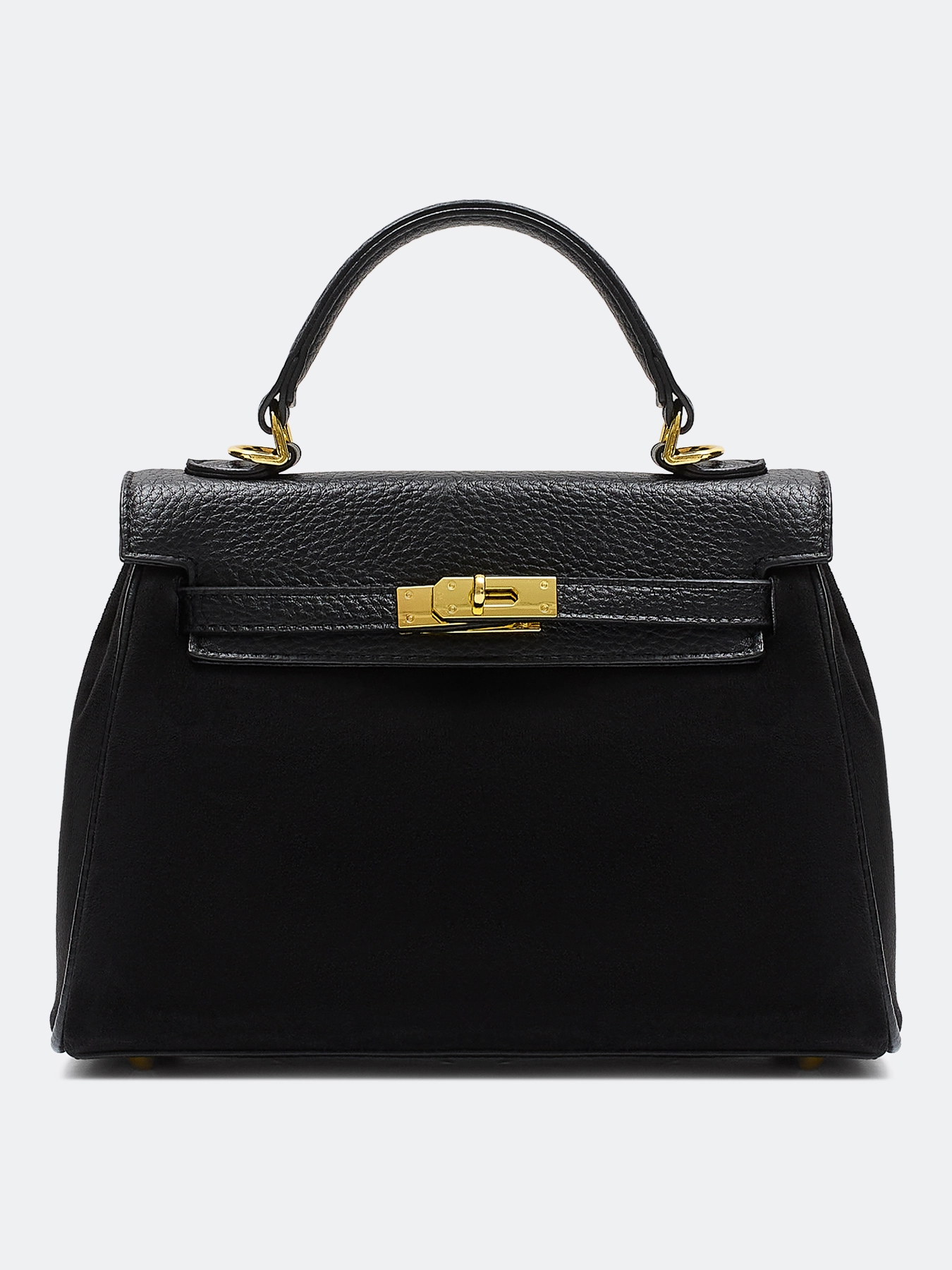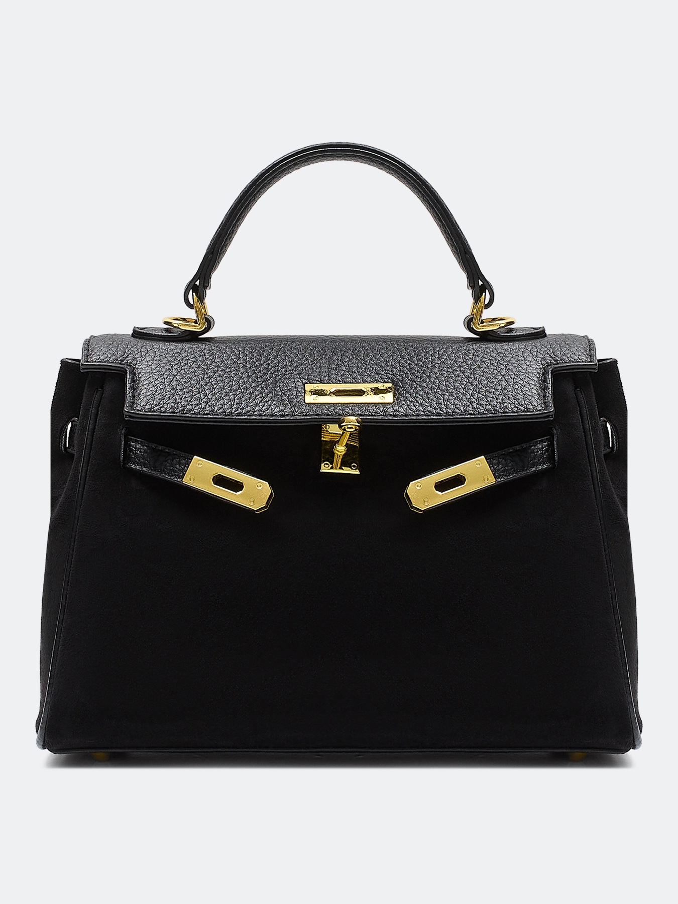 Комбинированная сумка из эко кожи и замши. Золотистая фурнитура. Одно вместительное отделение и потайной карман на молнии. Застежка на клапан с поворотным механизмом. Одна короткая ручка и длинный съемный регулируемый ремешок. Дополнена пуклями для устойчивости по низу.