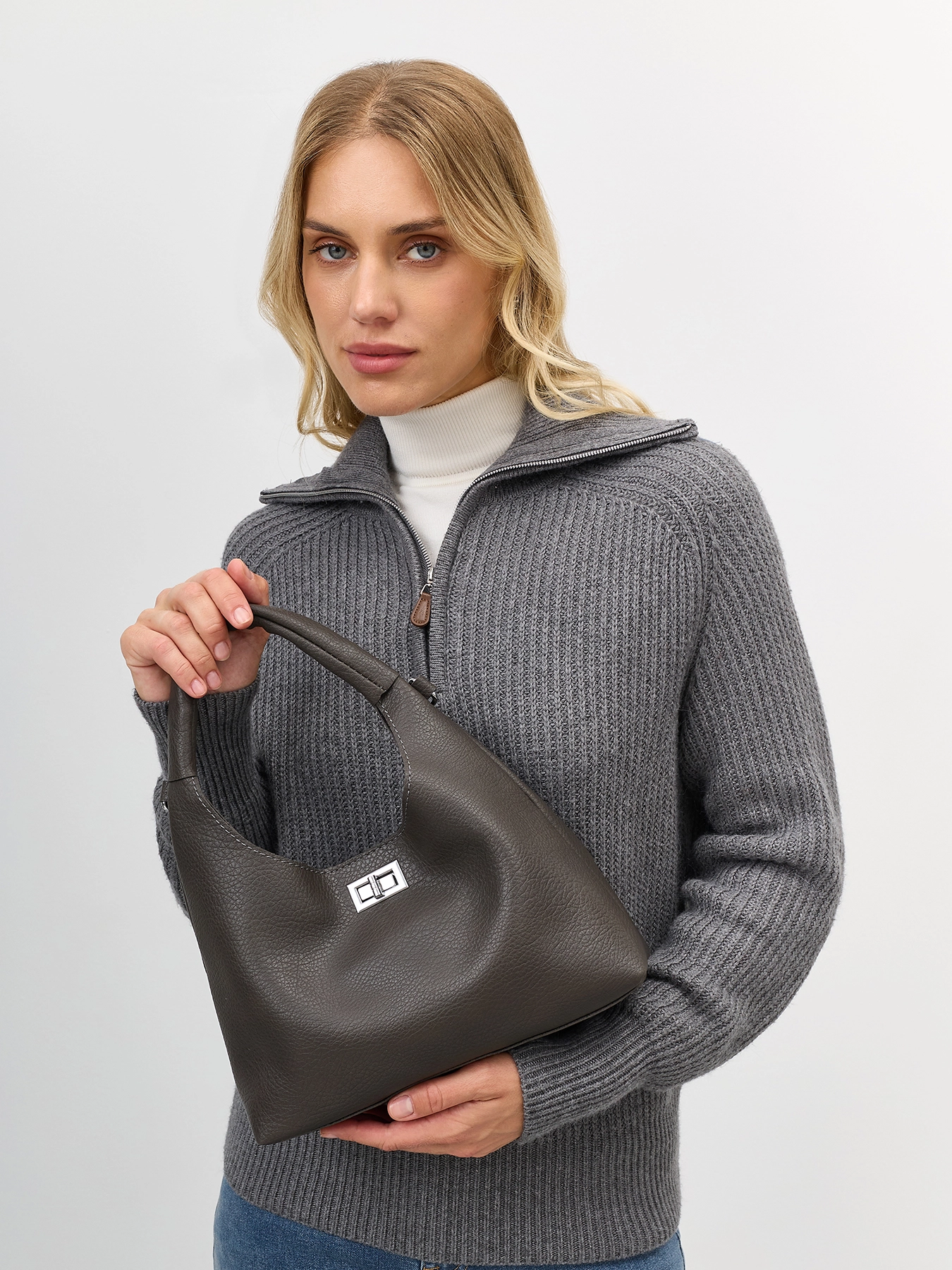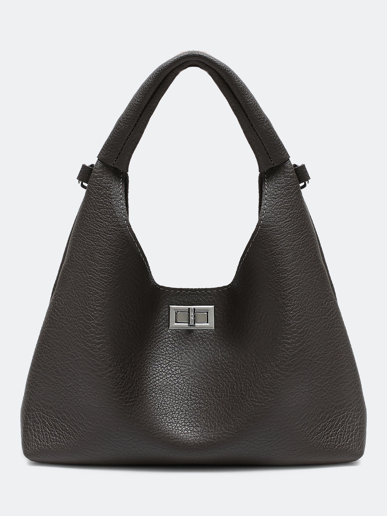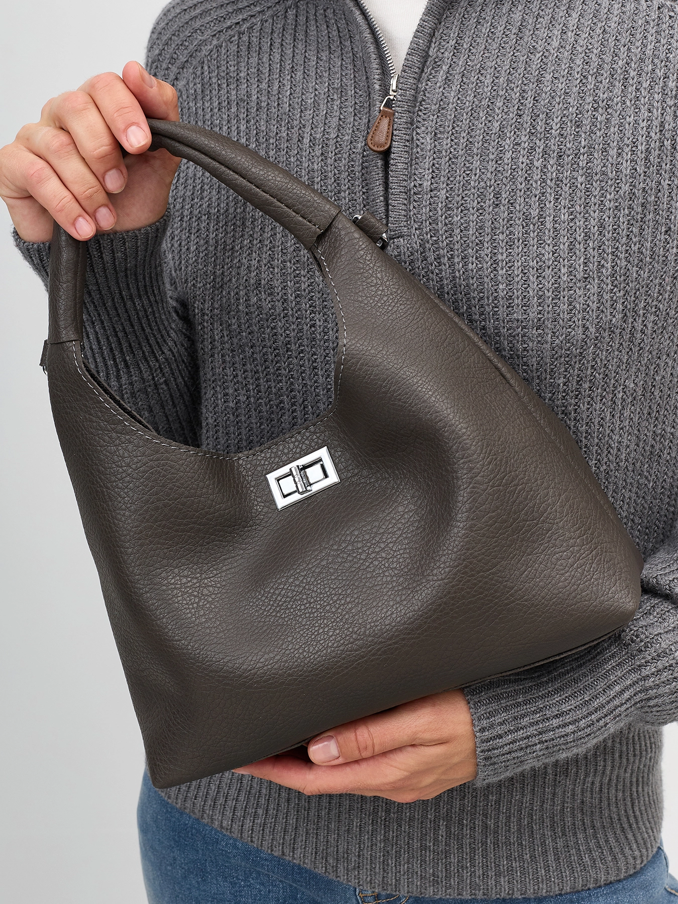 Комплект сумка с фигурной ручкой и косметичка из искусственной кожи. Одно вместительное отделение и карман. Дополнительный потайной карман на молнии. Застежка на поворотный механизм. Длинный съемный ремешок и короткая фактурная ручка. В комплекте косметичка с застежкой на молнию.
