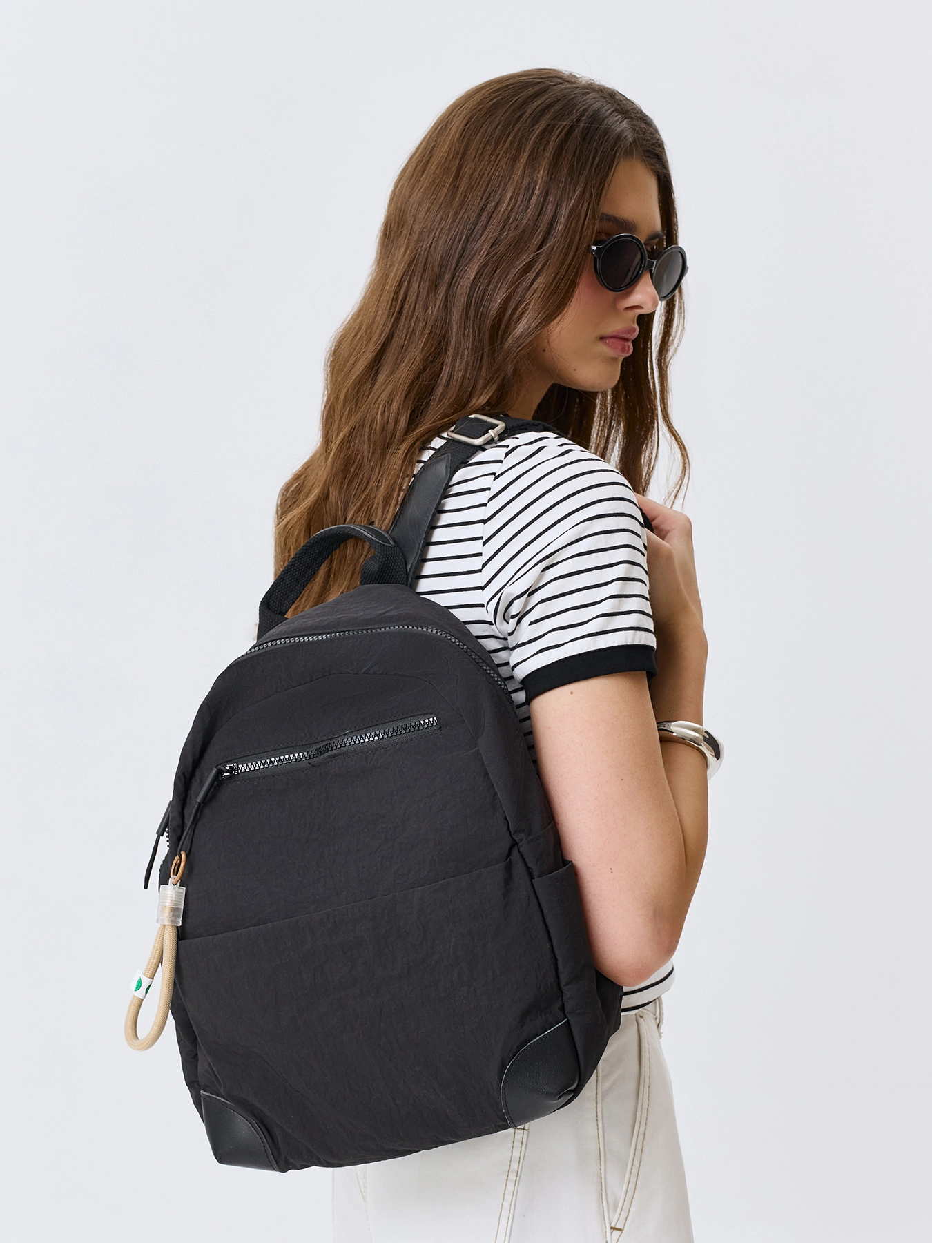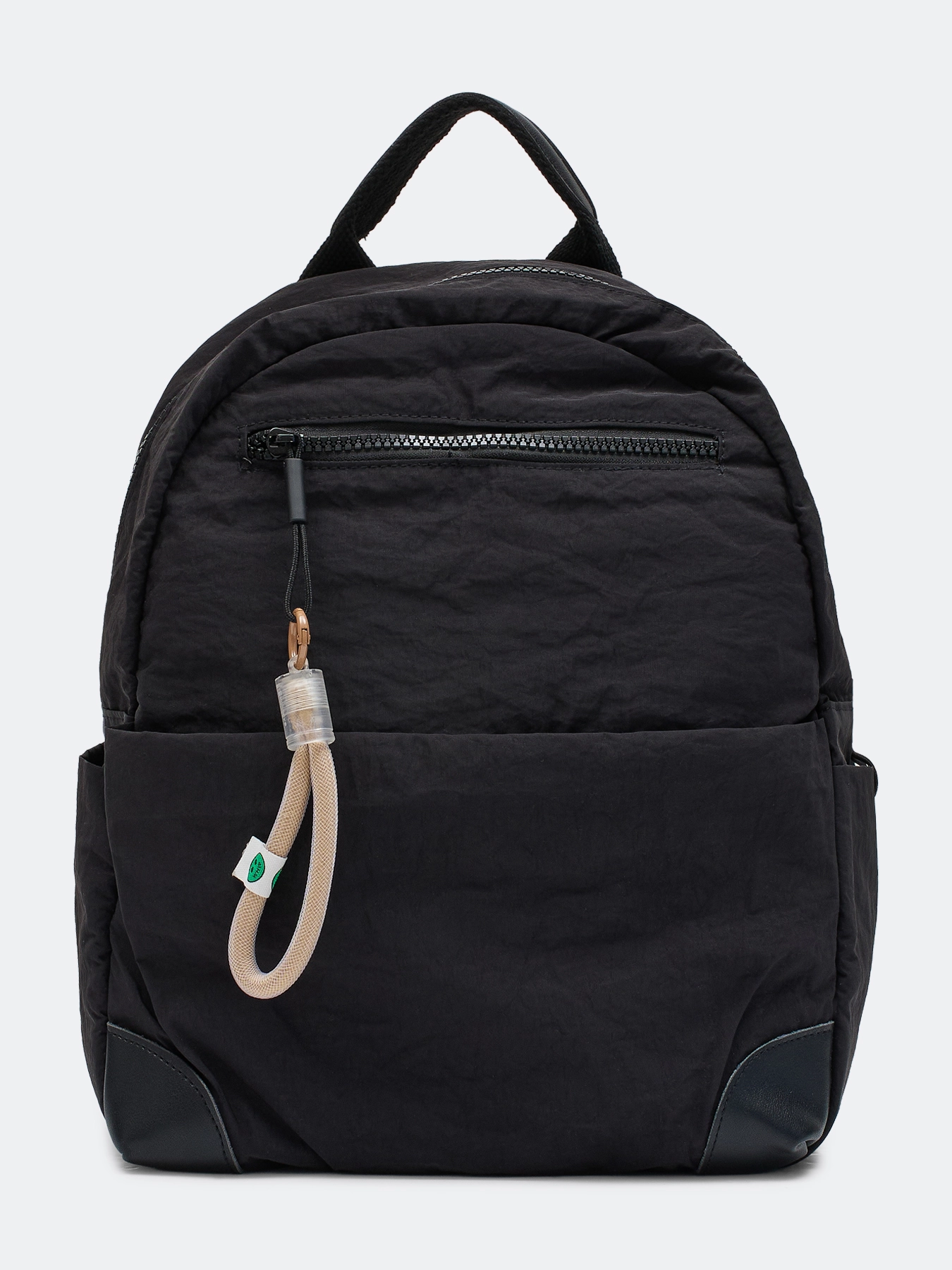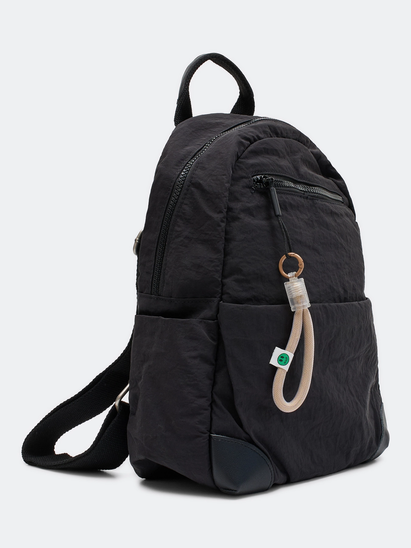 Мини-рюкзак из прочного нейлона. Короткая ручка и регулируемые плечевые ремни. Застёжка на молнию. Одно основное отделение и внешний карман на молнии. Потайной карман сзади. Декорирован съёмным брелоком. Подкладка из 100% полиэстера.