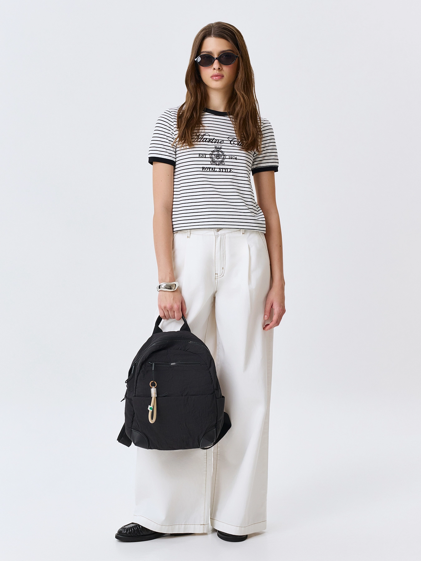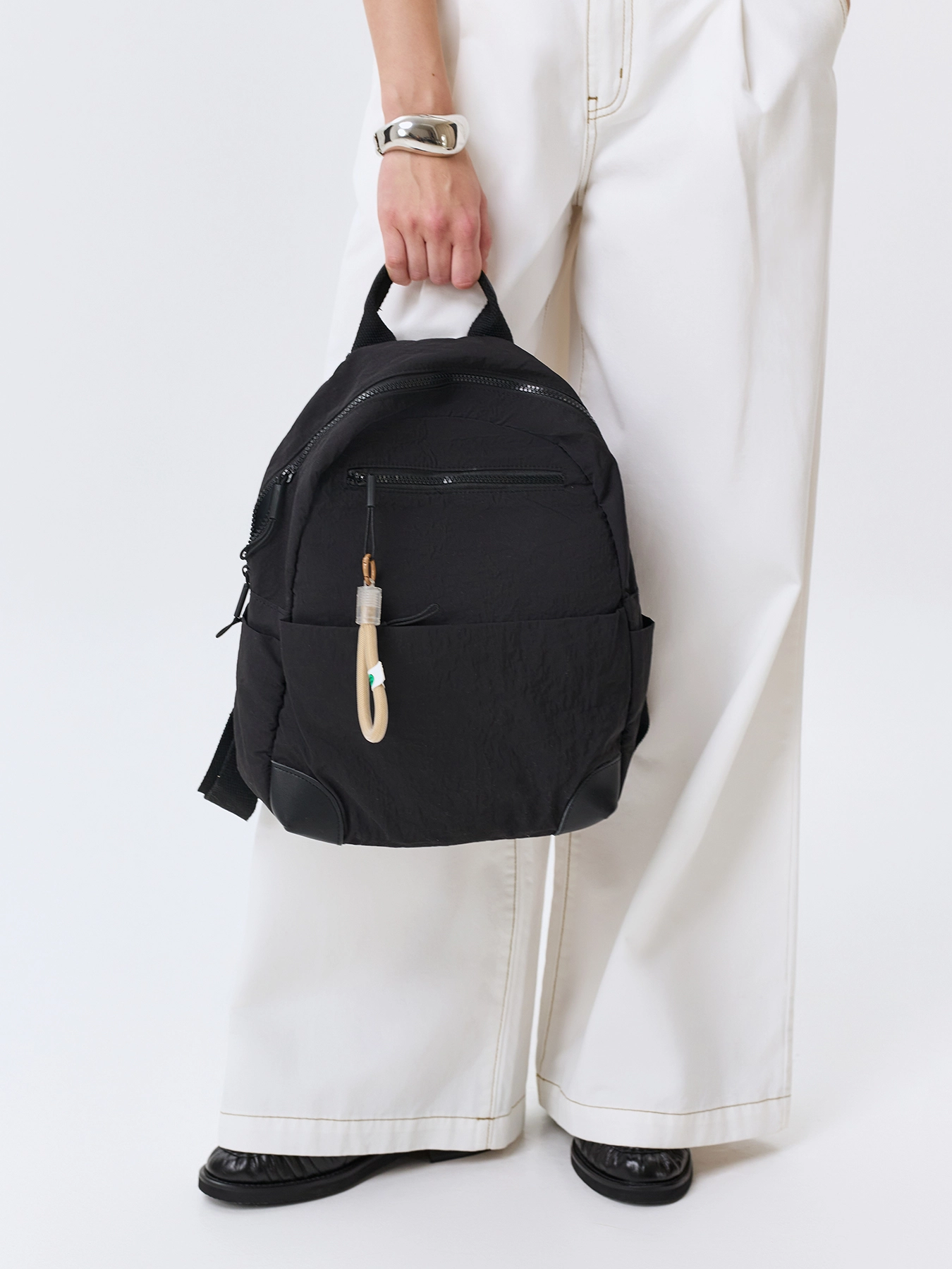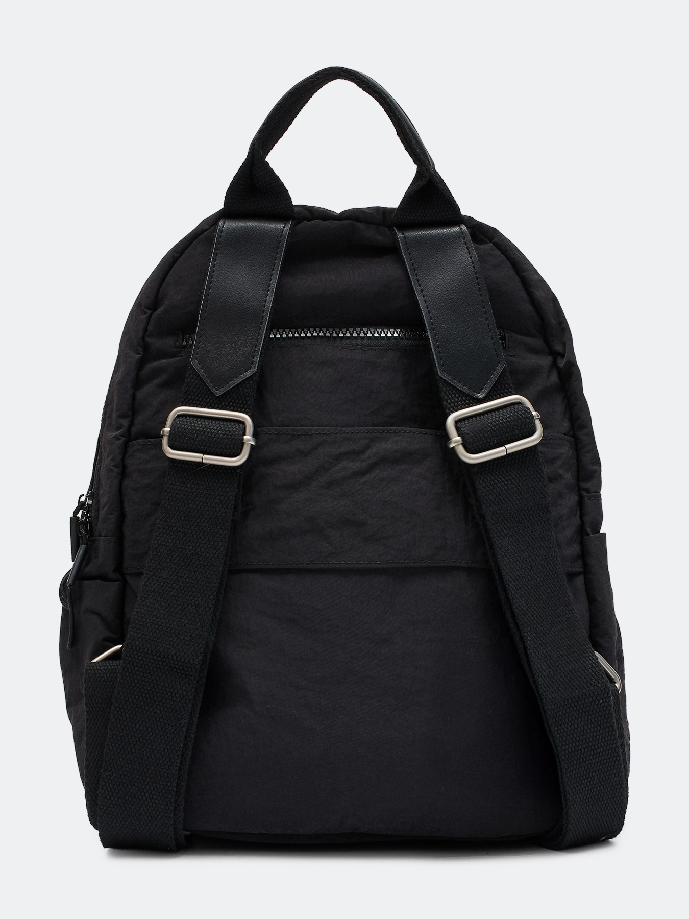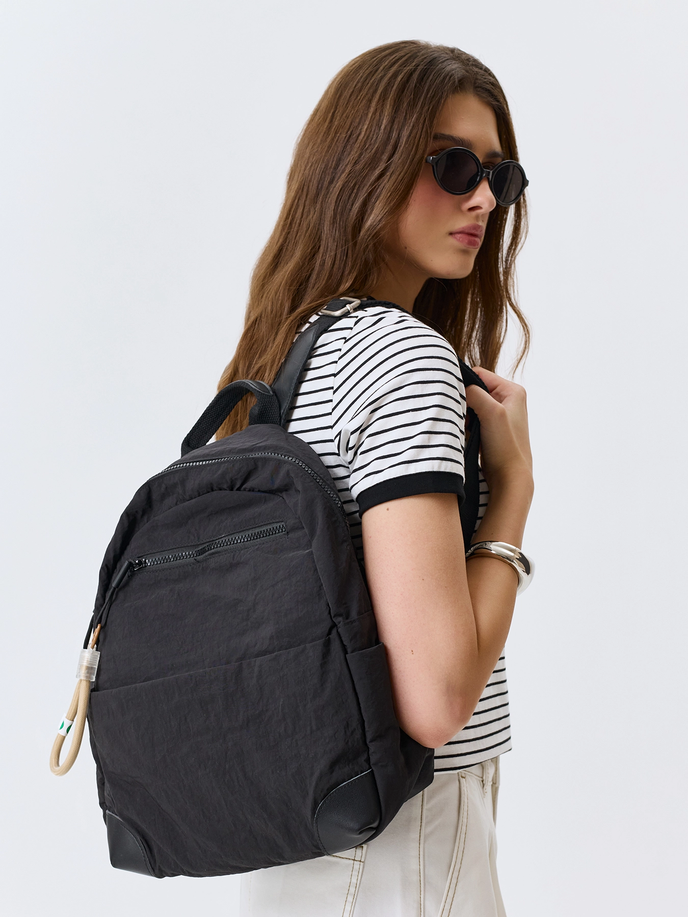Мини-рюкзак из прочного нейлона. Короткая ручка и регулируемые плечевые ремни. Застёжка на молнию. Одно основное отделение и внешний карман на молнии. Потайной карман сзади. Декорирован съёмным брелоком. Подкладка из 100% полиэстера.