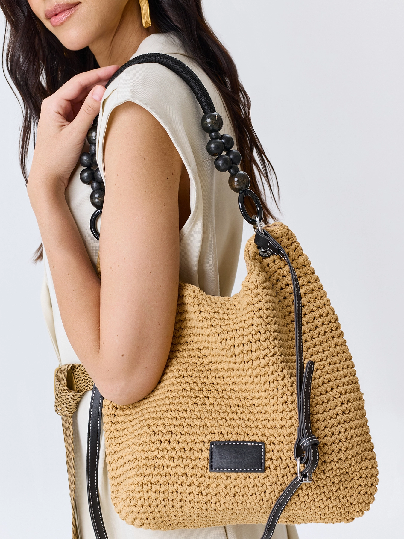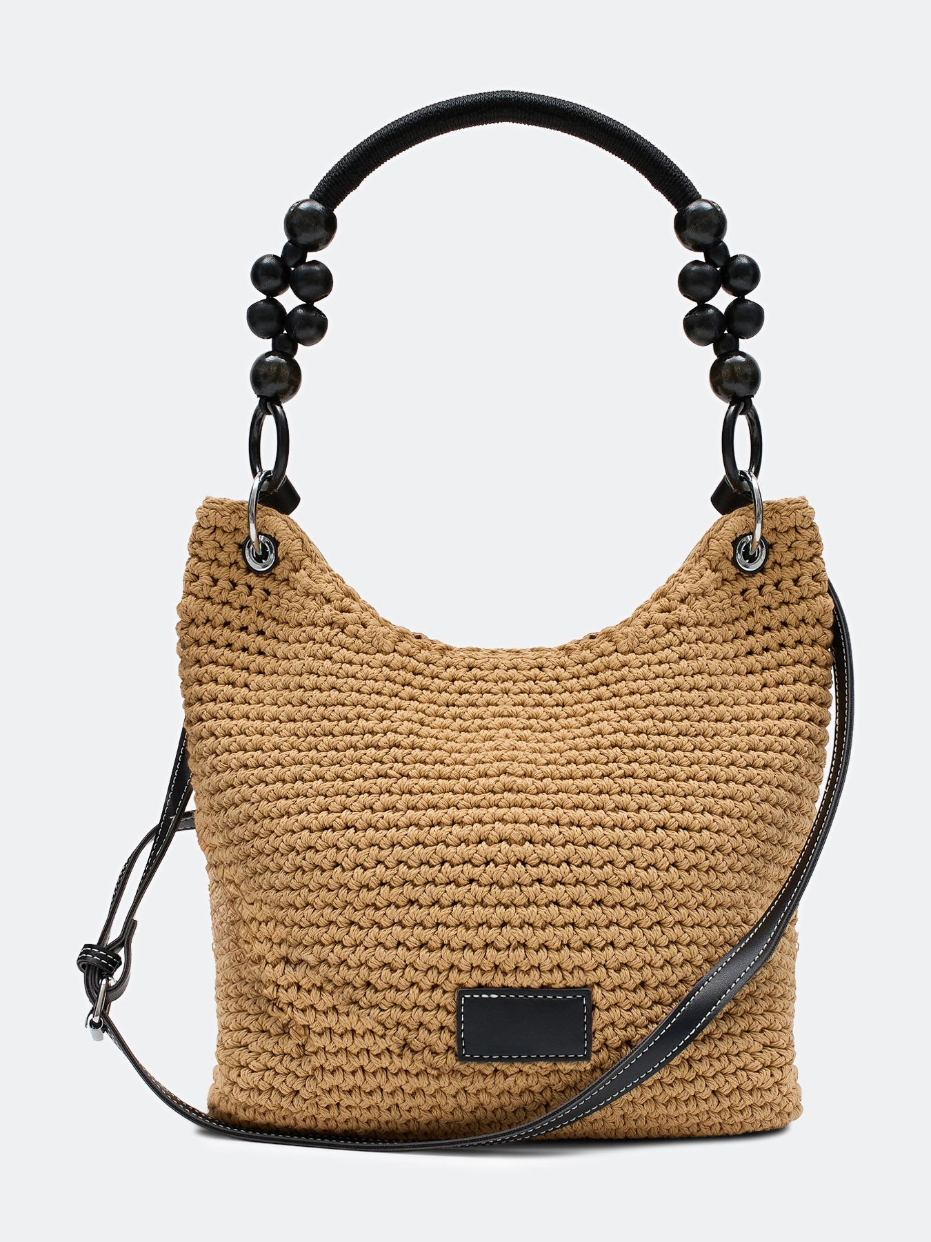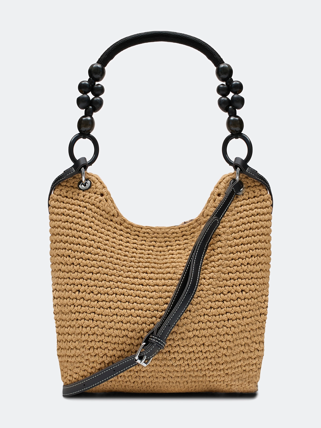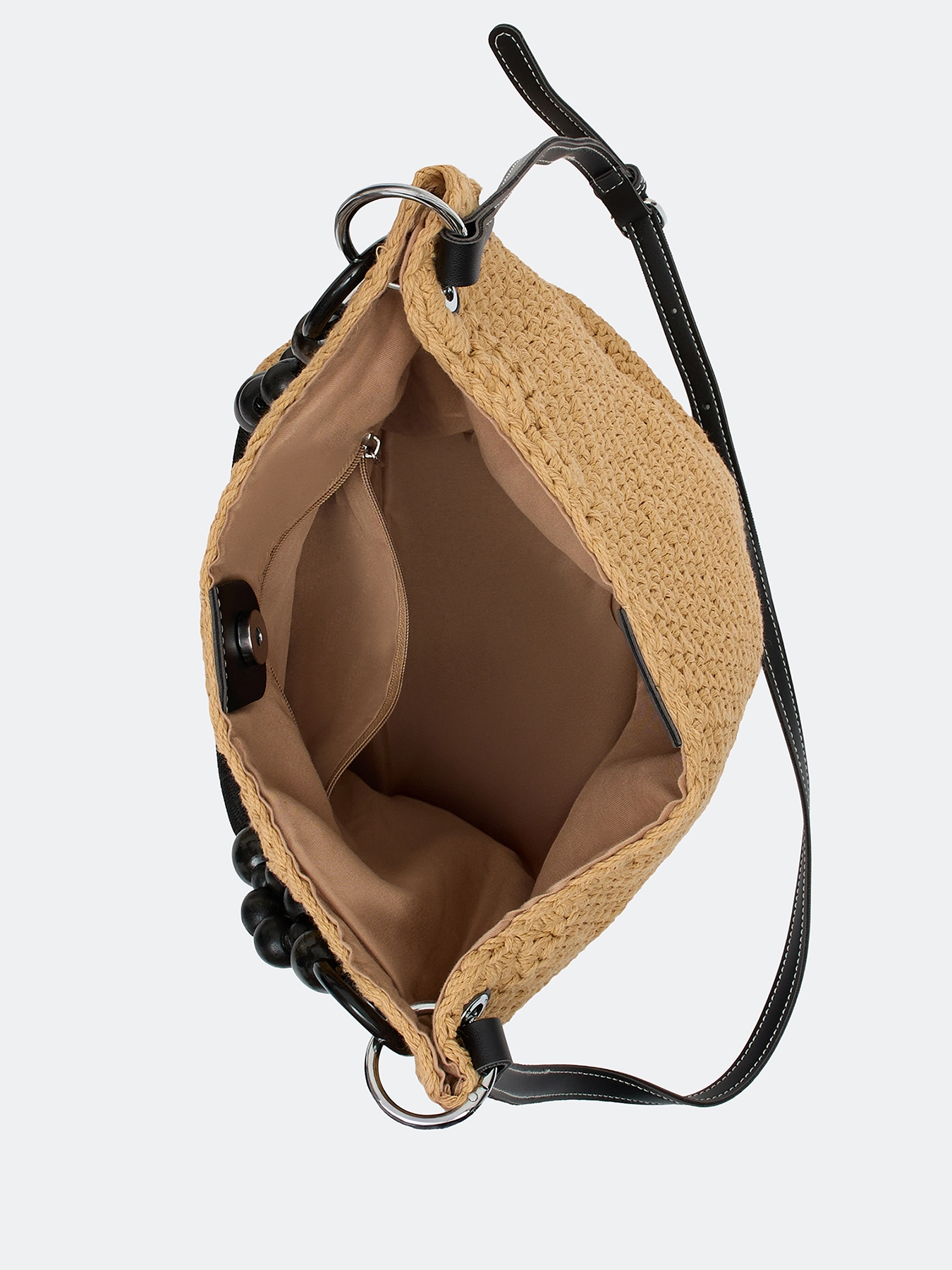 Плетеная сумка-шоппер из искусственной рафии. Мягкая форма. Одна короткая акцентная ручка и длинный ремешок. Дополнена контрастным декором. Застёжка на молнию. Подкладка из 100% нейлона.
