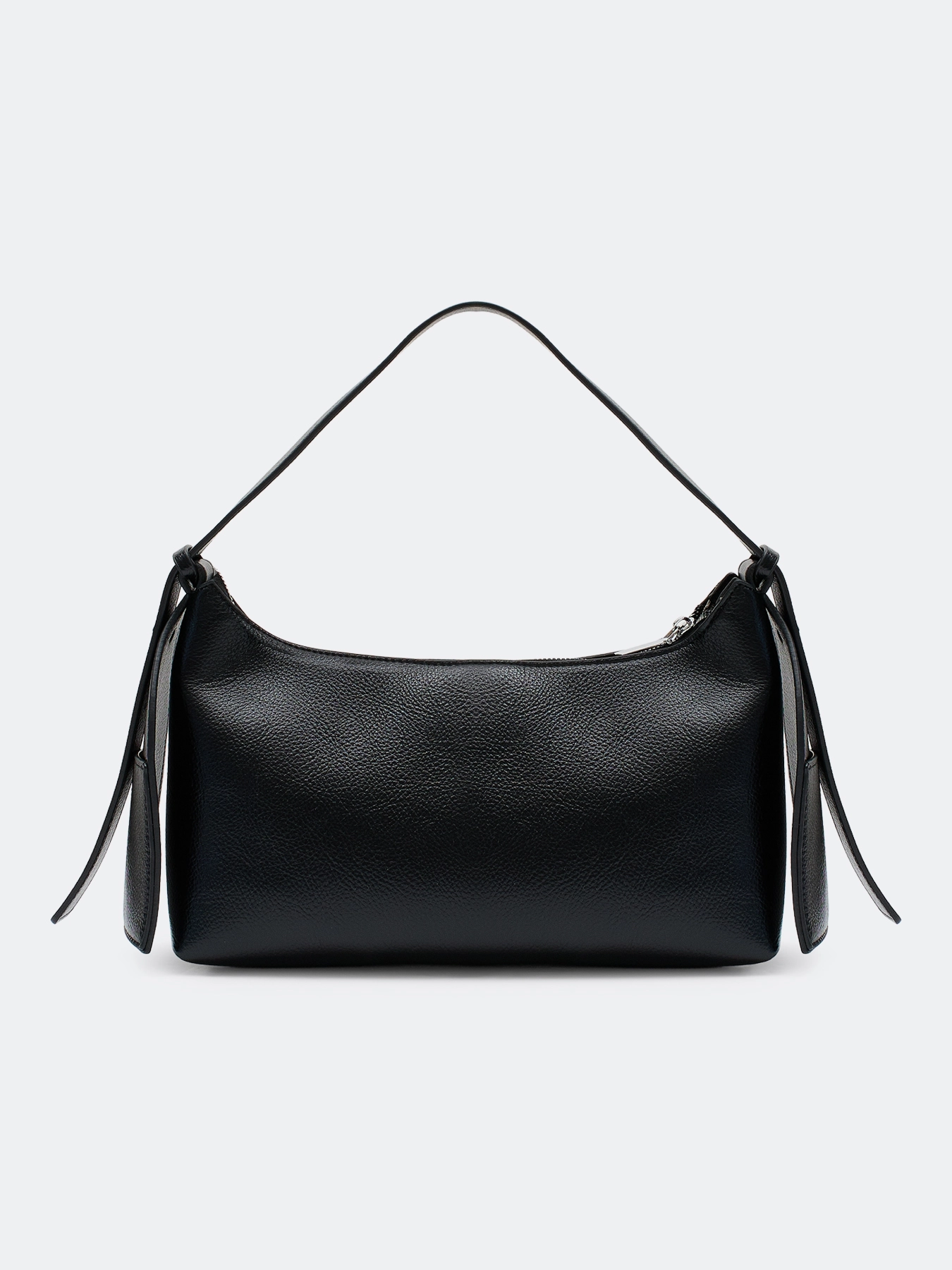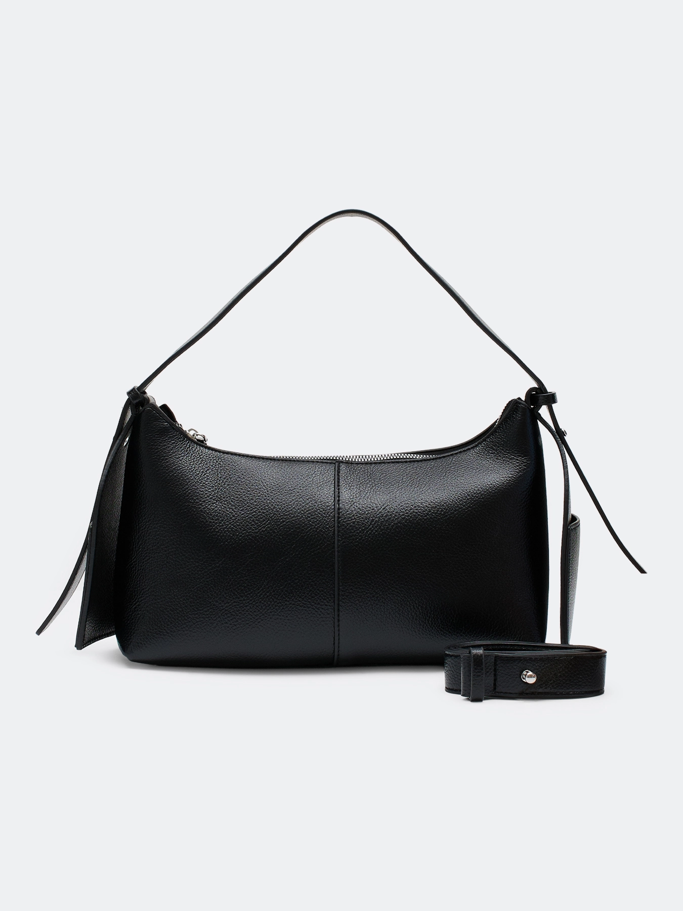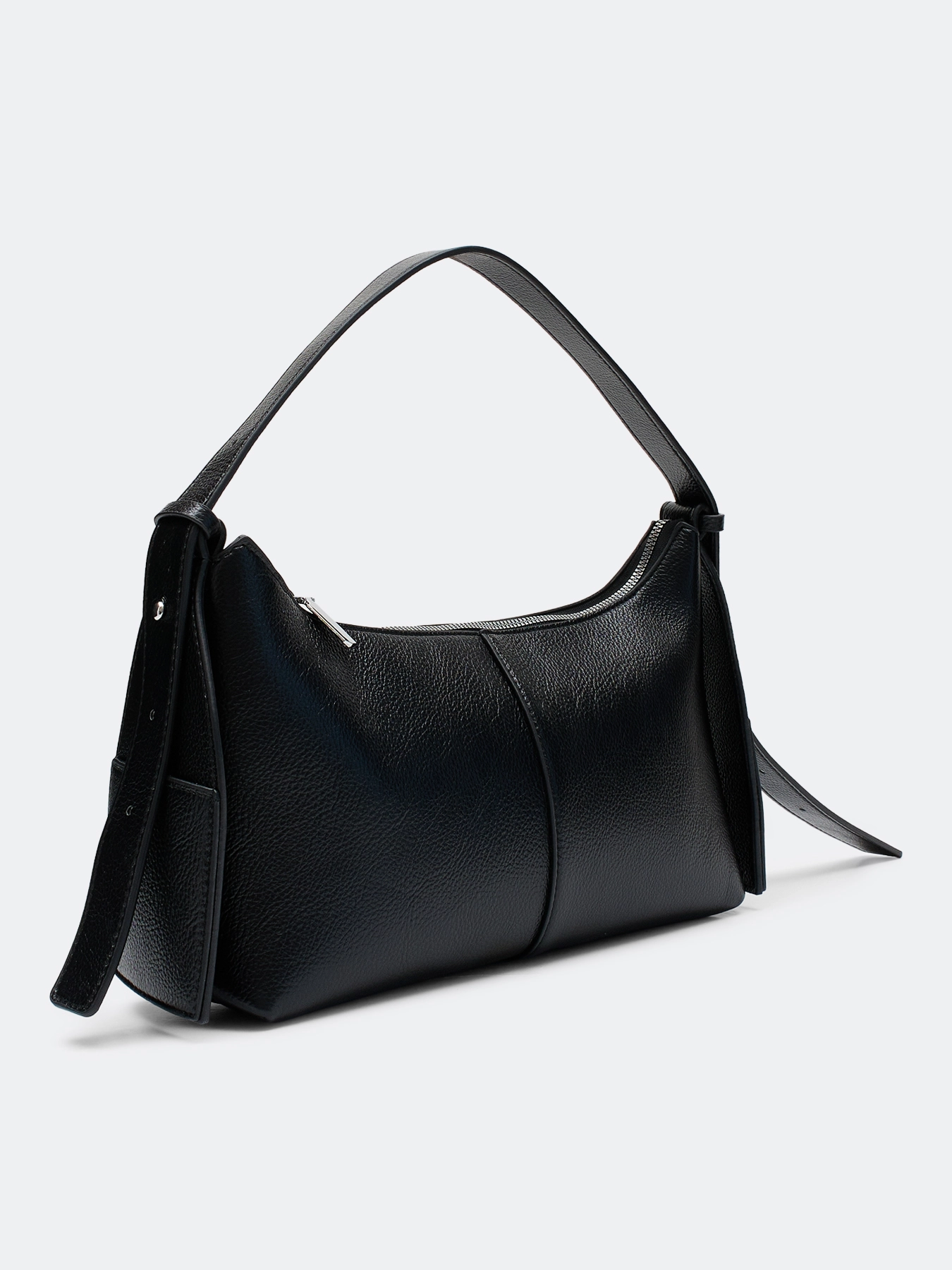 Сумка-багет из мягкой эко кожи чёрного цвета. Короткая ручка и длинный регулируемый ремешок в комплекте. Одно основное отделение на молнии. Подкладка из 100% полиэстера.